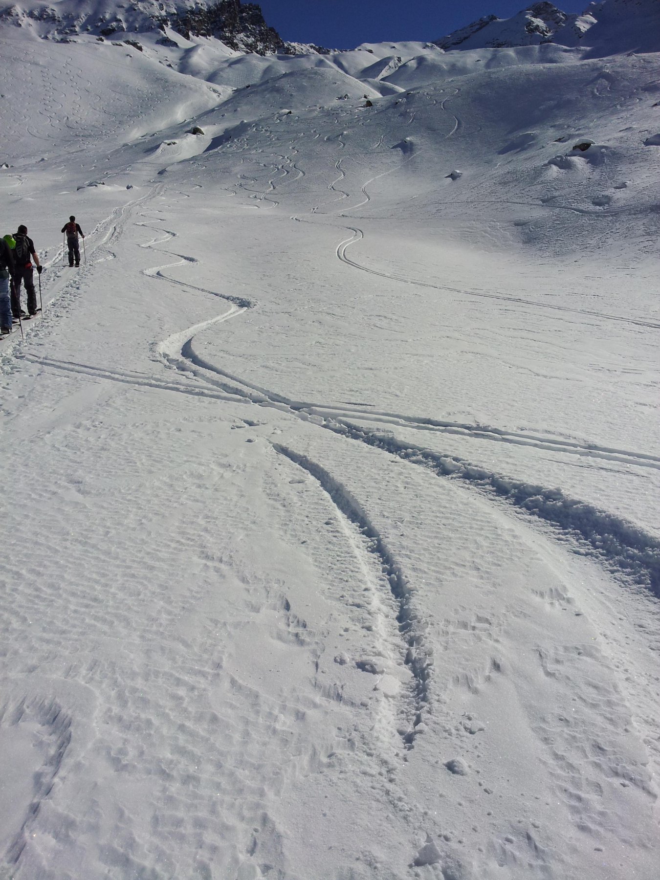 Per la discesa le 4 stelle sono una media tra le croste e il tritato della parte alta e del bosco, e la splendida polvere del vallone centrale.