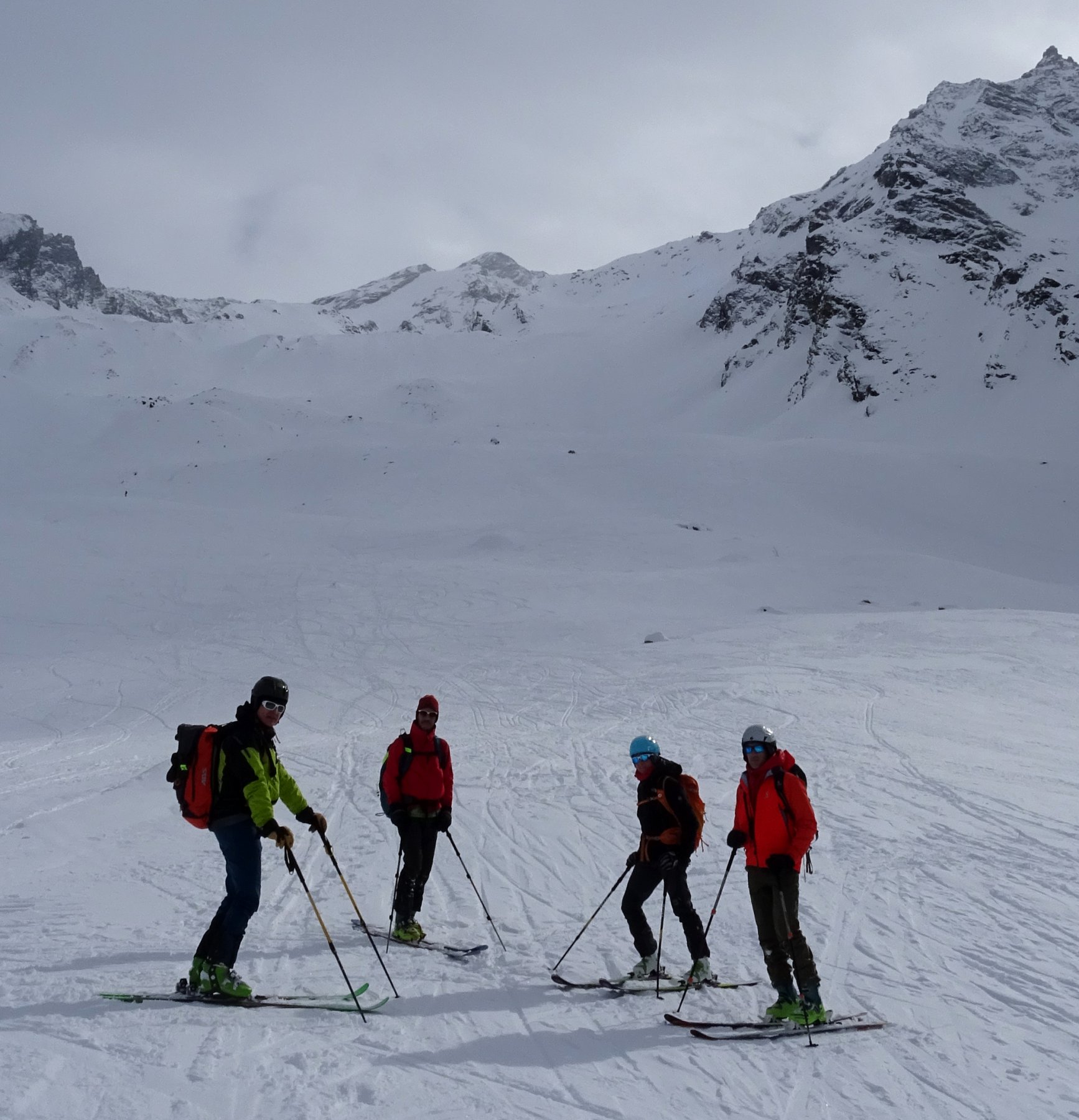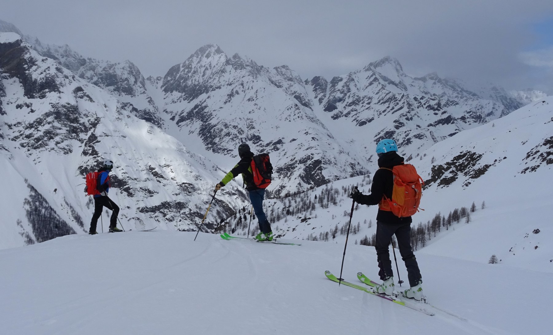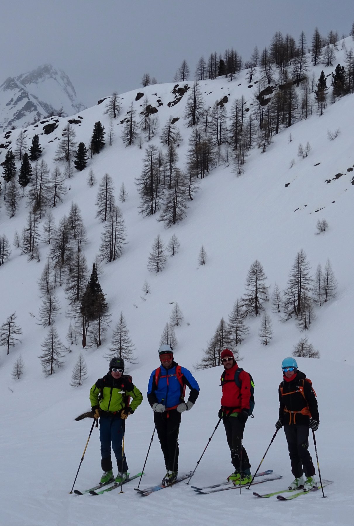 Gli ampi spazi ci hanno permesso di tracciare linee nuove per gran parte della discesa, caratterizzata da neve farinosa nei 2/3 alti, un timido accenno di crosta nella sezione pianeggiante (breve comunque) e misto farina / crosta portante nel bosco.
