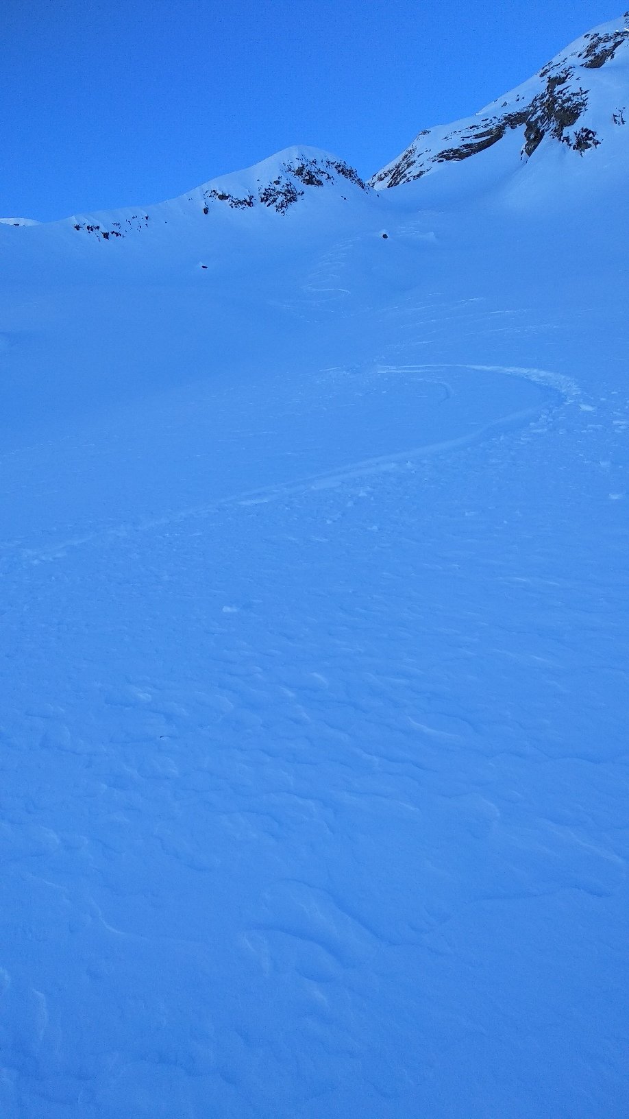 È già scesa la grossa valanga in sx orografica del vallone. Nei primi 300 m di dsl in discesa bisogna cercare la neve con la superficie più ruvida per poter fare belle curve; altrimenti, dov’è liscio la neve è stata compattata dal vento. Dalla “sale a manger” fino ai 2.500 m, bella neve farinosa. Tra i 2.500 ed i 2.300 m, crosta difficile da sciare. Sotto i 2.300 m, neve dura portante. In discesa, per non spaccare sci e ossa, i legni si riescono a togliere 150 metri sotto la croce. Da qui in giù, si scende a piedi sul sentiero parzialmente innevato.