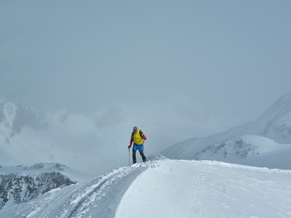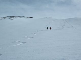 Giornata fredda, non prevedo un peggioramento della qualità della neve, un centinaio di skialper sul percorso, che non sono sufficienti ad arare completamente i larghissimi pendii del vallone.