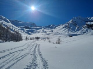 Nel bosco solo 3 dita di neve fresca polverosa, su abbondante strato vecchio, portante ma non duro. Traccia autostradale. Uscito dal bosco, le condizioni mutano: difficile capire quanta sia la neve fresca, perché non c’è distinzione con quella più vecchia, secca e farinosa anch’essa. In totale comunque si va dai 30 ai 50 cm di neve polverosa e leggera. La gita è già stata tracciata ieri da una 15cina di scialpinisti. Meno male, perché nell’effettuare alcuni sorpassi mi rendo conto di quanto deve essere stata dura tracciare, con la neve sopra il ginocchio. Oggi almeno 40 scialpinisti, che sorpasso quasi tutti, meno i 6 che erano partiti all’alba.
