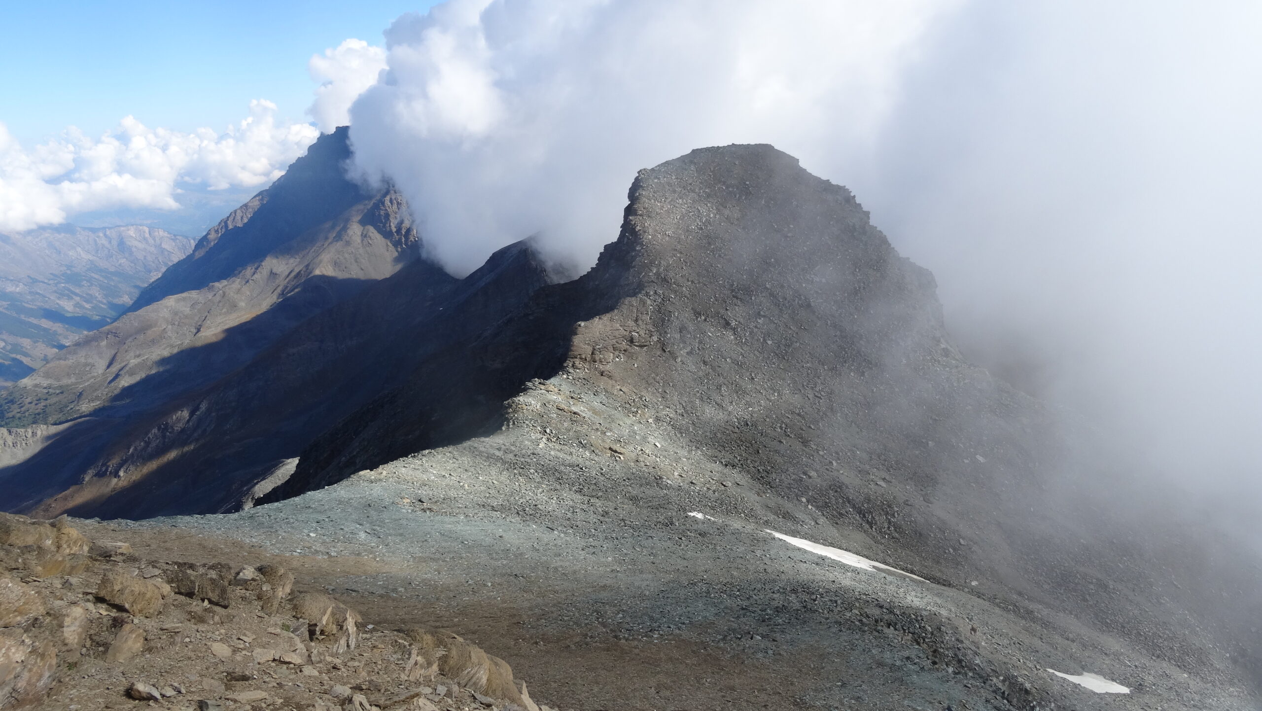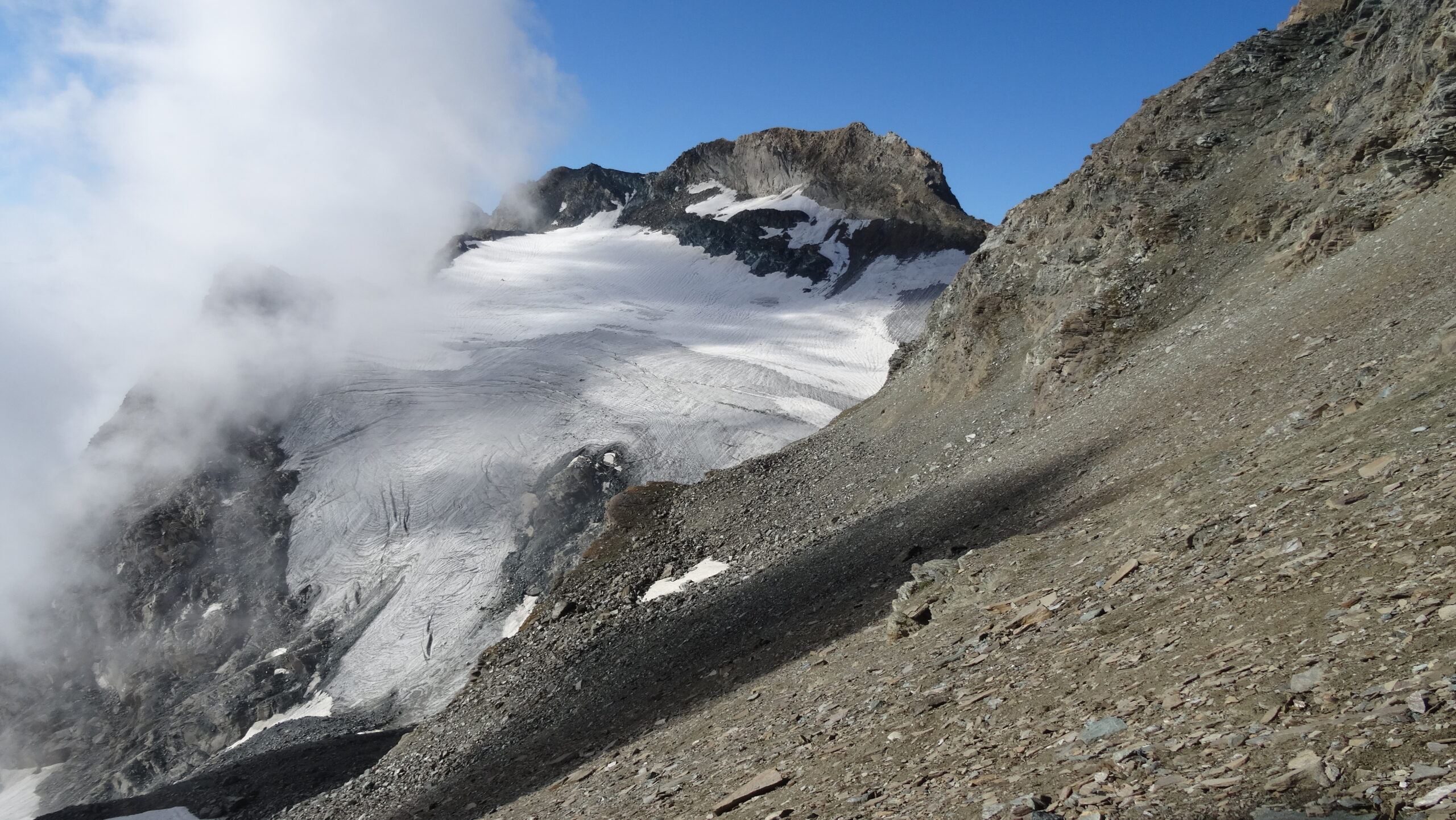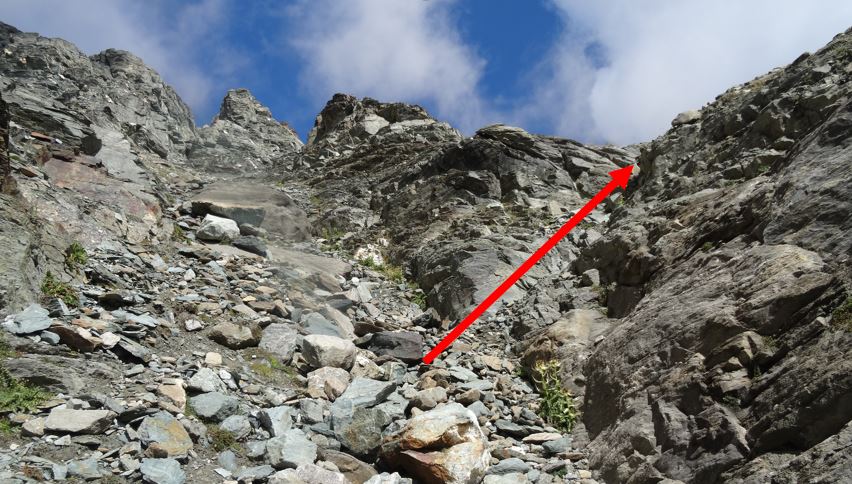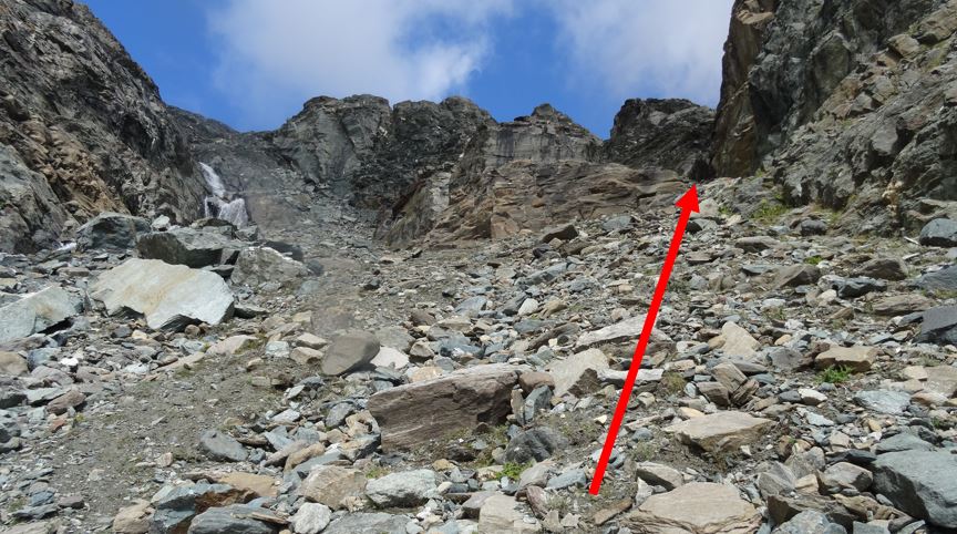 In salita sono stato sull’argine sx del ruscello perché mi sembrava si calpestassero meno pietre salvo poi attraversarlo per portarmi nel canale di dx per poi risalire quasi subito a dx per arrivare su una dorsale ben omettata che porta, su ripida traccia, più terrosa che pietrosa, sino ad un traverso alto da cui si è sopra la base del ghiacciaio e del relativo ruscello. Qui la parte che ritengo più difficile nelle condizioni odierne (sopra tutto ok), ovvero il passaggio su una cengia che non fa perdere quota dove però il terreno è fangoso e le rocce sono un po’ aggettanti (penso si possa comunque scendere di qualche metro verso il ruscello e poi risalire per evitarla). Fatto questo passaggio si arriva ad un nevaio (aggirabile) che ho sfruttato (scarpette) per arrivare all’inizio della salita verso il colle che presenta ometti e tracce (sempre ripide) prevalentemente su terra e non su pietre.