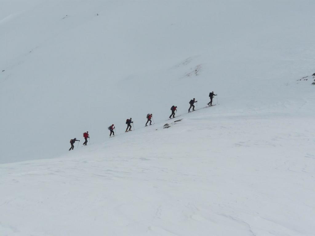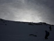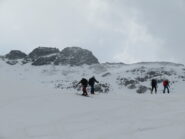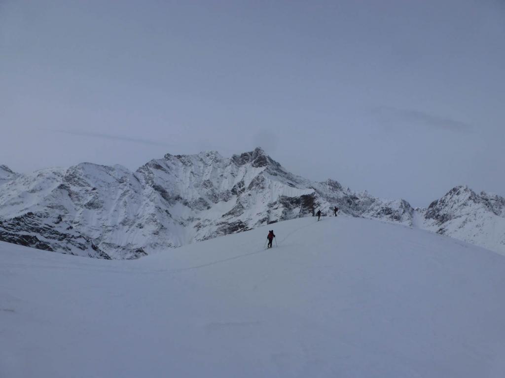 Sullo sfondo è ben visibile il colle di Sort e più a destra i bei pendii che conducono alle Cime de Gollien. Si risale sulla destra un vallone un pò più ripido sino a sbucare in una piccola conca e con un traverso verso destra raggiungere il Col Gollien e successivamente la punta.