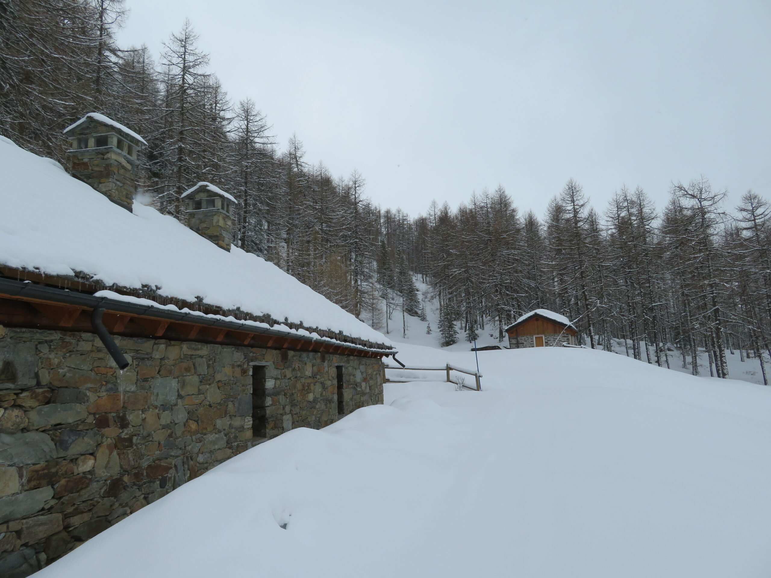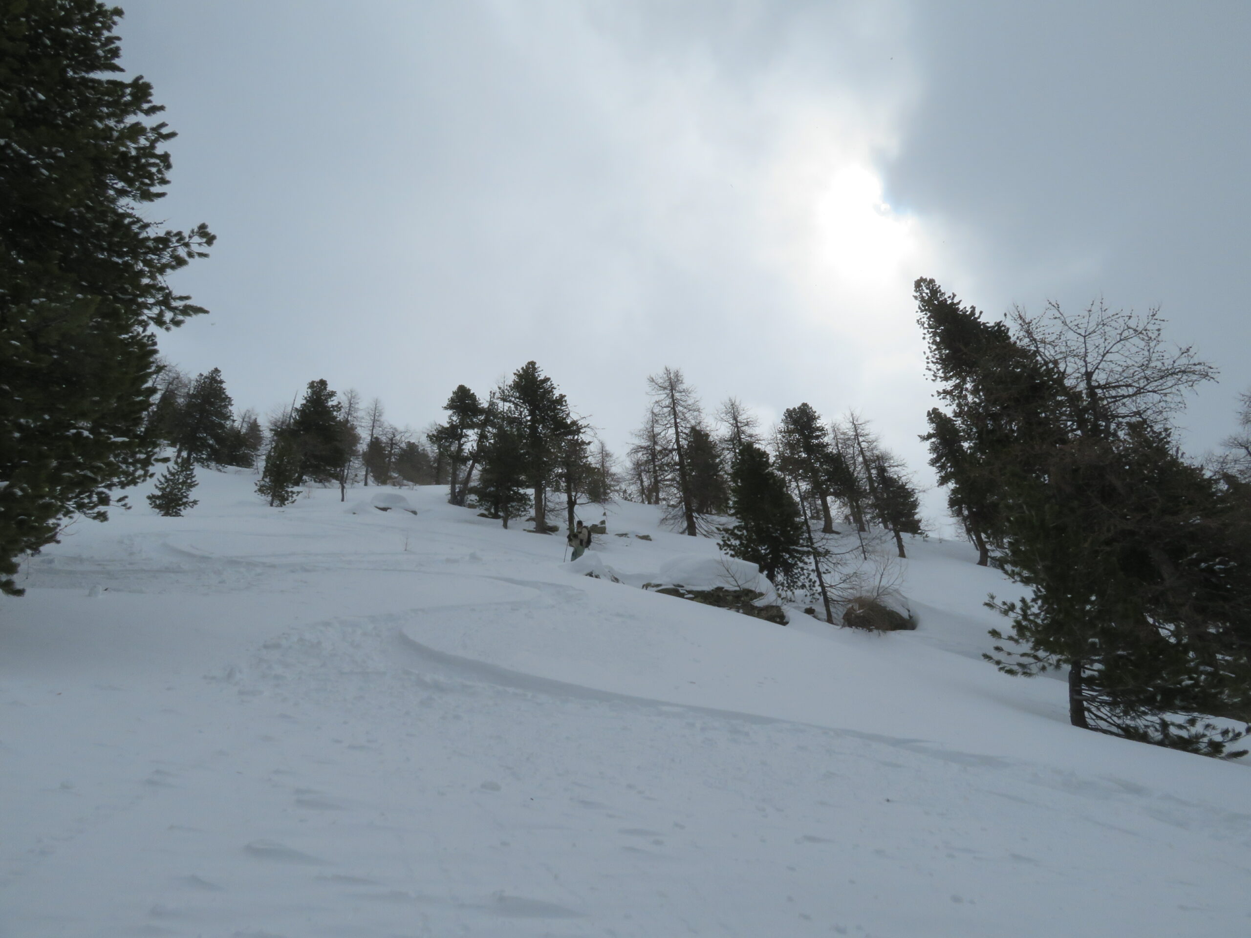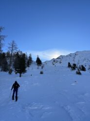 Il tracciato prosegue tra gli alberi in mezzacosta sino a risalire più ripido verso destra. Si sbuca così nei pendii superiori meno ripidi e con pochi alberi. Si lascia a sinistra la casa dei guardaparco e si prosegue lungo ampi pendii.