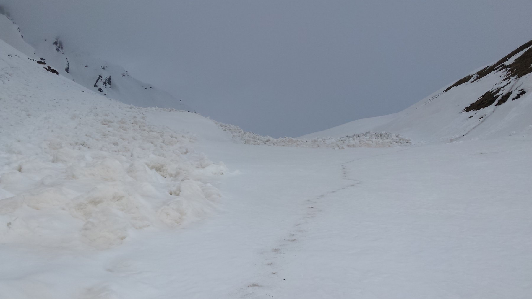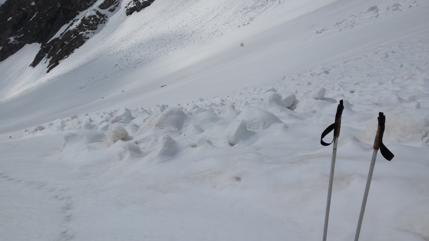 Solo 5/6 macchine oggi a Crevacol. Si cammina per qualche minuto prima di mettere gli sci. Condizioni di innevamento buone. Alcune valanghe a grossi blocchi sono scese dal Creton du Midì. Dai pendii della cima si sono staccate già diverse placchette ed un paio di “bocche di balena” sono ben visibili. Ho proseguito fino al colletto 2775. In alto neve ben rigelata e portante. In basso la neve fortunatamente non ha ben rigelato durante la notte. Dico “fortunatamente” perché il manto è molto “‘a crateri” : con neve dura qui si salterebbe parecchio.