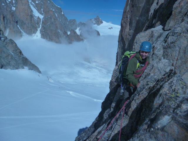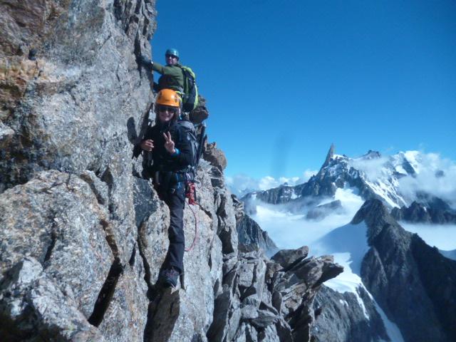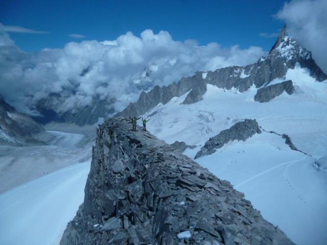 giornata in parte accedemica effettuata con A. Trombetta; finalmente una giornata “estiva”; crepacci visibili, uno solo “infido” (in quanto poco evidente) nell’avvicinamento alla cresta, comunque si è lasciato individuare; cresta facile nella parte iniziale, poi via via più diffcile, infatti aumenta man mano la presenza di ancoraggi e soste; a memoria direi 3 in tutto i punti più difficili (a stima siamo comunque intorno al terzo grado) un paio invece passaggi tecnicamente facili ma su cresta affilata ed esposta; nel complesso giro veloce, così che anzichè rientrare dal percorso di andata, abbiamo inserito l’Aiguille de Toula e discesa quasi al col de Flambeaux