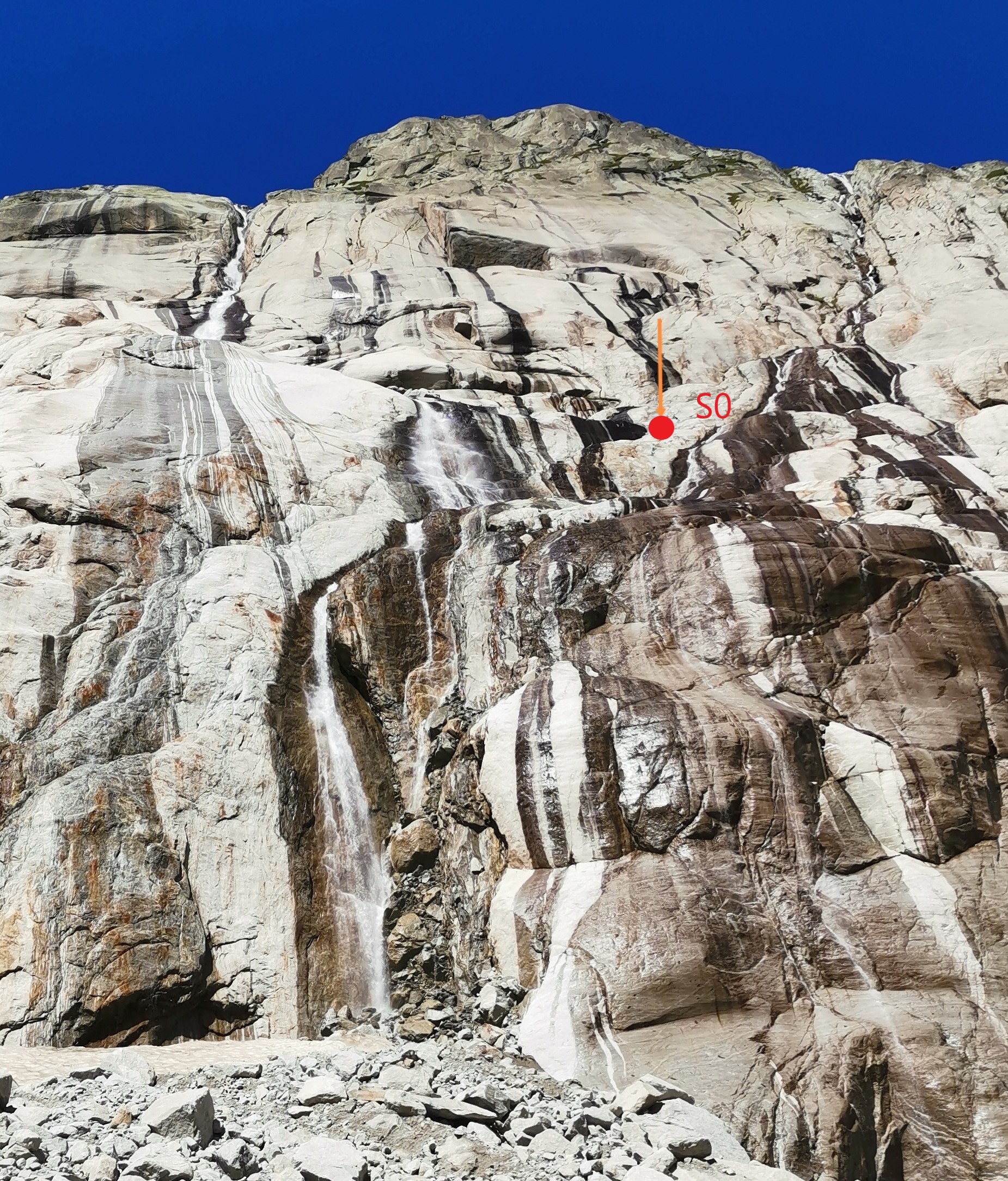 Risalire il ghiacciaio della Mer de glace, passare le scale che portano al rif.Envers e continuare come per andare al rif. Requin…La parete si trova sulla vs. destra…(lasciare il ghiacciaio prima che inizino i grossi crepacci)…La via attacca a pochi metri dal ruscello in corrispondenza di un grande tetto evidente che caratterizza il settore principale Dalles inférieures de l’Envers