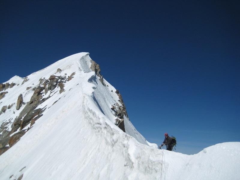 Si percorre prima il lato sx (orografico) del ghiacciaio e in corrispondenza dell’ampia curva che il ghiacciaio compie verso destra portarsi sulla dorsale di morena che corre parallela alle pareti rocciose del versante Est della Mer de Glace.
