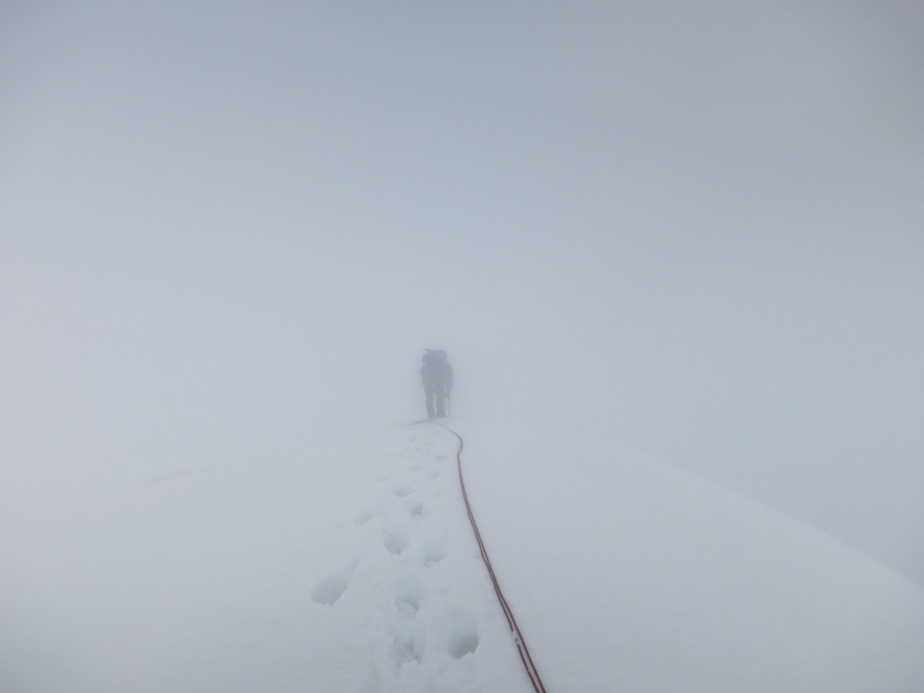Giunti in vista din un grande quadrato giallo in mezzo alla parete, piegare decisamente verso la base delle rocce attraversando i residui glaciali nel punto più agevole per evitare ruscelli e crepacci di superficie.