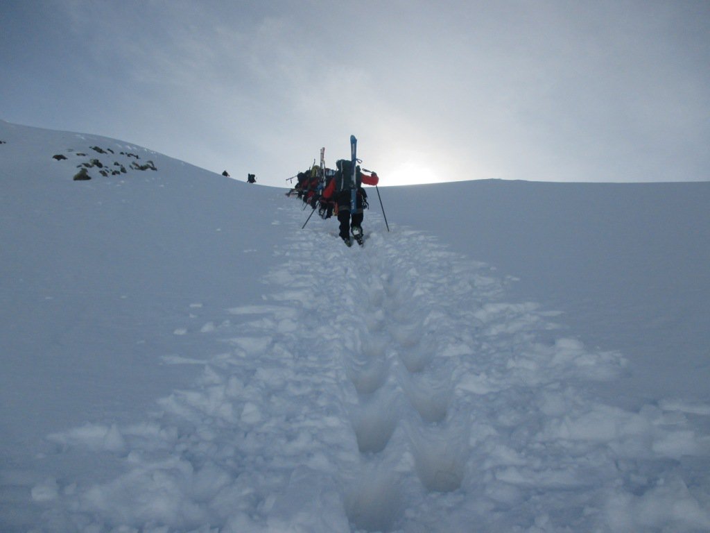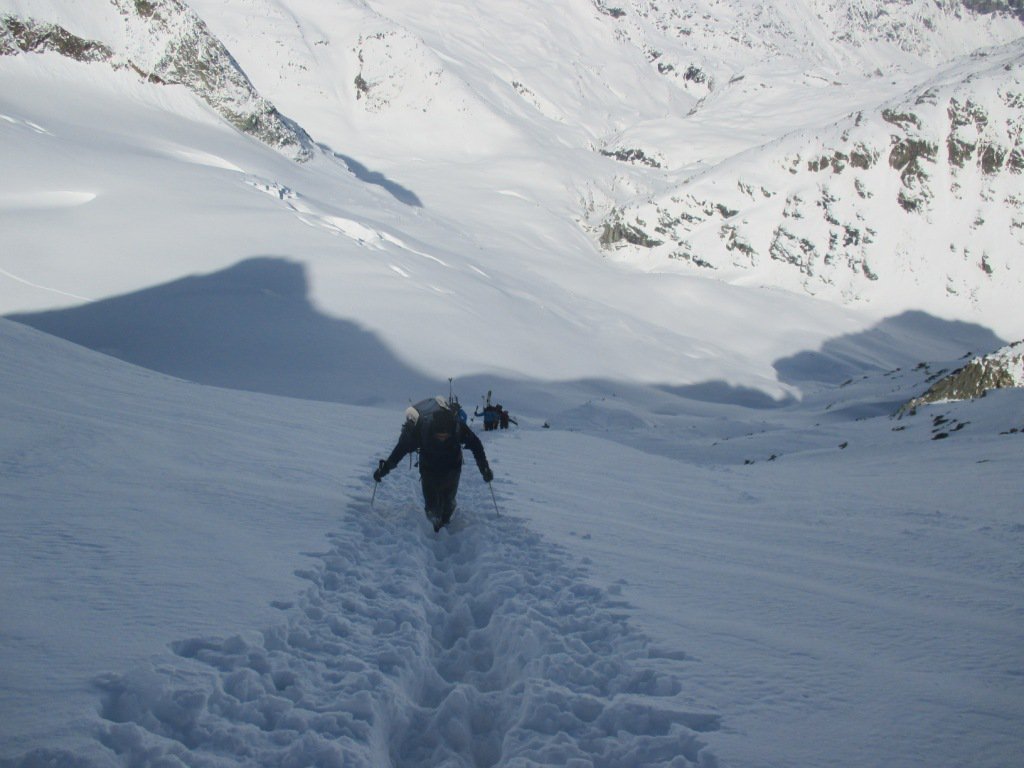 partiti dal rifugio con un altro gruppo di almeno 23 skyalp, di un corso di scialpinismo, anche loro diretti all’ Epicoun..di buon passo hanno battuto traccia… e quindi doveroso grazie… fino alla base della ripida spalla nevosa finale che porta all’attacco del canalino che porta in vetta.