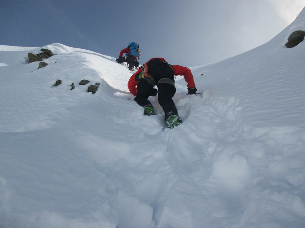 Da qui abbiamo proseguito solo noi, e quindi battuto traccia, fino al ripido canalino finale, completamete innevato, 45° con tratto anche piu’ vicino ai 50°.