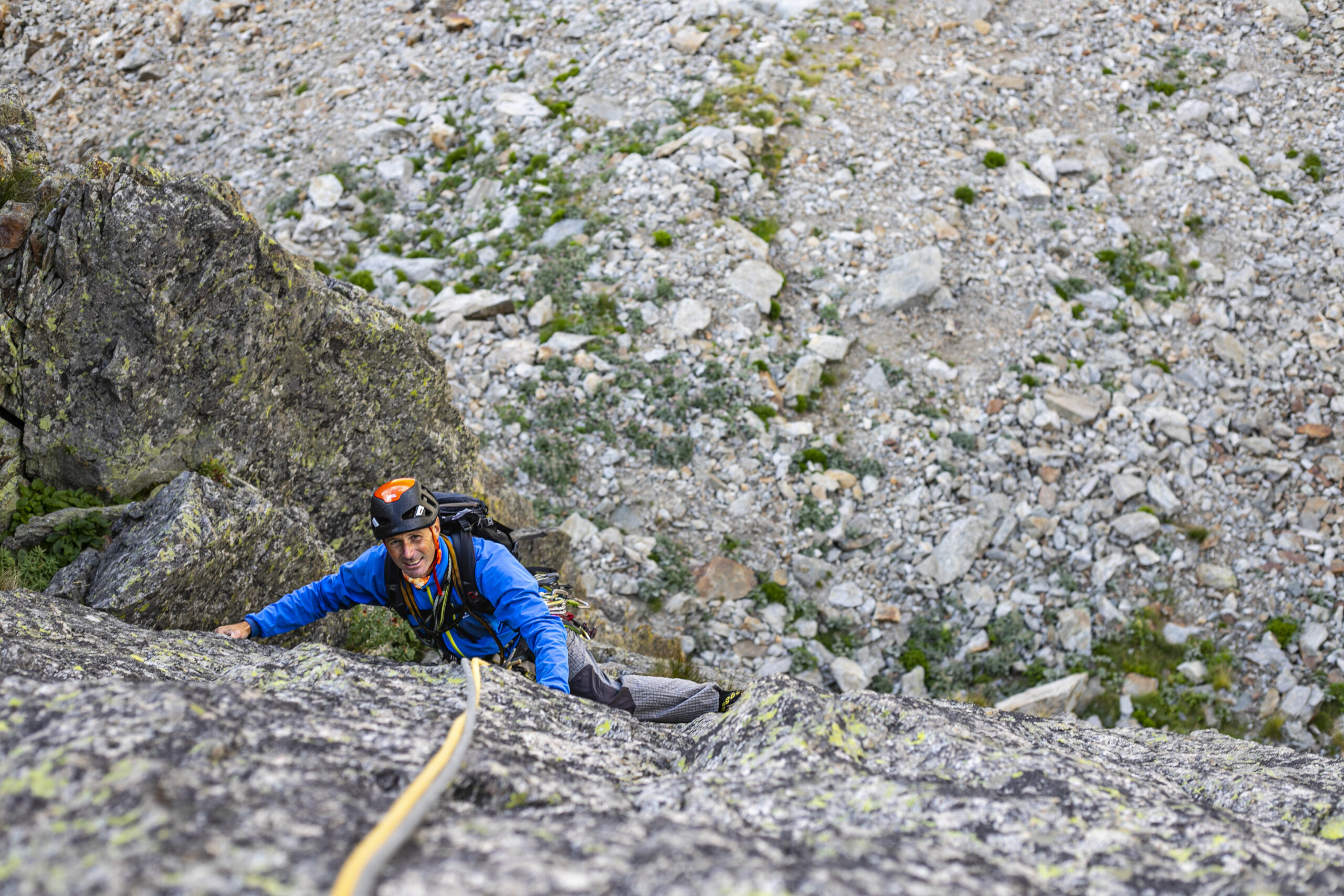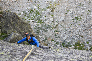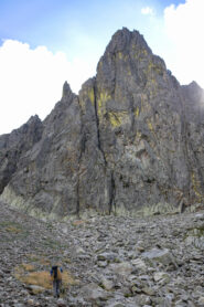 L6 : Risalire questa fessura ben protetta (V+) ed uscire a destra. Si traversa ancora a sinistra per risalire un’enorme fessura evidente sulla parete W (IV+) o direttamente sulla placca. Da lì raggiungere la vetta (III).