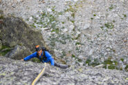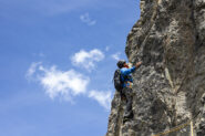 Risalire la placca a destra (fix posto abbastanza in alto) quindi attraversare a sinistra un gradino in leggero strapiombo. Risalire ripide lastre (V) poi un diedro leggermente marcato per traversare a destra per raggiungere un pilastro. Da lì si traversa ancora a destra e si supera un piccolo strapiombo (non poco insidioso, ben protetto) che si supera facilmente a sinistra (V+).