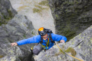 L1 : Inizio brutale con un passo in strapiombo, i francesi lo danno 6b/A0. Si segue la fessura sulla leggera destra, poi si traversa a sinistra per una placca (V).