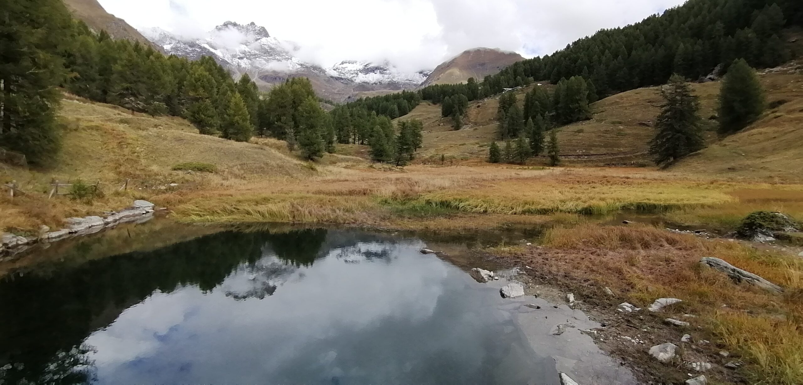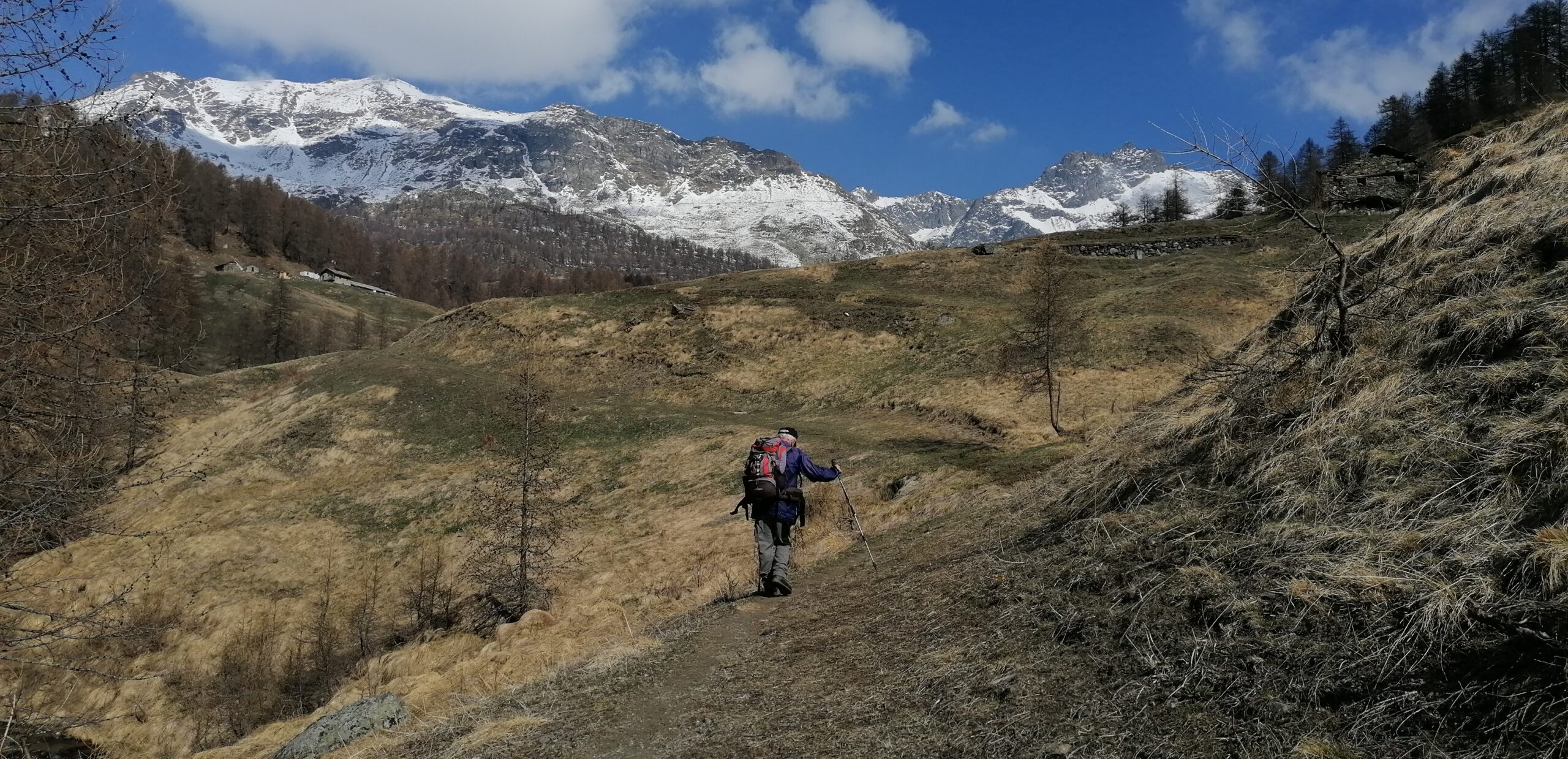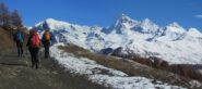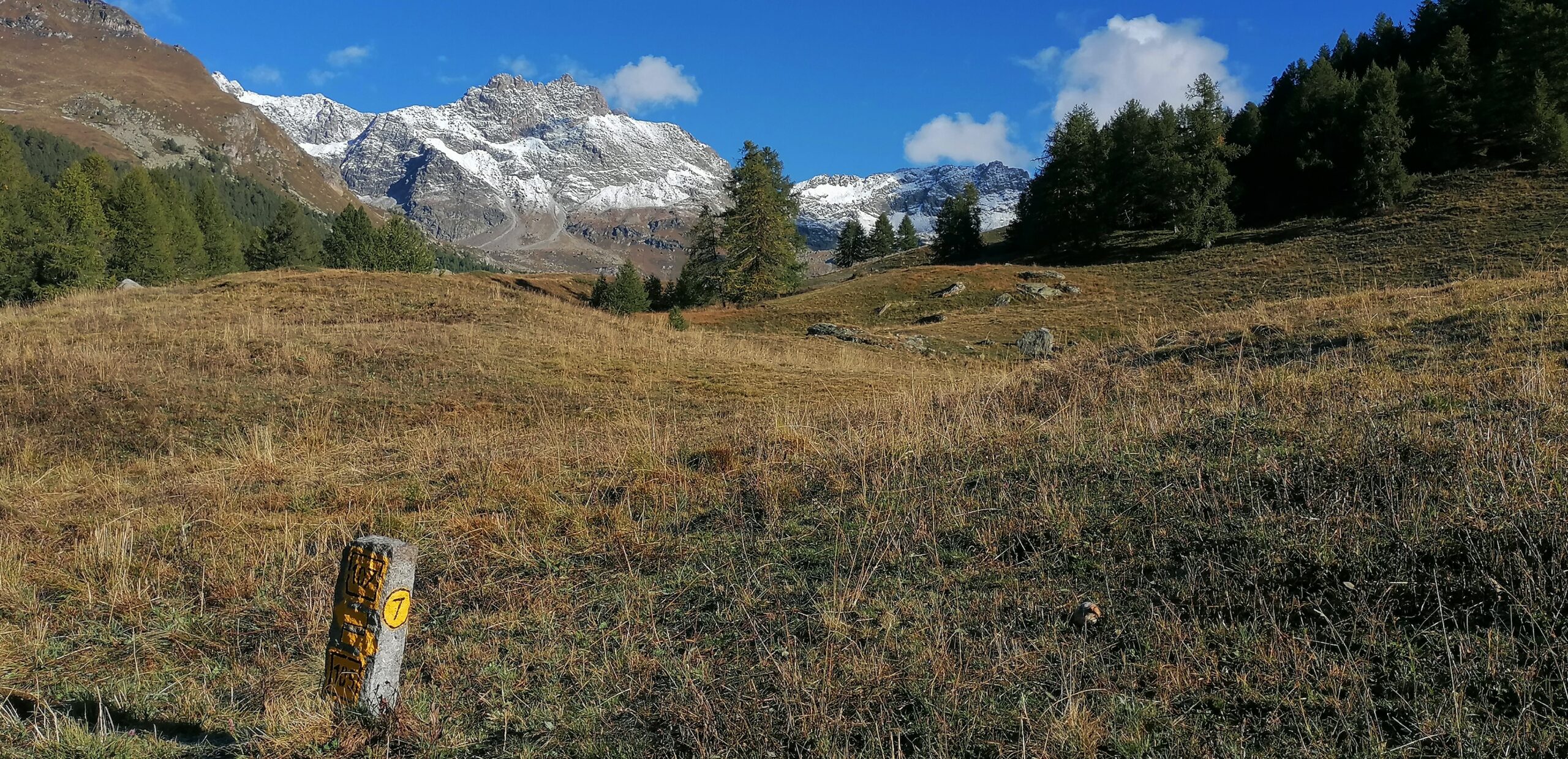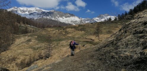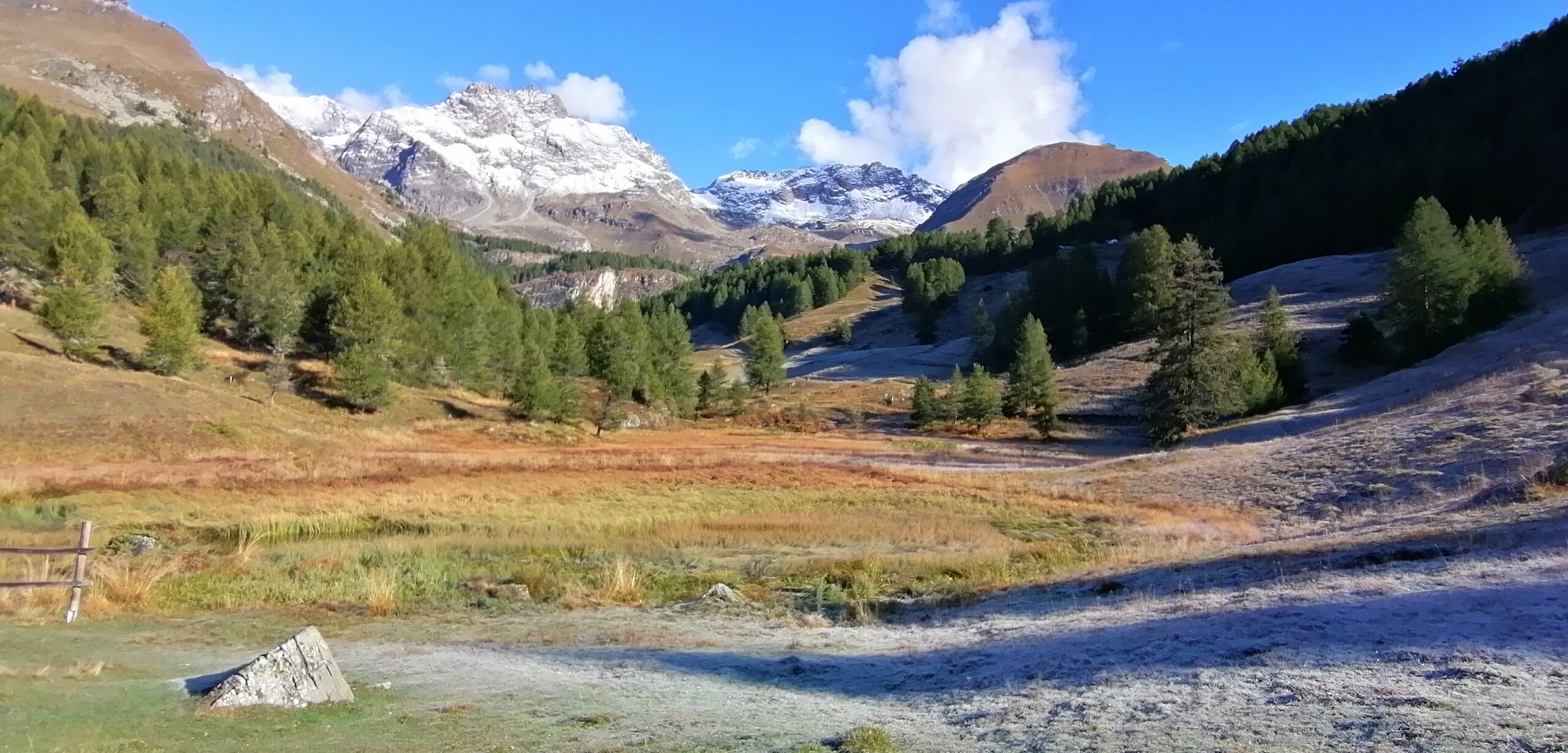 Il rientro avviene riguadagnano la poderale e senza percorrerla si individua sulla dx il sentiero n.ex13 che scende a svolte a raggiunggere la sottostante alpe Palud 2073m dove attraversata la poderale, si prosegue sulla sua dx costeggiando il rado bosco sino a riprendere la poderale più sotto 2080m e anche qui sulla sx si individua il sentiero che scende direttamente ad incrociare il n.1 1950m (da prima sterrato e poi sentiero) che in direzione sud dopo aver attraversato un torrentello 1905m procede con alcuni sali e scendi siano a raggiungere il bivio a quota 1905m nei pressi dell’ape Betsolaz; richiudendo la parte ad anello della escursione. Si prosegue ora il rientro per il sentiero di salita.
