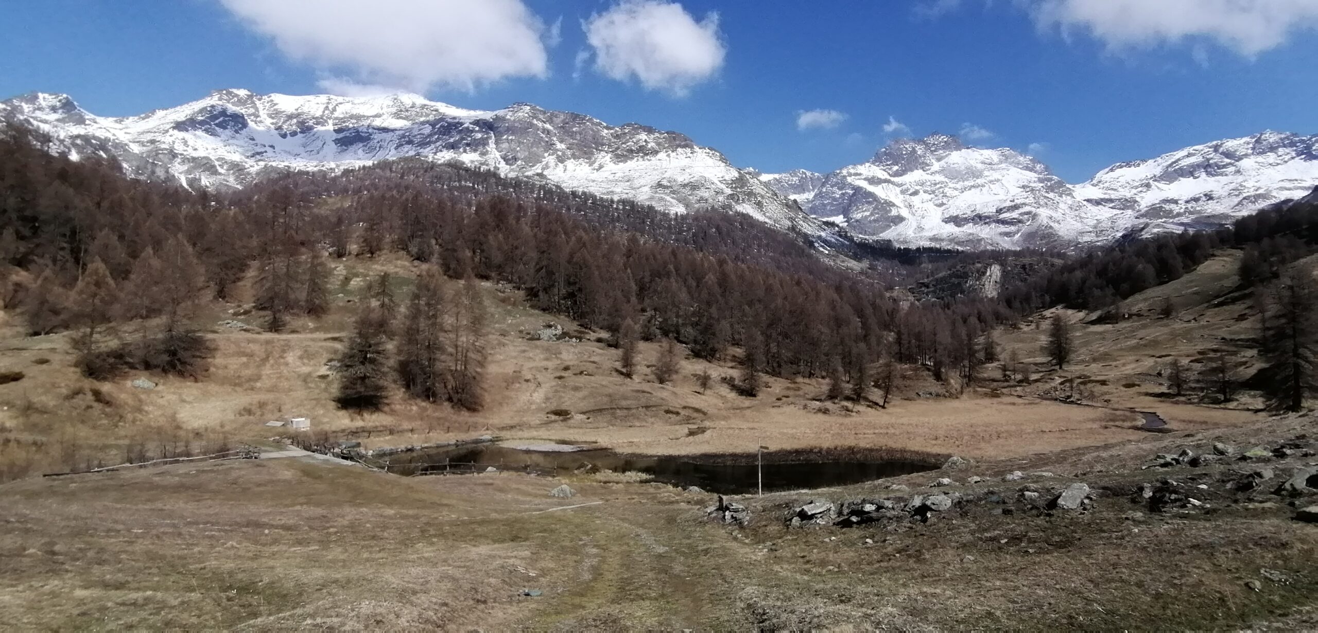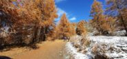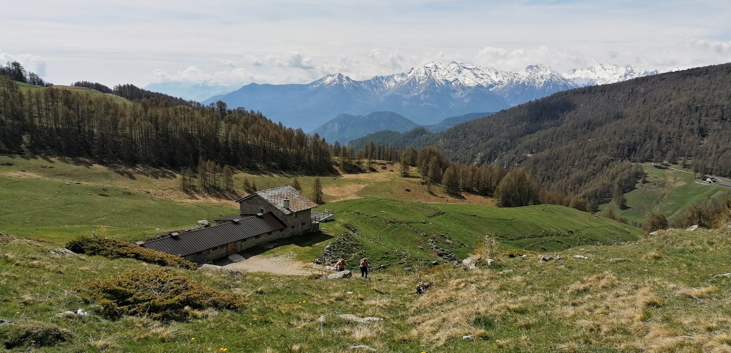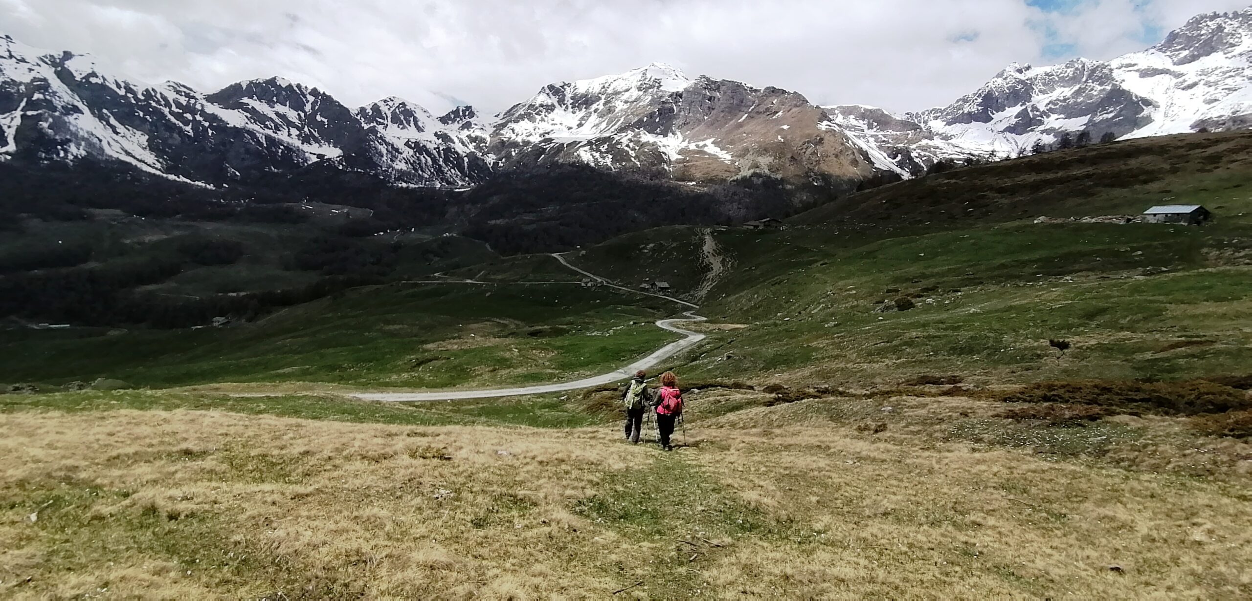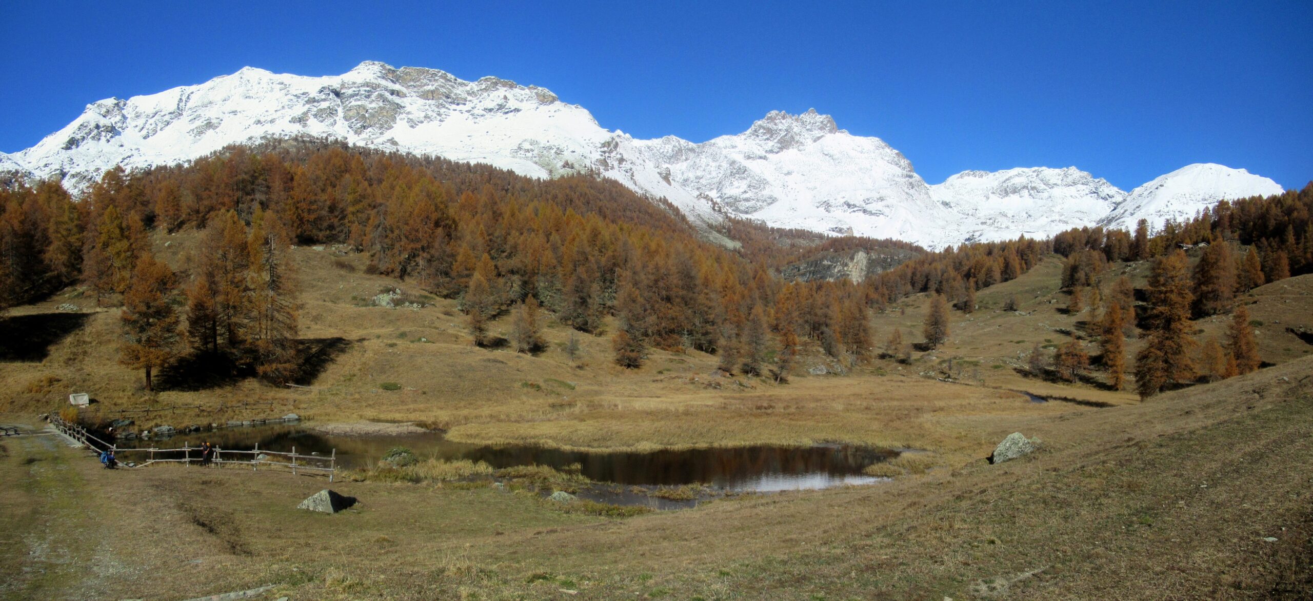 Il rientro avviene riguadagnano la poderale e senza percorrerla si individua sulla dx il sentiero n.ex13 che scende a svolte a raggiunggere la sottostante alpe Palud 2073m dove attraversata la poderale, si prosegue sulla sua dx costeggiando il rado bosco sino a riprendere la poderale più sotto 2080m e anche qui sulla sx si individua il sentiero che scende direttamente ad incrociare il n.1 1950m (da prima sterrato e poi sentiero) che in direzione sud dopo aver attraversato un torrentello 1905m procede con alcuni sali e scendi siano a raggiungere il bivio a quota 1905m nei pressi dell’ape Betsolaz; richiudendo la parte ad anello della escursione. Si prosegue ora il rientro per il sentiero di salita.