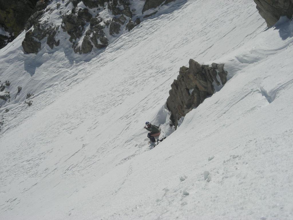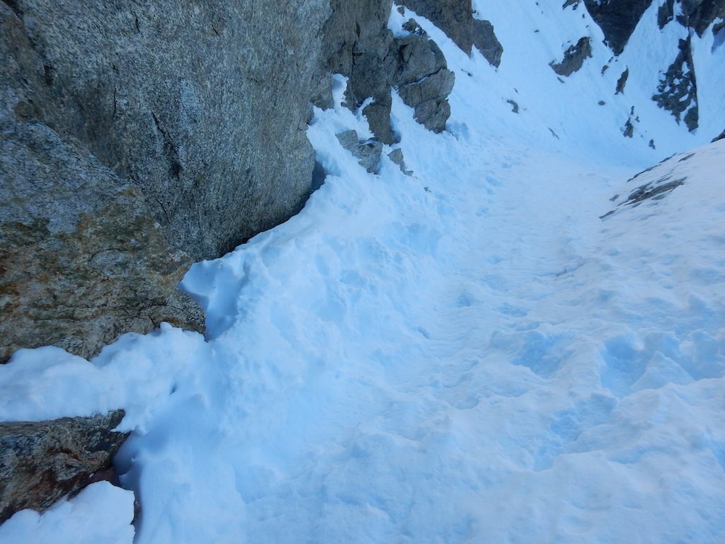 La pendenza sin qui intorno ai 40° tende ad aumentare progressivamente. Continuare nell’ampio canalone che piegando prima a destra e poi a sinistra porta alla sella.