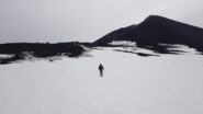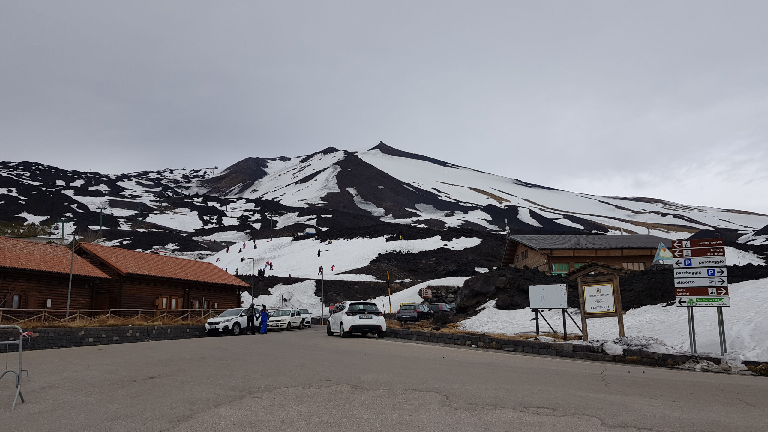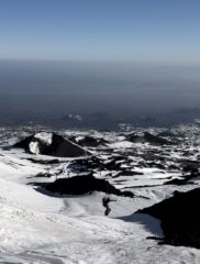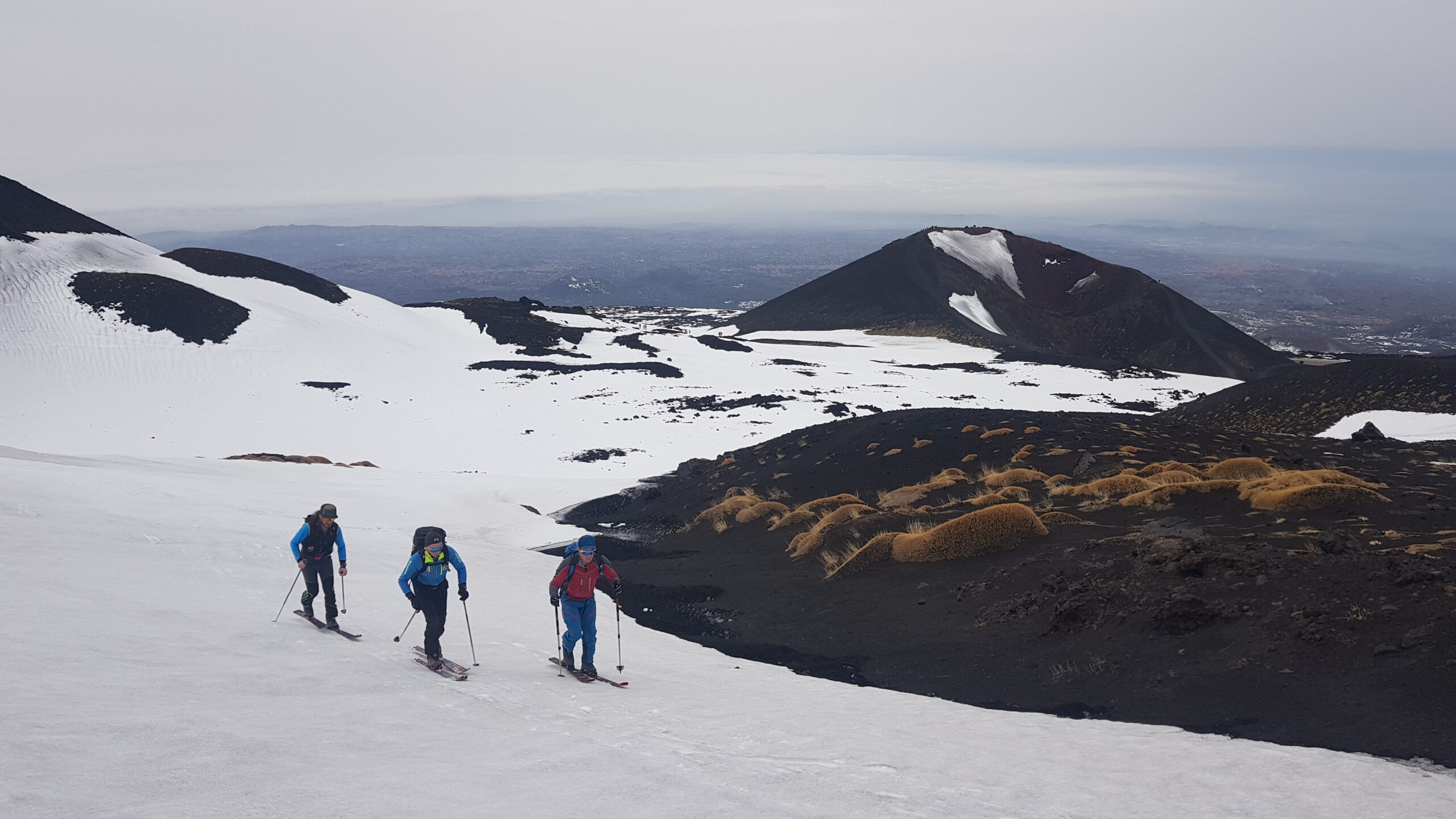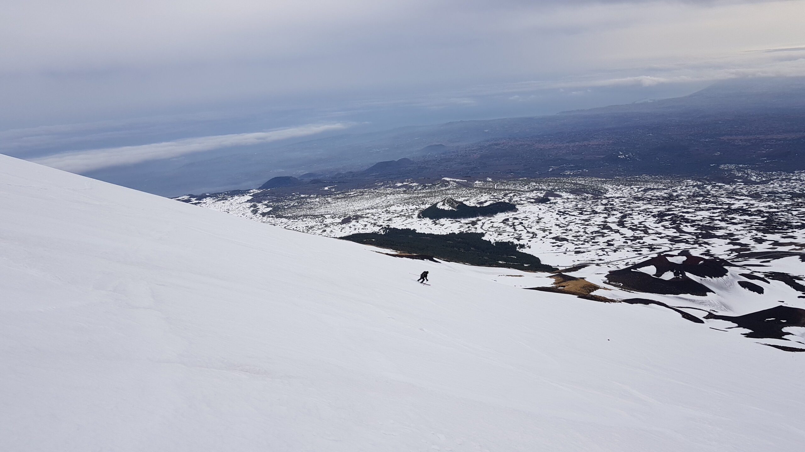 Si parte dal Rifugio Sapienza e si seguono gli impianti sino a quota 2500 dove si trova un pianoro che si continua a risalire sino all’ultimo pendio, più deciso e ripido. Slamom tra lava e fumi, si arriva in cima sino alla bocca che noi abbiamo trovato innevata, ma si trattava sicuramente di innevamento eccezionale. Fare attenzione!