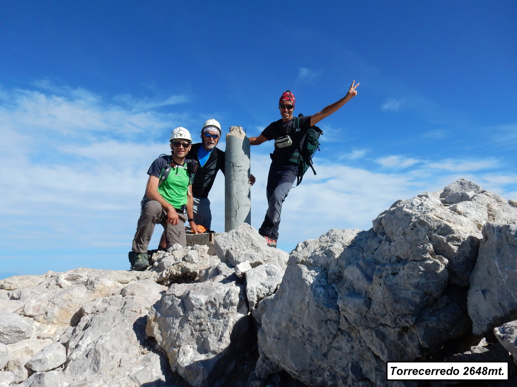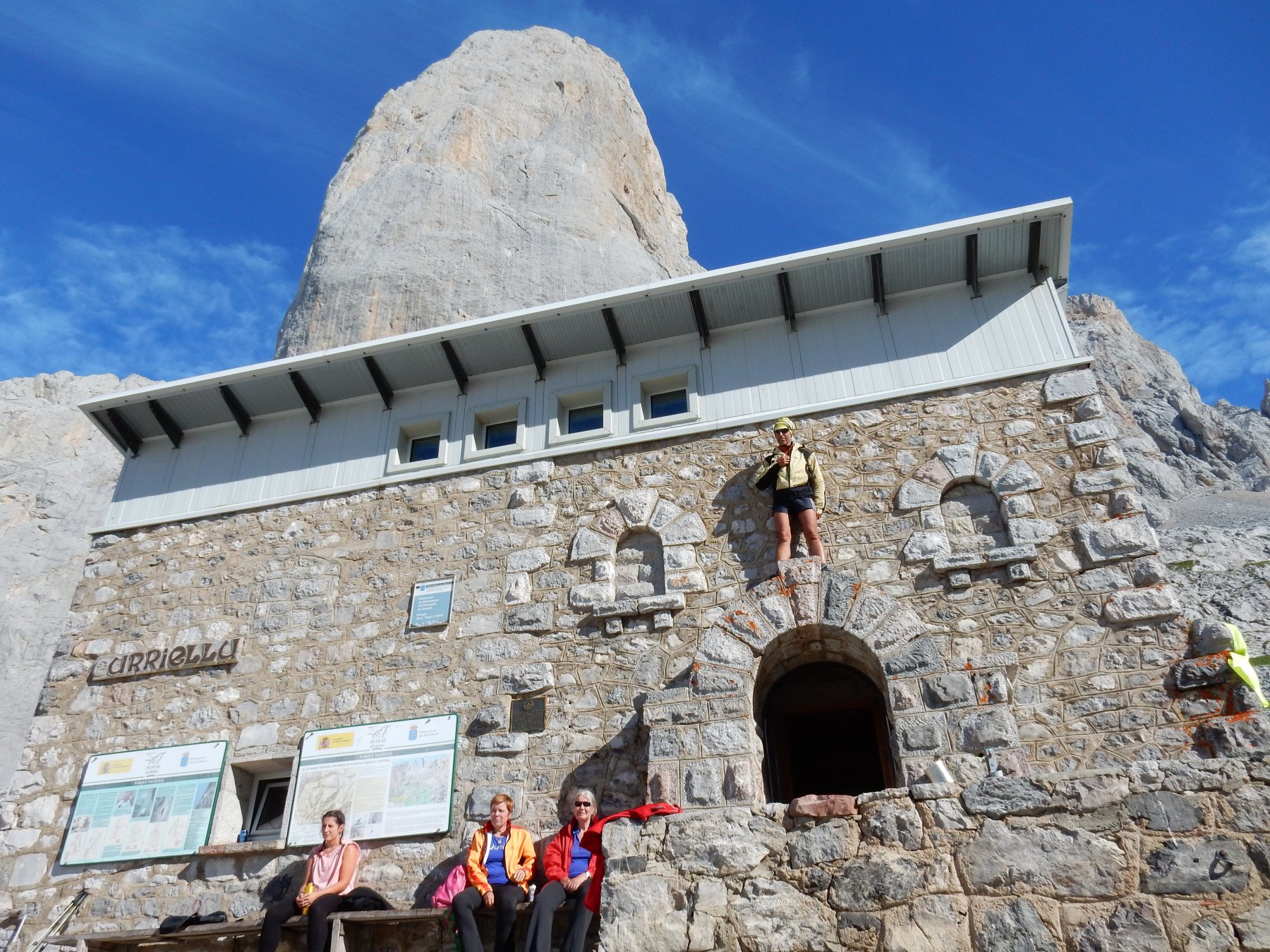 Ottavo giorno del Trek Anillo Picos de Europa interamente dedicato alla salita del Torrecerredo la cima più alta dei Picos de Europa. Giornata meteo serena ed un po’ ventosa, il percorso su sentiero fino a la Horcada Arenera 2278mt. è facile ed intuibile, poi da li seguiamo il labile sentiero contrassegnato in alcuni punti da ometti di pietra che ogni tanto spariscono traversando verso il Torrecerredo. Se non si conosce il posto (come noi) si potrebbero avere dubbi dove traversare, meglio avere con se una cartina o traccia GPS. Individuata la cima traversiamo sotto di essa e la saliamo con attenzione senza problemi con passaggi ben appigliati di II°+ , oggi stranamente poca gente sul percorso il che ha reso più sicuro l’ultimo tratto dove l’affollamento può creare problemi con scariche sassi. Dalla cima panorama grandioso su tutto il circondario della zona fino all’Oceano Atlantico. Al ritorno abbiamo fatto un giro più lungo passando nei pressi del Jou Negro ,un circo dove è situato uno dei pochi nevai perenni dei Picos Europa, da li poi scendiamo al piccolo Ref. Jou de los Cabrones posto in una posizione privilegiata con panorama spettacolare sugli acuminati Picos de los Cabrones 2558mt.