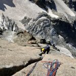 Discesa: dalla vetta una serie di doppie porta alla breche tra Eveque e Nonne (qui si può arrivare anche ad un certo punto della cresta, come scappatoia in caso di maltempo, senza fare doppie, ma evitando tutta la parte finale). Si scende dalla breche (ometti) fino alla terminale. Quindi si salta sul ghiacciaio e si arriva al rifugio Couvercle.