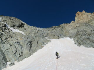 Partiti dal rifugio alle 4.00, neve continua e portante da poco dopo, messo subito i ramponi e ci siamo legati al col collon, ghiacciaio ancora chiuso con seracchi visibili. Solo ultima parete con neve marcia. Rocce pulite e bel appigliate con qualche tratto di neve (fatta con i ramponi) . Arrivati in vetta alle 8.30. Trovato cordino per doppia ma non usato. Rientro al rifugio alle 12, neve buona tranne ultimo tratto dal col collon al rifugio dove la neve aveva mollato.