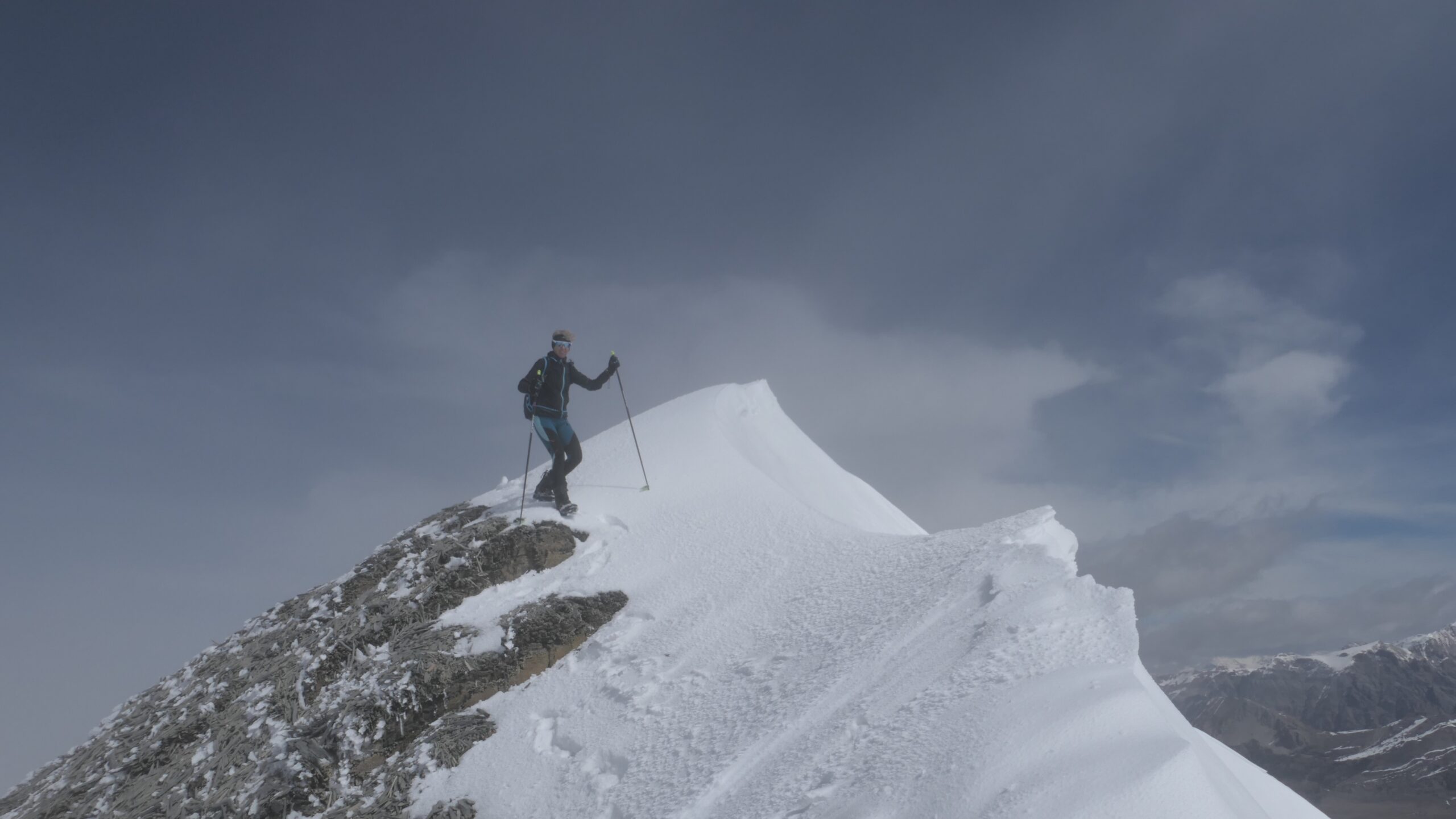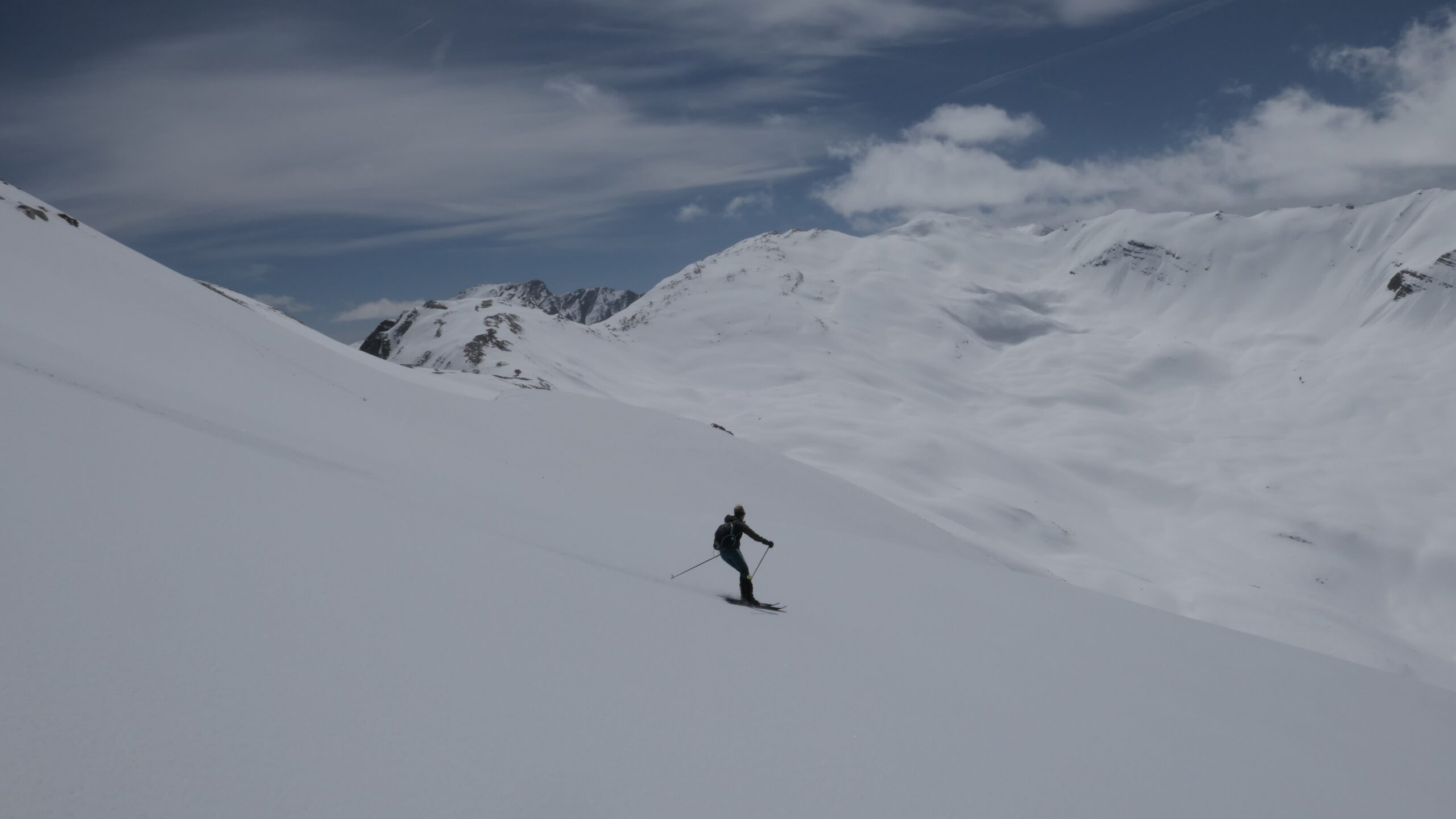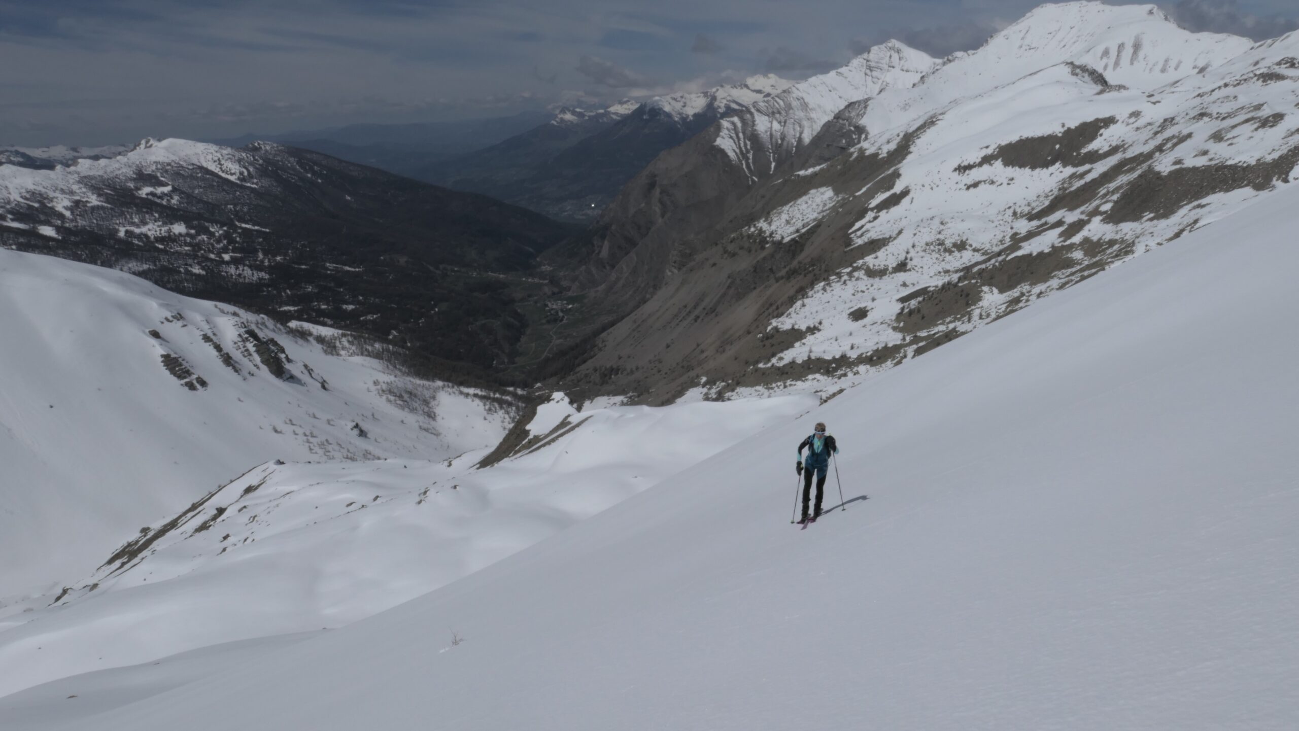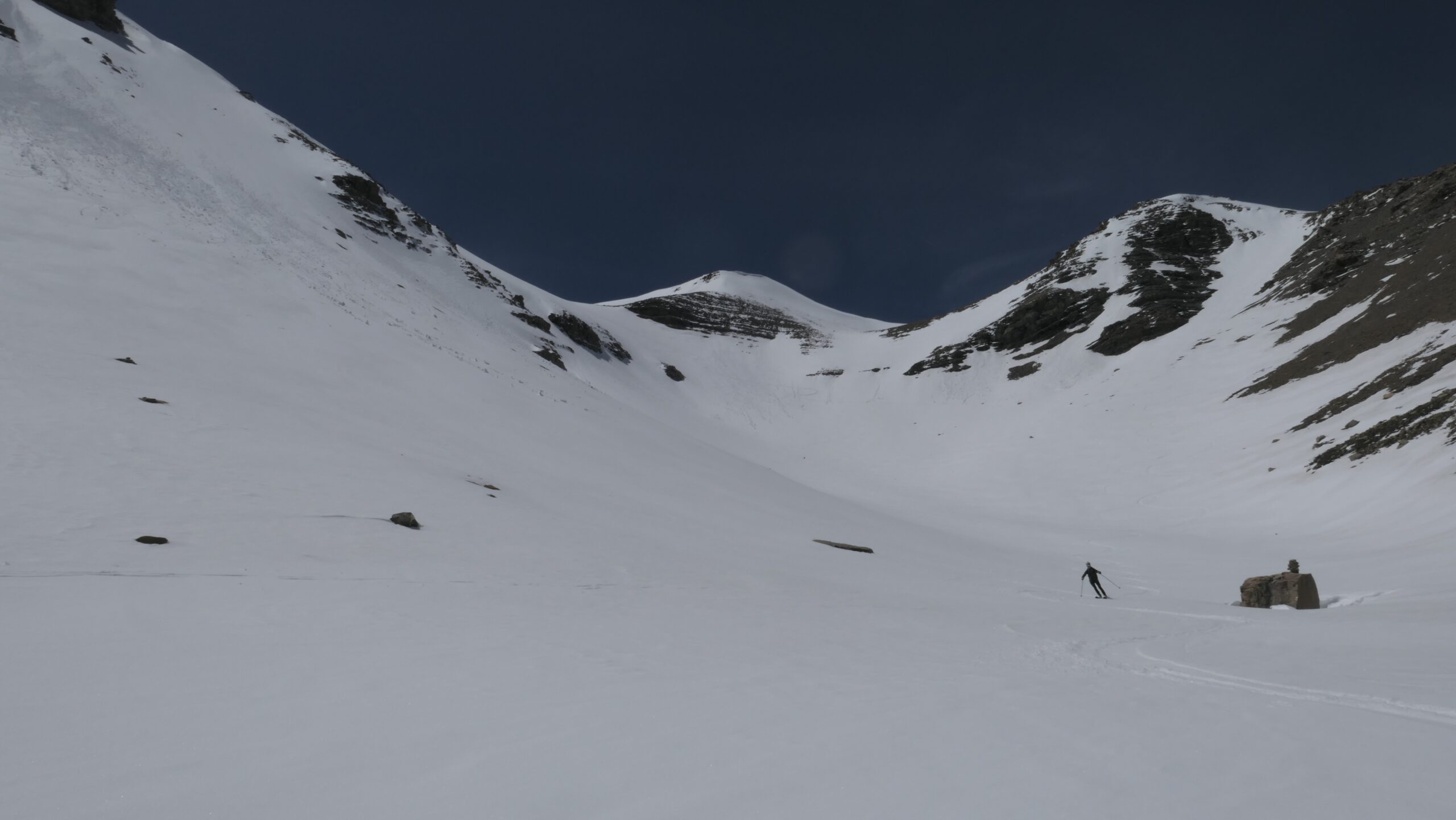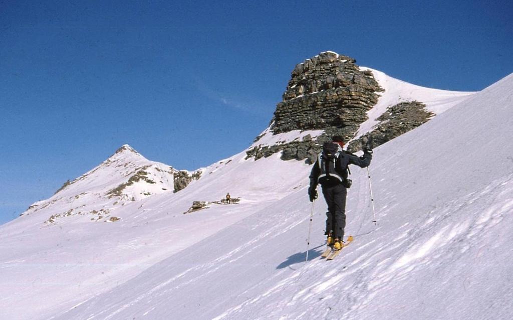 Dal Colle si volge a destra e per pendii ben sciabili si raggiunge la cresta, che via via si restringe, e la si segue, con attenzione nel tratto finale, fino in cima.