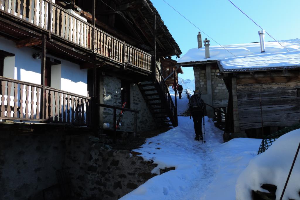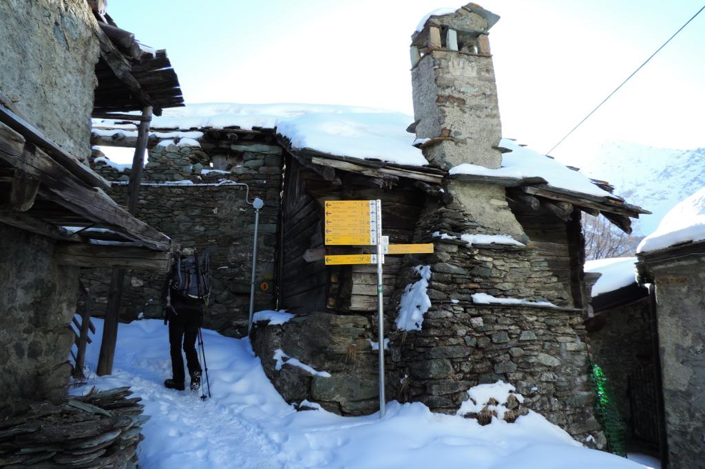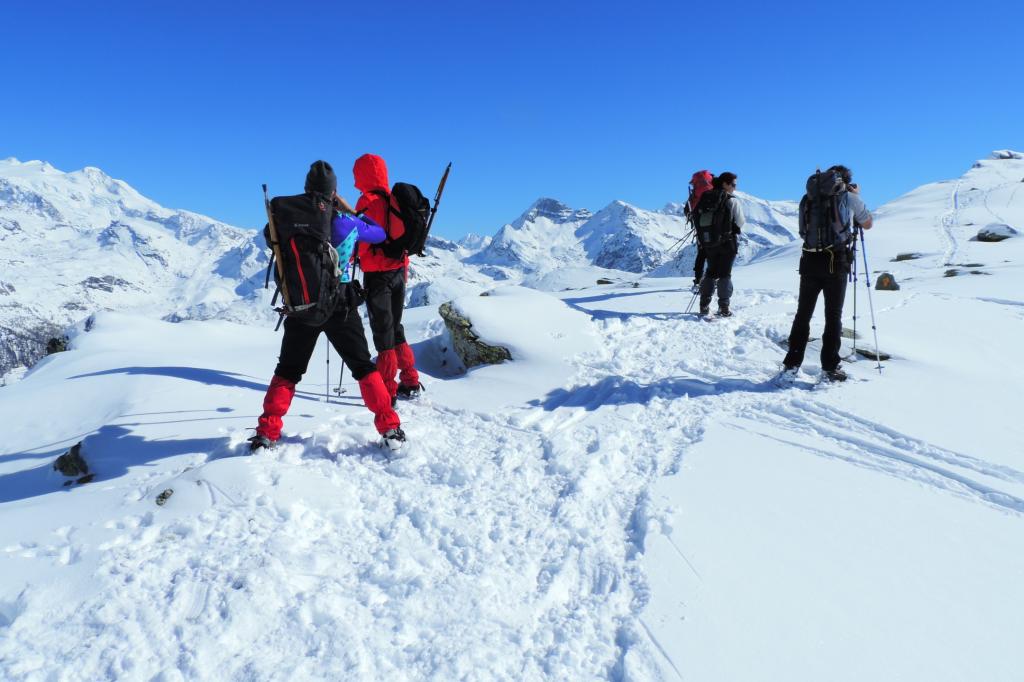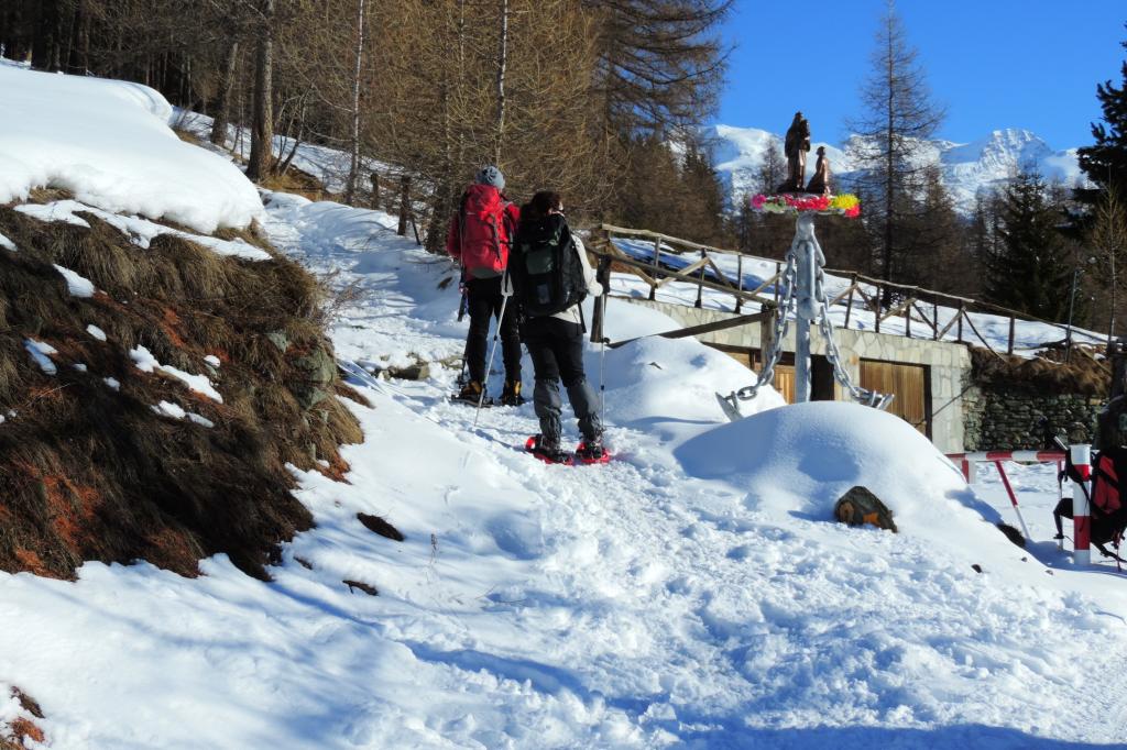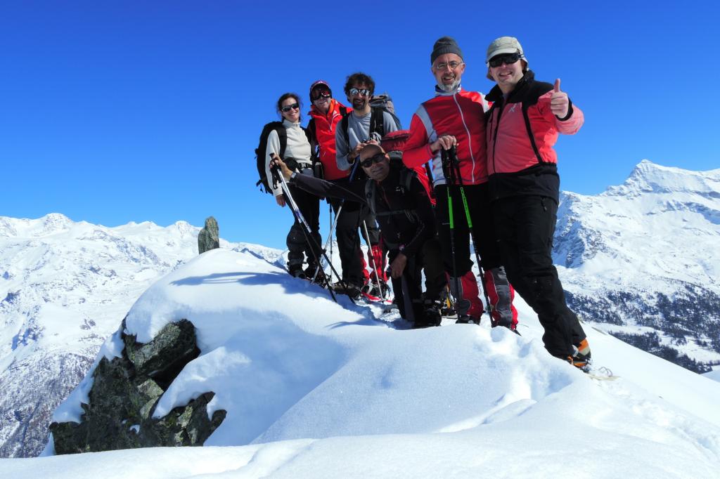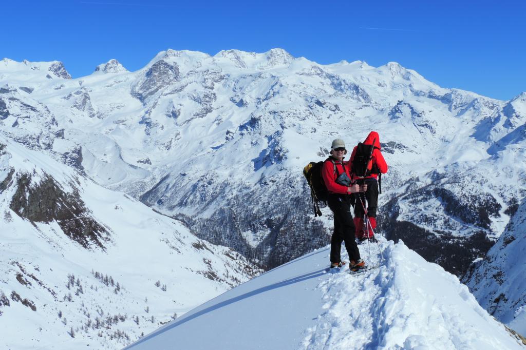 Valutate le condizioni dell’innevamento, e nonostante il rischio valanghe abbastanza elevato abbiamo individuato nel Monte Facciabella la meta adatta per oggi. Arrivati a Mandriou, siamo partiti intorno alle 9,00 con il sole e il cielo limpido…ed era ora, dopo quasi un mese di inattività! Siamo saliti inizialmente seguendo il sentiero con segnavia 3A fino ad un ampio pianoro, dove abbiamo lasciato una traccia esistente e ci siamo avviati verso un lungo traverso in diagonale (Canale Cortoz) verso una chiesetta nei pressi dell’Alpe di Vascoccia con una ripida rampa terminale che ci ha reso faticosa la salita su neve farinosa e senza alcuna traccia. Poi nella parte alta ci siamo tenuti al centro del vallone fino al Colle di Vascoccia, seguendo una traccia battuta da alcuni scialpinisti e altri ciaspolatori saliti probabilmente ieri. Dopo una breve sosta al colle per ammirare un panorama circolare veramente notevole e per le foto di rito, ci siamo rimessi in marcia per salire la cresta che porta in cima. La cresta finale è stata indubbiamente la parte più piacevole ed appagante della gita fatta, con il tratto finale prima della cima abbastanza affilato e senza alcuna traccia. Una scelta davvero indovinata quella di salire il Facciabella, gita che ha ripagato tutti noi della scelta fatta, meritava decisamente! Oggi in cima solo noi più due ragazze francesi, altri 4 ciaspolatori si sono fermati al Colle di Vascoccia. Panorama davvero splendido e vastissimo dalla cima (eccellente il colpo d’occhio sul Gruppo del Rosa, dal Breithorn Centrale, con i Lyskamm fino alle Punte Gnifetti e Zumstein!) Neve quasi sempre farinosa, se non ci fosse stata una traccia nella prima parte e poi dalla chiesetta al Colle di Vascoccia sarebbe stata dura arrivare in cima! Dopo quasi 1 oretta di sosta in cima (stranamente oggi senza vento, e devo dire che non mi mancava affatto!!) per goderci la cima, ammirare il panorama, per il servizio fotografico e la pausa pranzo ci siamo avviati in discesa. Fortunatamente la neve ha tenuto in maniera decente sulla traccia fatta. Arrivati alla chiesetta invece di seguire il lungo traverso del Canale Cortoz abbiamo preferito scendere direttamente per il vallone fino a raggiungere la pista da sci, e qui tagliando a sinistra (al di fuori della pista) siamo poi scesi direttamente a Mandriou, seguendo una pista ben tracciata da altri ciaspolatori, la neve si era allentata poco prima di arrivare in paese, ma ci stava vista la temperatura elevata, e siamo arrivati al parcheggio senza penare troppo. Oggi ho sentito sulle gambe il mio periodo di pausa (ero fermo da un mesetto..) faticando più del solito, ma ci stava e lo immaginavo.