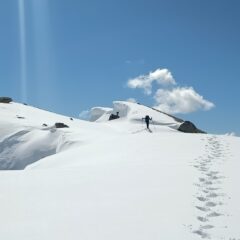 In cresta non c’era traccia, neve a tratti dura a tratti sfondosa e ventata. Usati i ramponi per arrivare alla piccola croce.