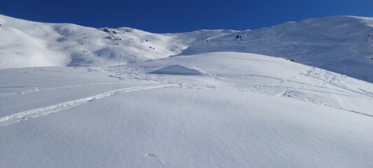 In tanti oggi su questo itinerario. Le condizioni sono buone, ancora qualche giorno di caldo e tutti i pendii a sud sono fattibili. La neve è rimasta farinosa stando tutto a sinistra appena sotto la cima, poi diventa crostosa ventata e sotto umida trasformata..insomma ci si diverte comunque.