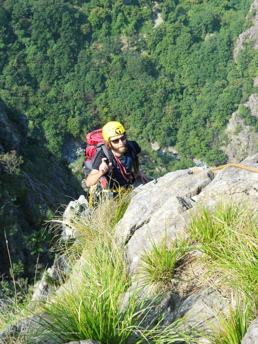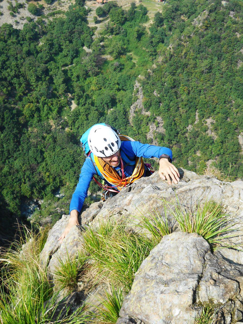 via molto bella. Ben spittata, con materiale in buone condizioni. Esistono in rete due relazioni dettagliate tiro per tiro. Noi abbiamo seguito quella da 9 tiri (gambeinspalla) e ci siamo trovati perfettamente. Quella da 11 considera un tiro il traverso (dopo il 3° tiro della relazione da 9 tiri) su cengia erbosa dove c’è il cavo metallico e spezza il penultimo tiro in due.
