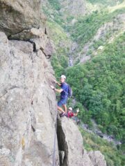 Torno dopo 5 anni a ripetere questa via. Nella sua facilità, dovuta soprattutto alla chiodatura ottima e abbondante per chi inizia (infatti all’epoca è stata una delle mie prime via lunghe, ora l’ho trovata persino esagerata), questa via la trovo sempre molto bella, con una roccia bella da guardare e da scalare, in un ambiente incredibile se si pensa per un secondo di essere appena sopra voltri. Avvicinamento in 25 minuti con passo svelto ( i 20 minuti dichiarati da molte relazioni sono secondo me pochi, e potrebbero trarre in inganno chi si addentra in quella valle, 30 sono più realistici se si va lì la prima volta ) sentiero discretamente segnalato, nella pietraia finale fate attenzione che i bolli rossi sono un po più difficili da scovare. Con molta calma siamo saliti in 3 con una mezza da 60 doppiata sfruttando l’idea di toku ( nessun problema di lunghezza, abbiamo anche concatenato L7 e L8 visto che sono molto brevi e girano poco) in 3 ore. La partenza di L3 è rugnosetta, secondo me il passaggio più duro della via. Molto bella L6. Discesa delicata, ma rapida, in 50 minuti eravamo all’auto) Dopo il tratto pianeggiante subito dopo il Canalino iniziale con freccia bianca, invece di salire ed entrare nel forteto di erica siamo scesi a sinistra seguendo una traccia segnata con ometti, traccia ripida e a tratti su sfasciumi, che ci ha fatto tagliare fino a poco prima della casa di caccia. 5 anni fa non c’era questa traccia. Sentiero poco battuto, erba molto alta.