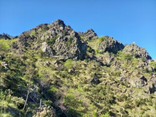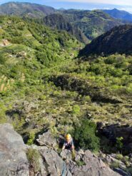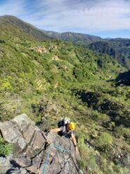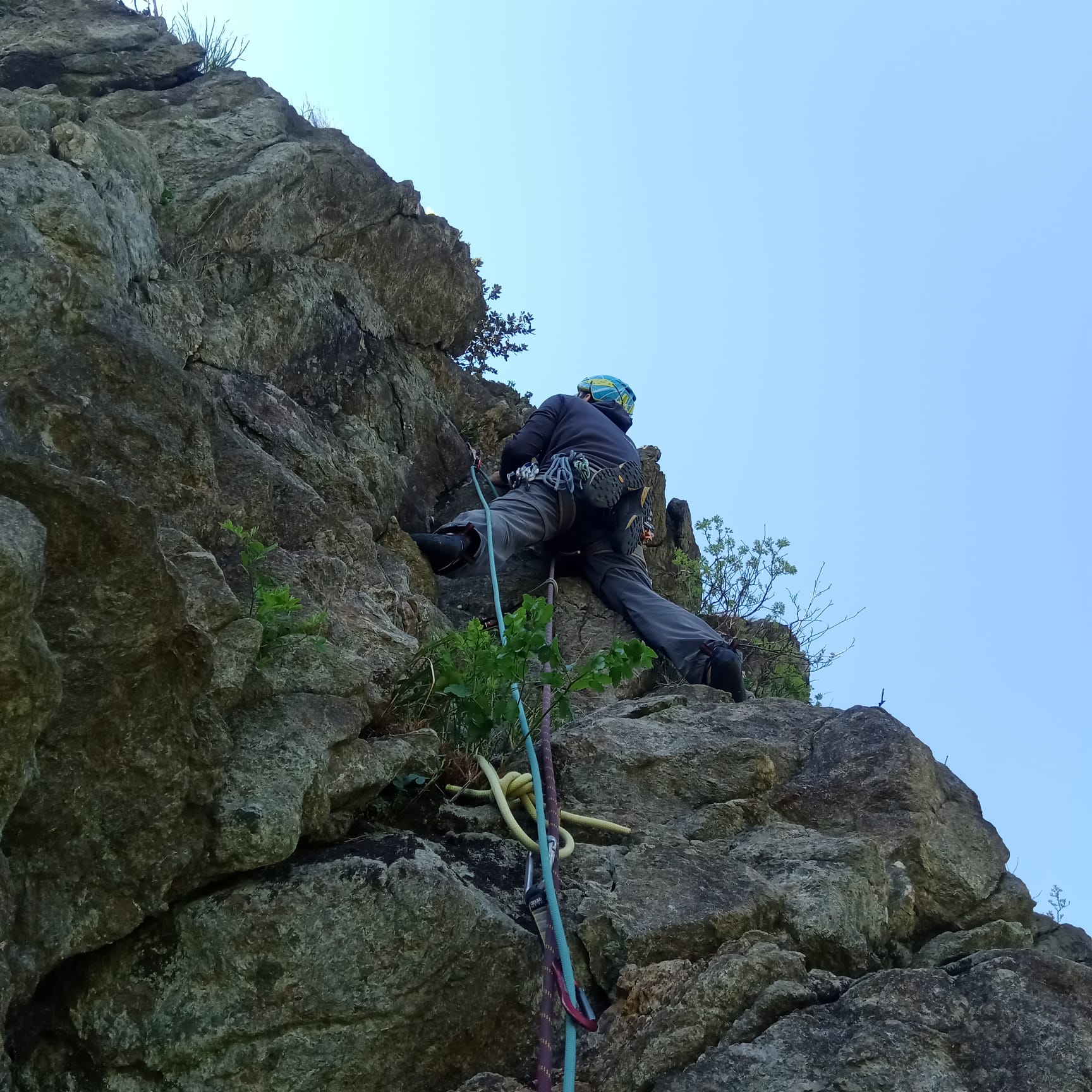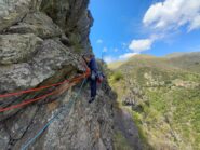 Dalla sosta si attacca direttamente l’ostico muretto verticale con azione decisa e muscolare per ristabilirvisi al di sopra. Un successivo muretto va affrontato tenendosi leggermente sulla destra per poi traversare, all’altezza di un arbusto,verso sinistra per raggiungere una comoda cengia. Spostarsi sulla cengia verso sinistra per attaccare il successivo risalto, dapprima sul muretto e poi spostandosi sulla placca sino a raggiungerne la sua sommità e ,quindi, scendere nell’intaglio ove si fa sosta. (1 fix con maillon+chiodo da collegare) 20m (V)