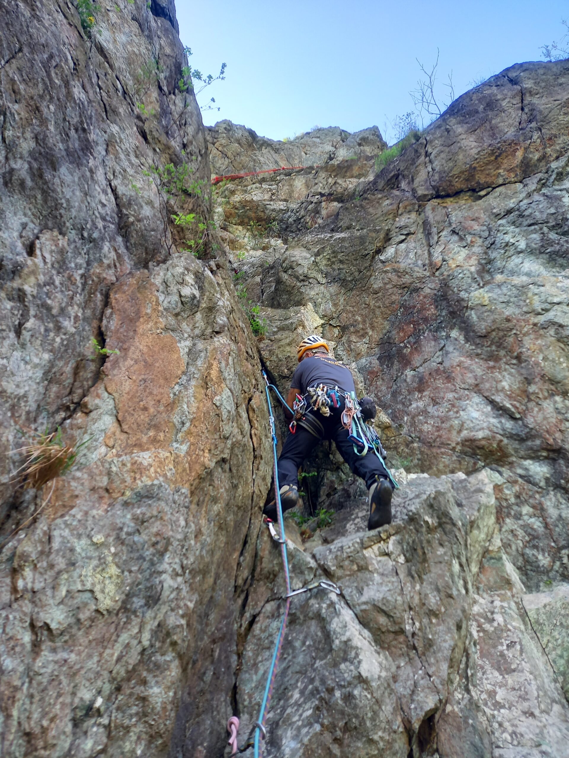 Dal masso basale si risale la placca verticale sfruttando buoni appigli sulla sinistra. All’altezza del primo chiodo ci si sposta verso destra per ristabilirsi sul piano inclinato. Sfruttando il lato sinistro meglio appigliato e il destro per la contrapposizione si risale interamente i diedro per poi uscire a sinistra una volta arrivati sotto a uno strapiombo. Comoda cengia di sosta con due placchette collegate da cordone e anello di calata. 20m (V+/V)
