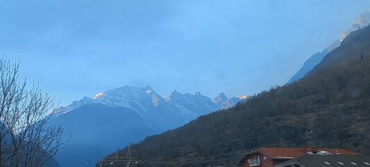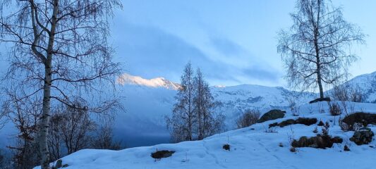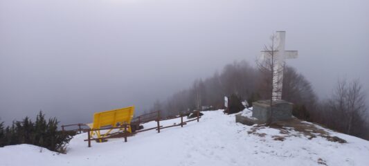 Brevissima gita pomeridiana da Piandemma alla Croce del Faggio e alla panchinona gialla. Ambiente suggestivo, nella neve, con la bruma del tardo pomeriggio che saliva, purtroppo a coprire il panorama sulle cime della Valle Orco.