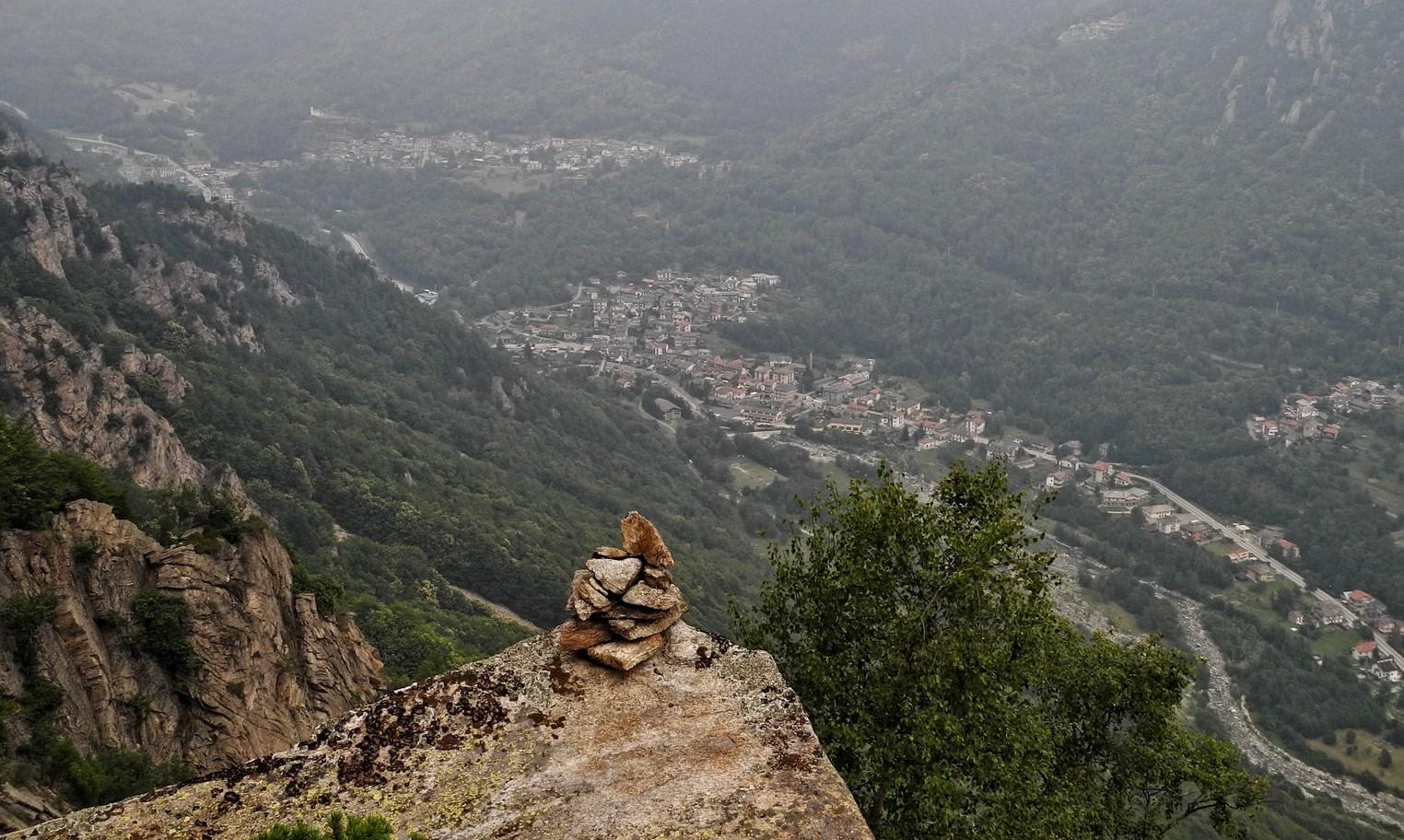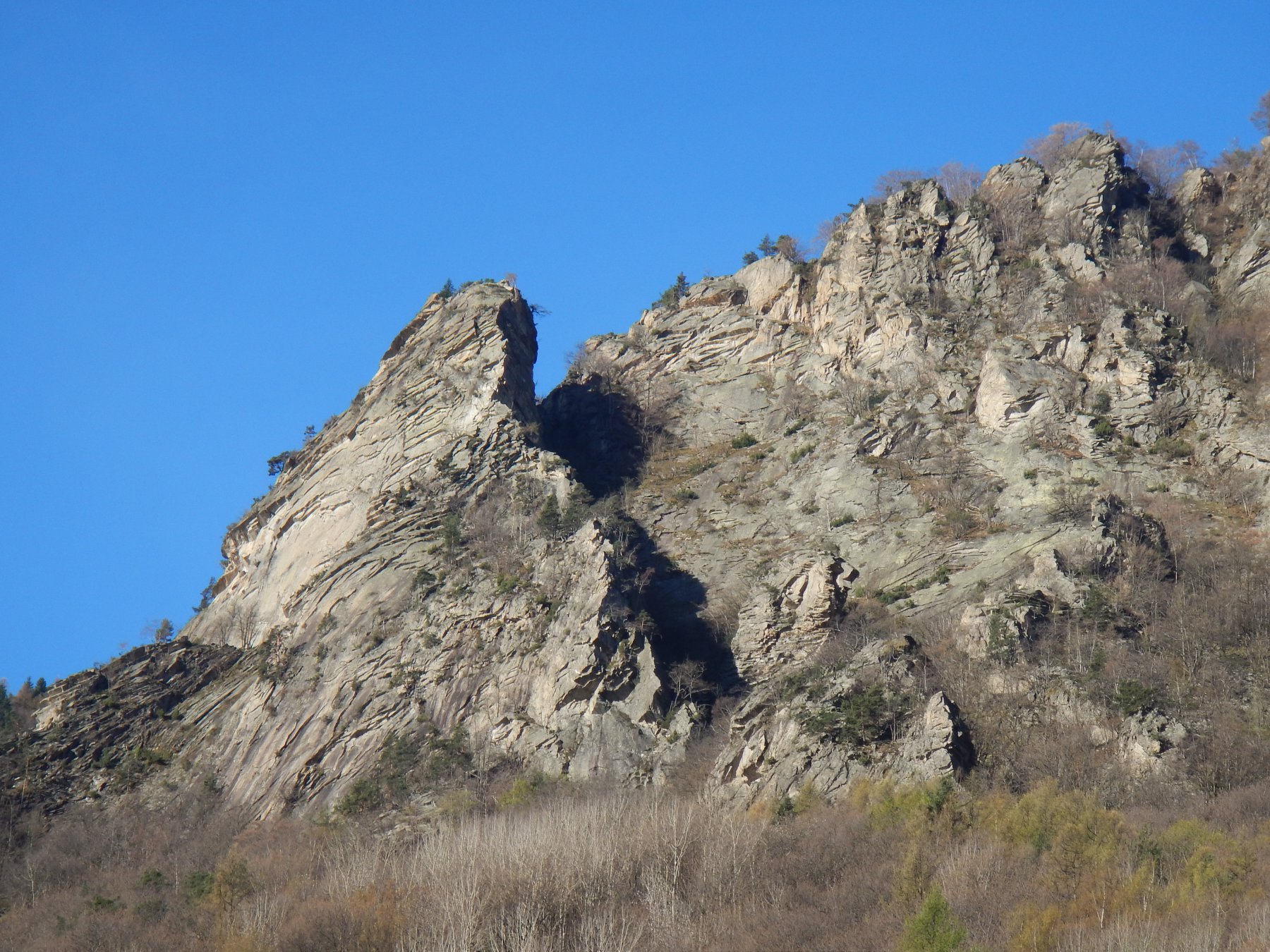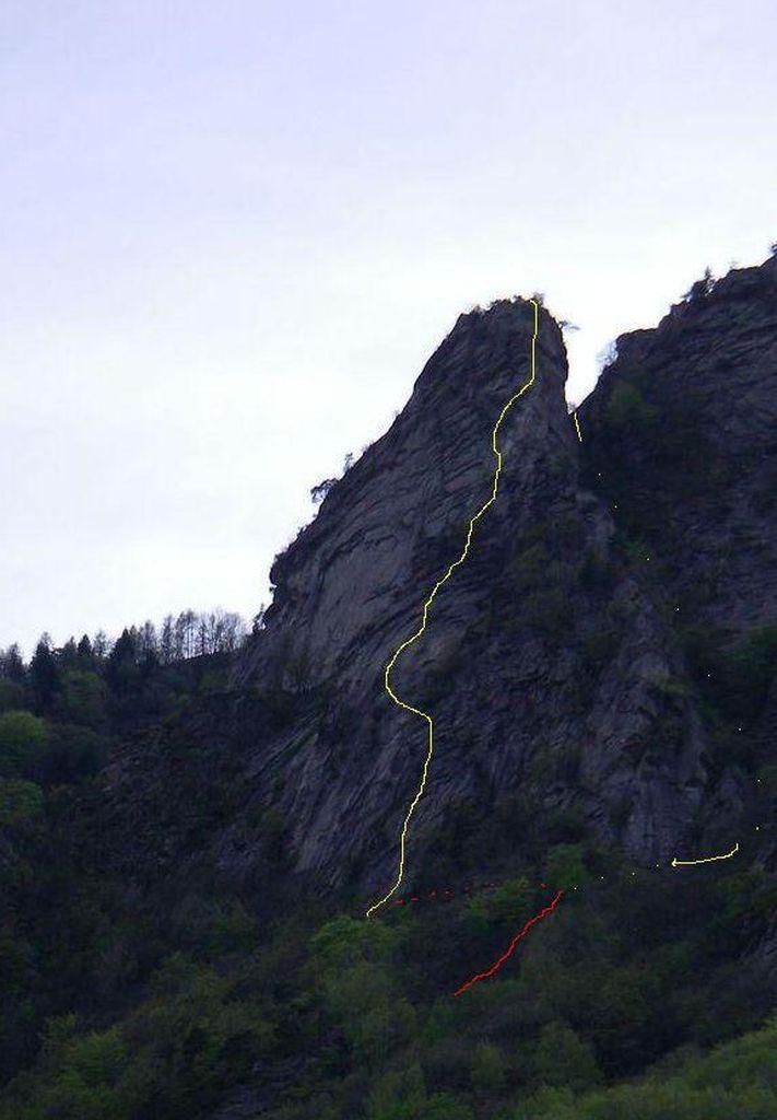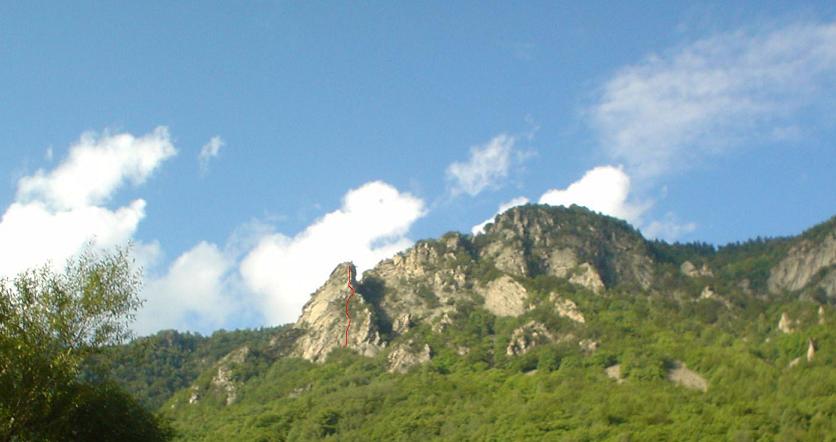 Arrivati nel cuore della borgata lasciare a destra il forno per la panificazione e dopo qualche metro svoltare a sinistra risalendo una ventina di gradini, sembra proprio di andare in una proprietà privata, non essendoci indicazioni c'è il rischio di superare la borgata. Dopo esser saliti qualche metro in mezzo alle baite si arriva in un piano utilizzato d'estate per il barbecue, a questo punto, si svolta a sinistra e si prende dritto per il bosco superiore. In questo caso il sentiero non è ben definito. Risalire il bosco per una decina di minuti seguendo anche qualche ometto, poco prima di un salto roccioso, attraversare a destra e risalire poi una pietraia (grossi massi) in direzione della base della cresta Nord , quindi attraversare a sinistra fino alla base della parete. (40-45 minuti di marcia).