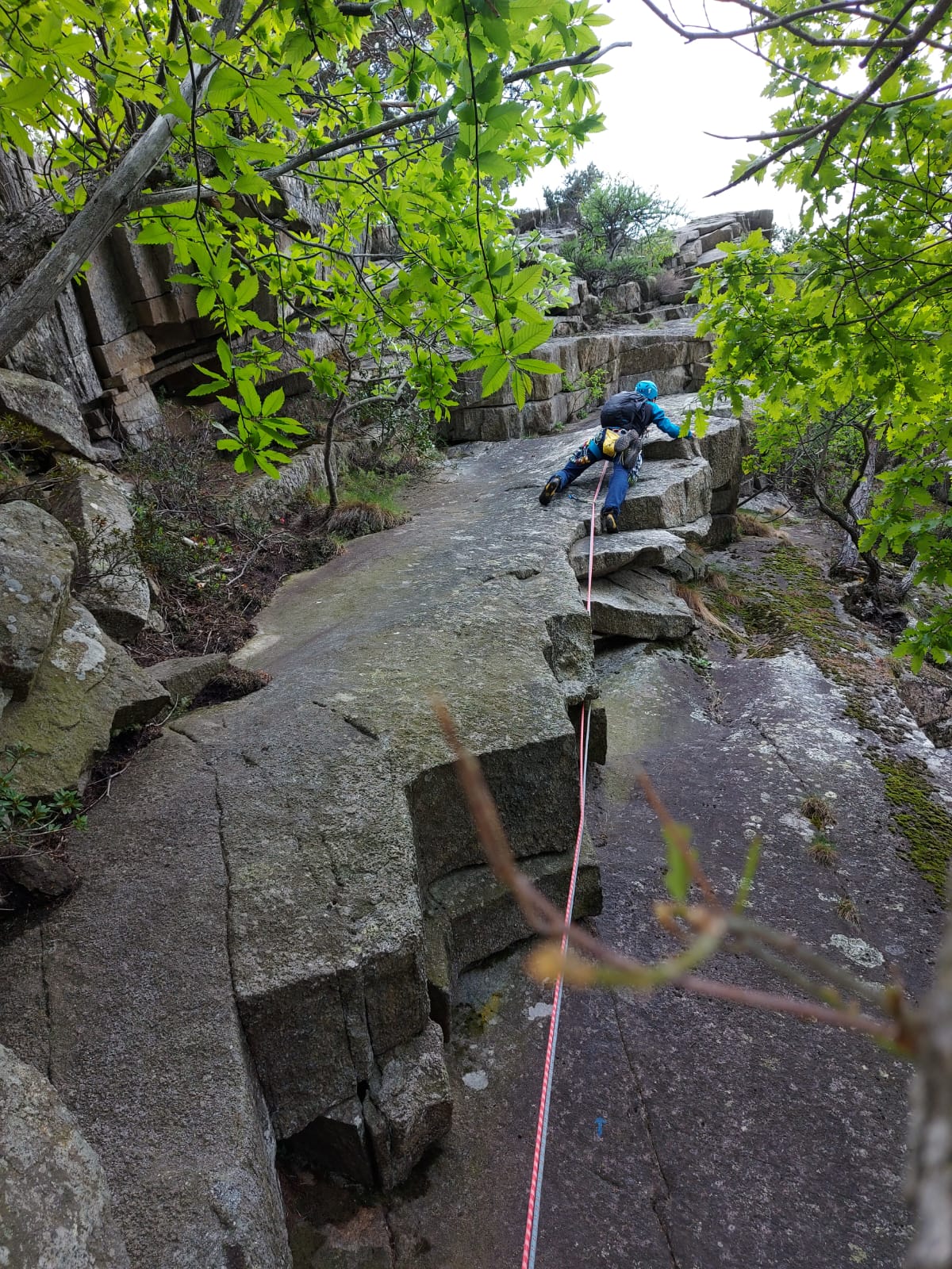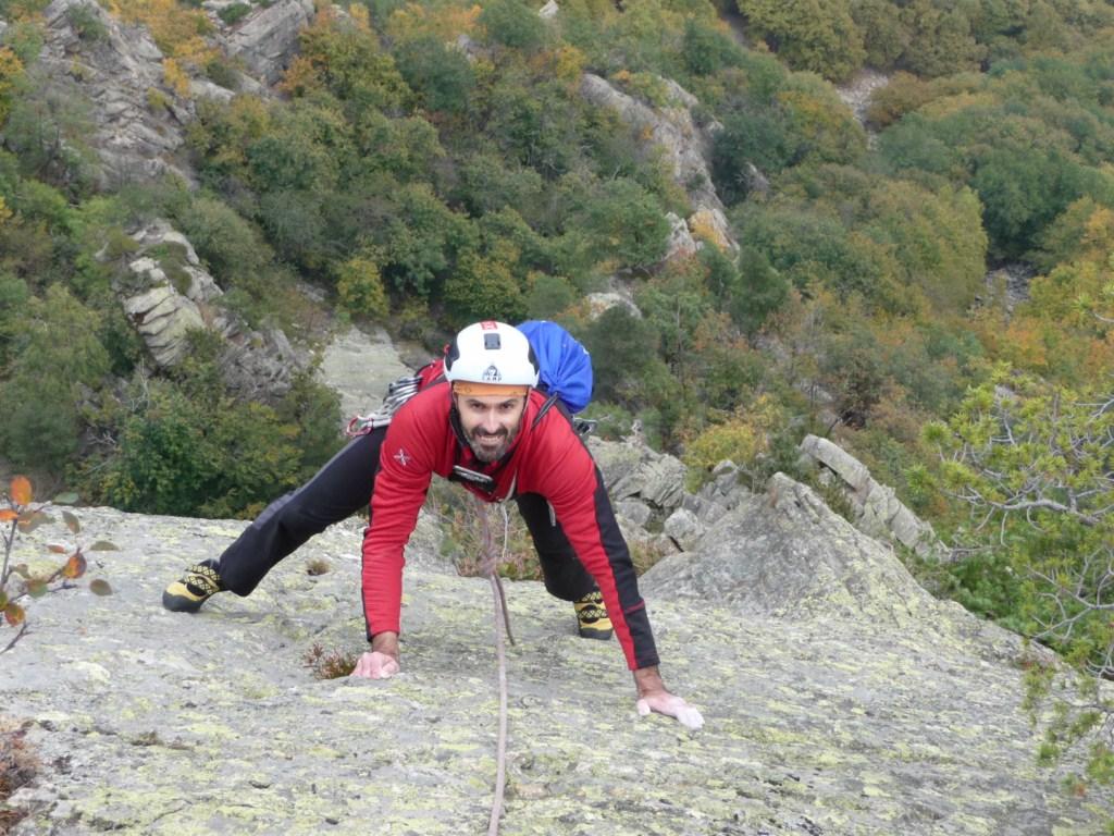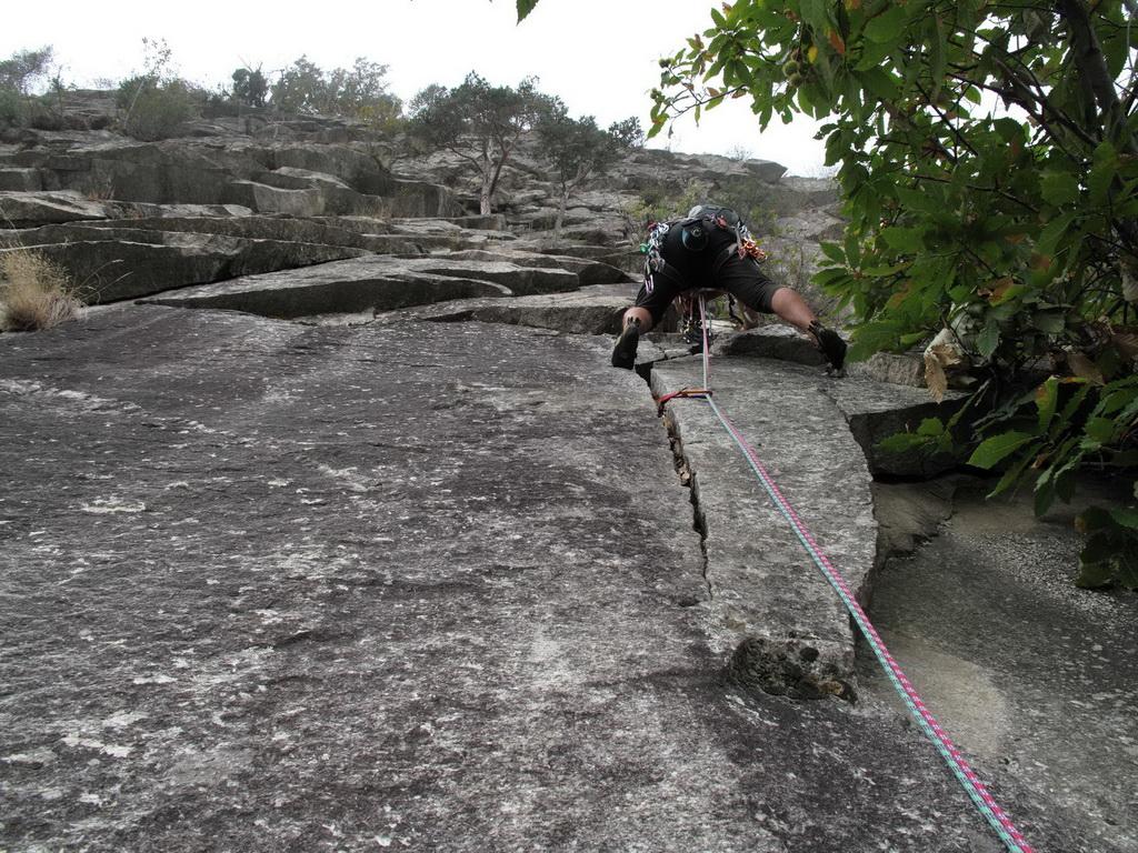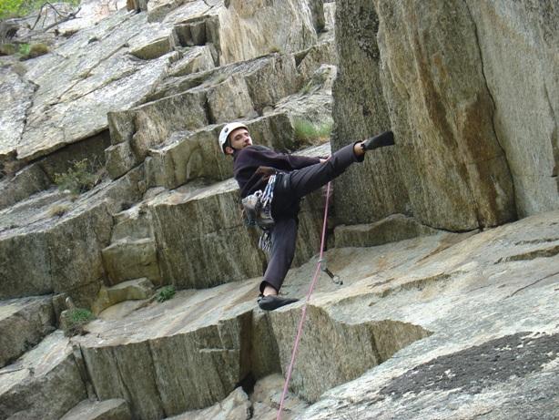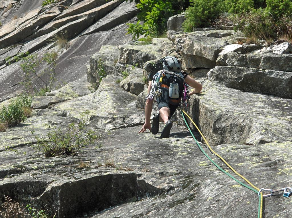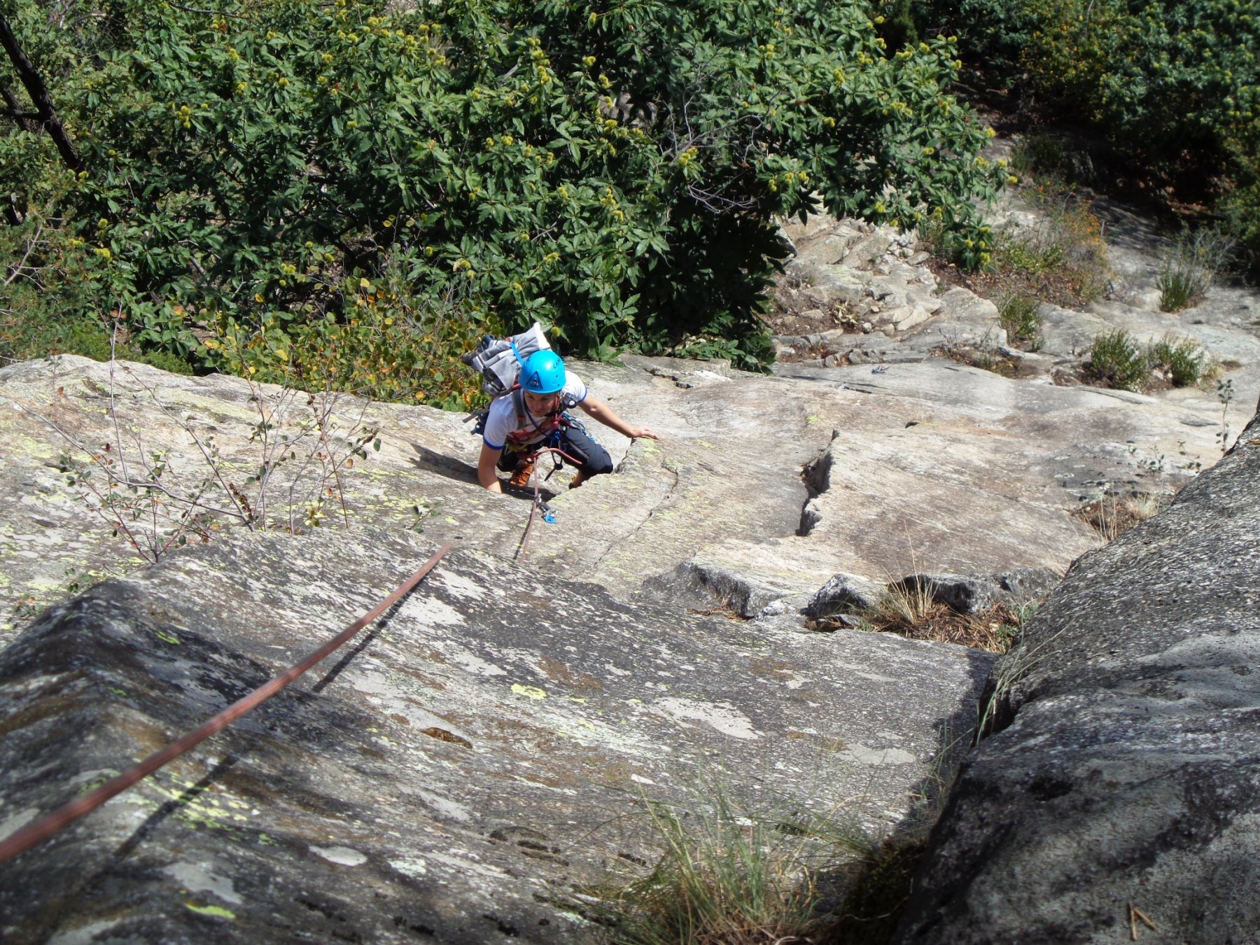 - 7) Spostarsi sulla parete a sinistra, superare una placca e poi una spaccatura dopo la quale si raggiunge un punto di sosta sulla cresta (V, V+)