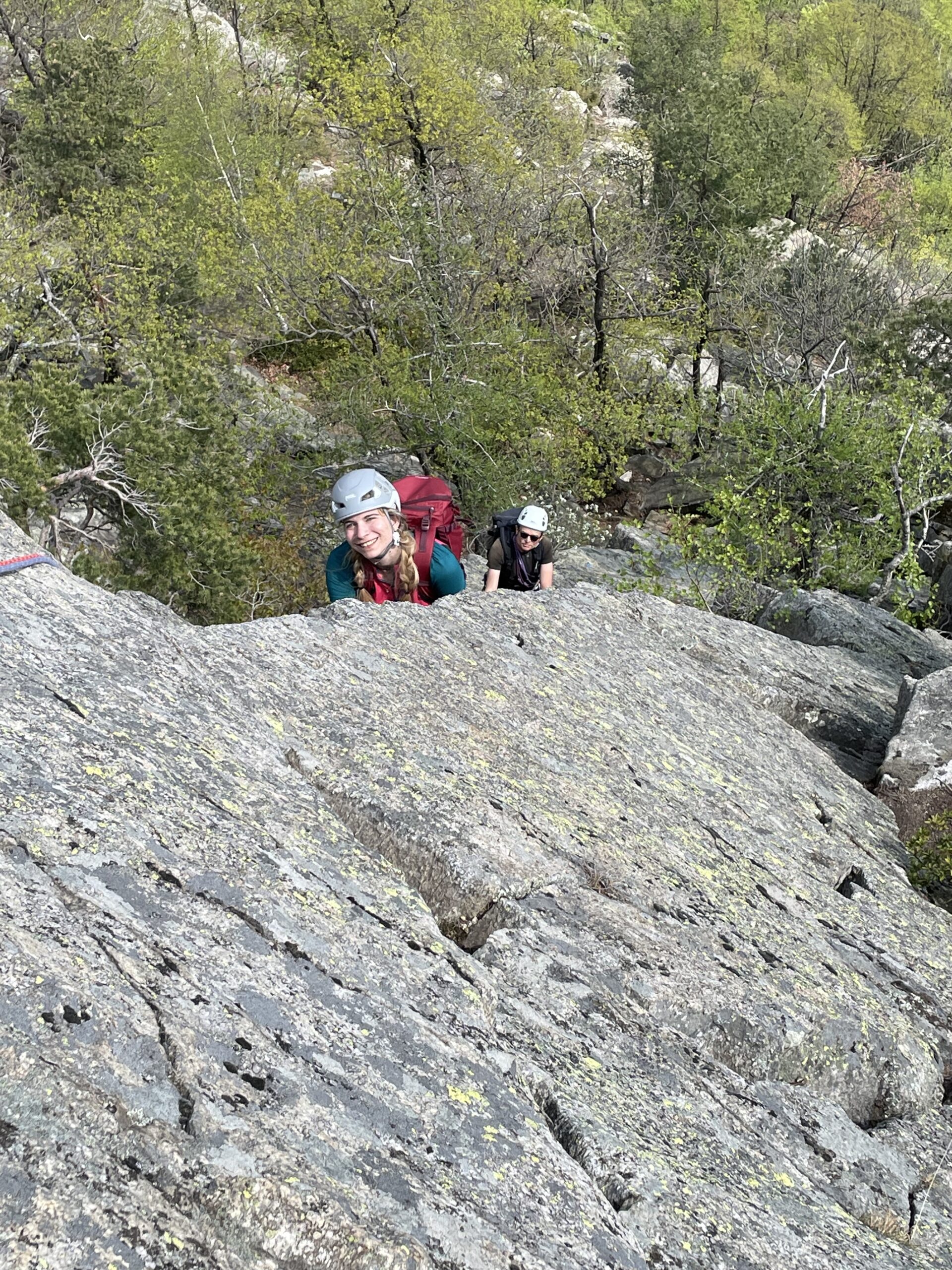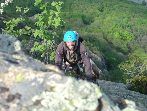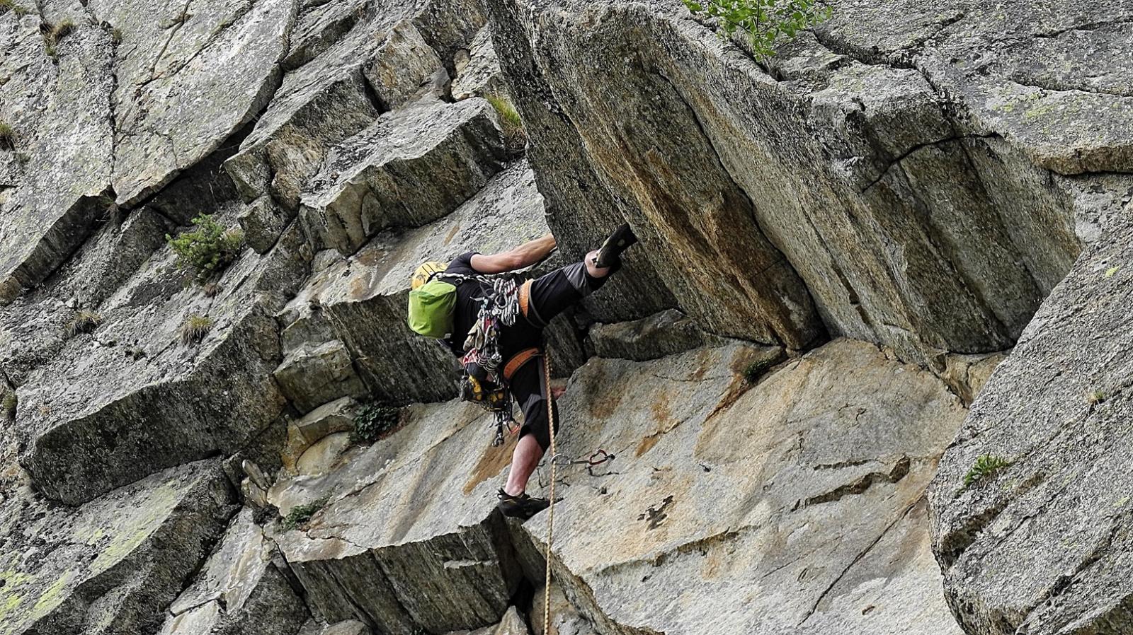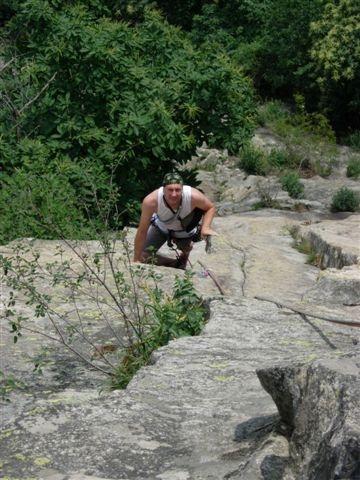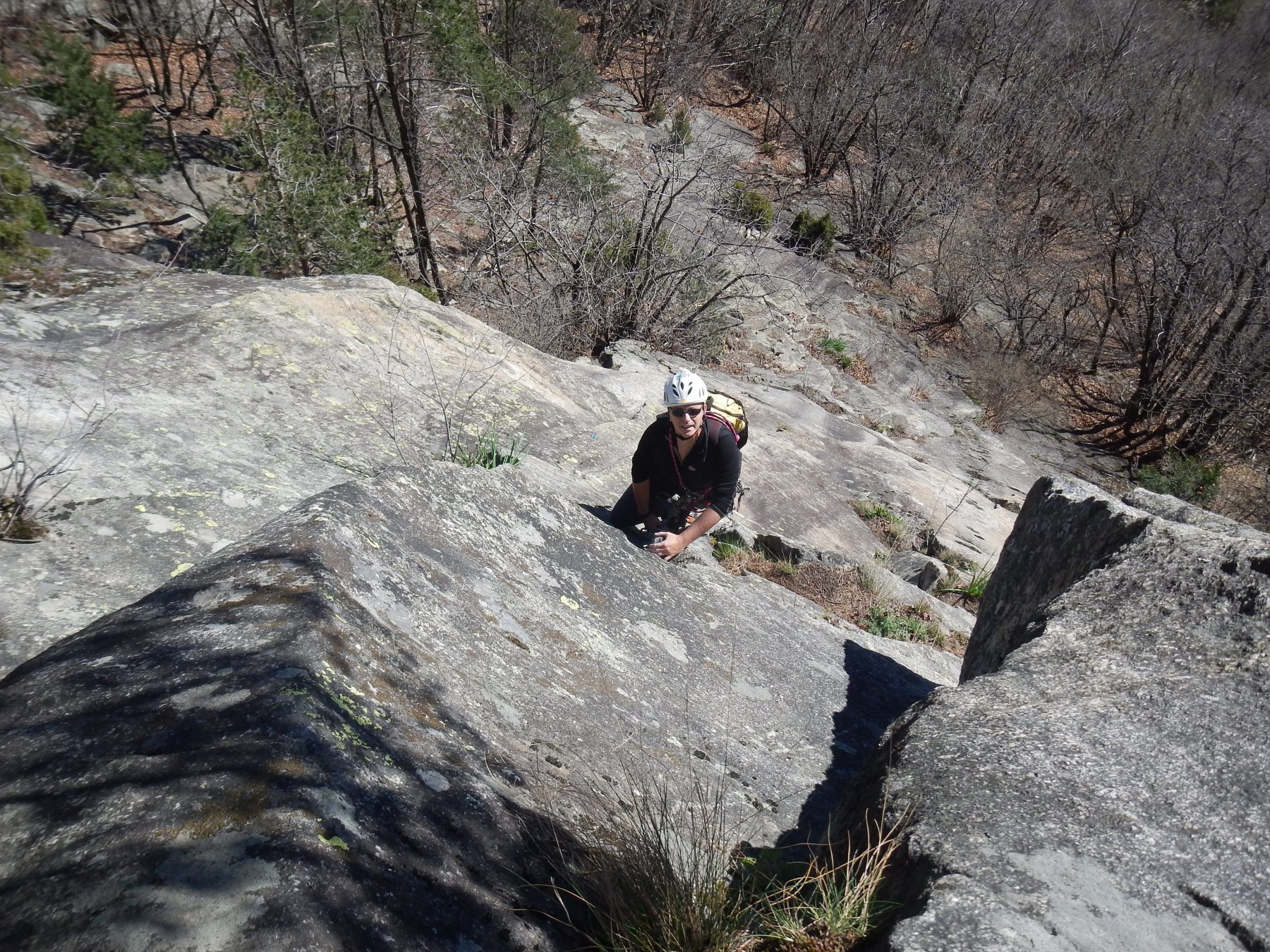 - 7) Spostarsi sulla parete a sinistra, superare una placca e poi una spaccatura dopo la quale si raggiunge un punto di sosta sulla cresta (V, V+)