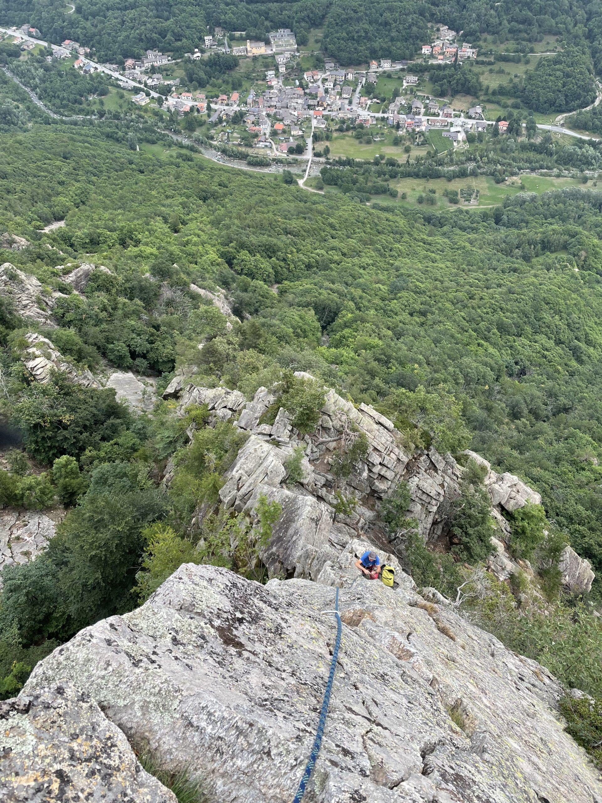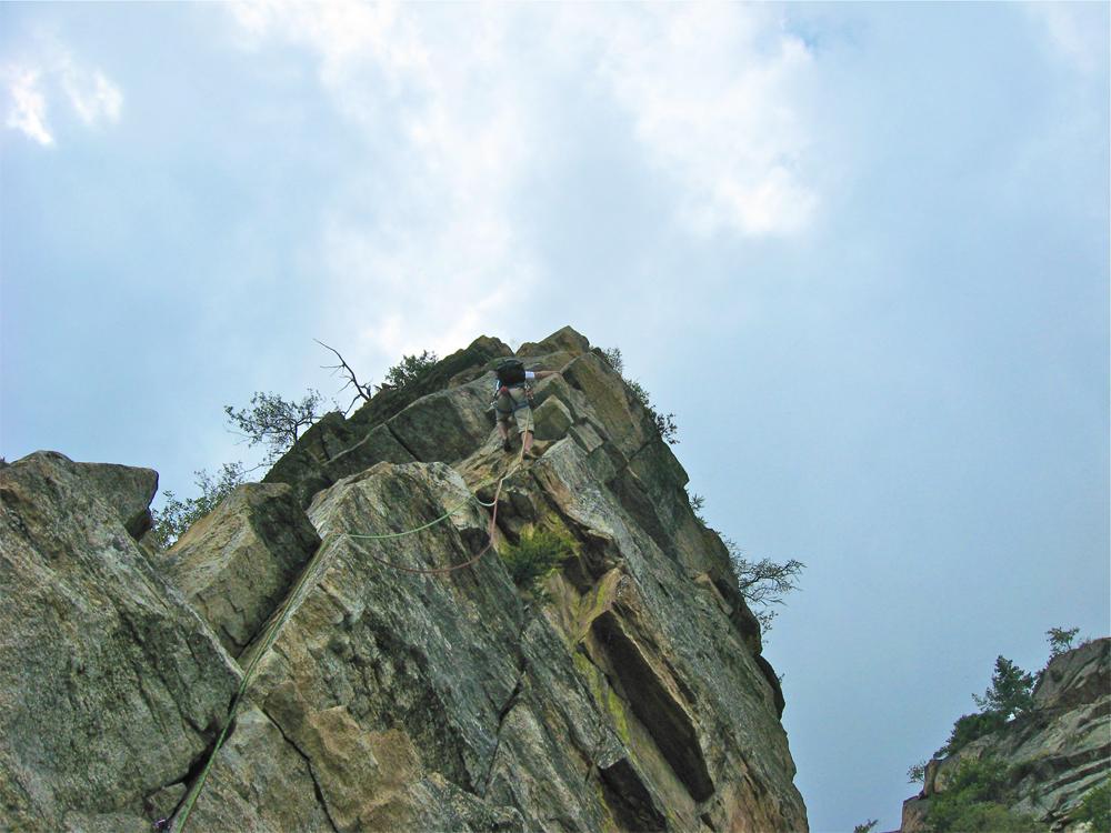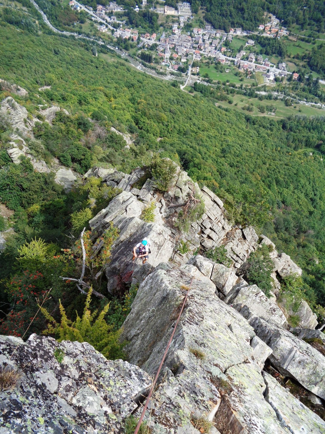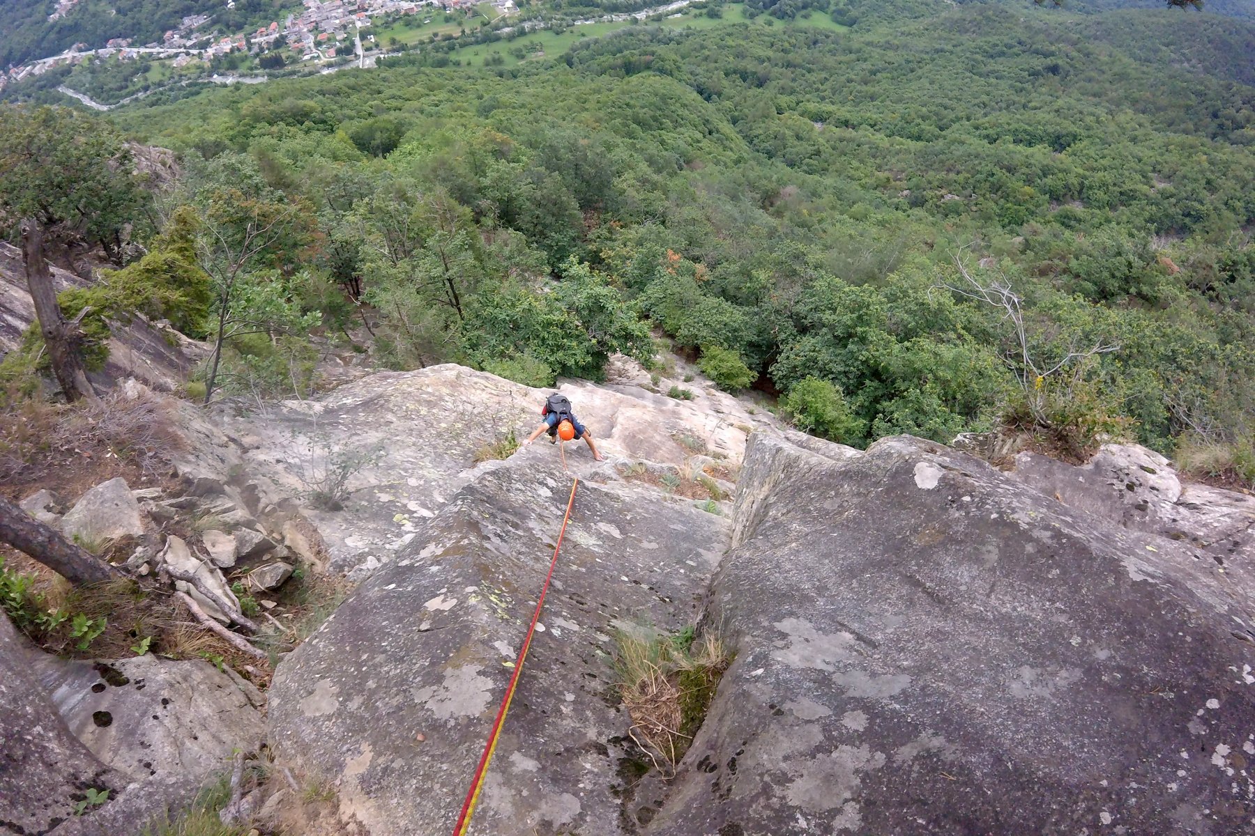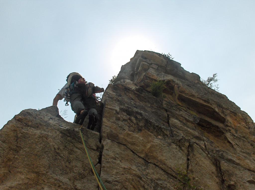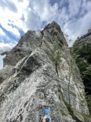 - 8) Continuare con bella e aerea arrampicata seguendo la cresta fino alla sommità della Torre (V, V+, IV). A metà tiro volendo è presente una sosta per ridurre gli attriti.