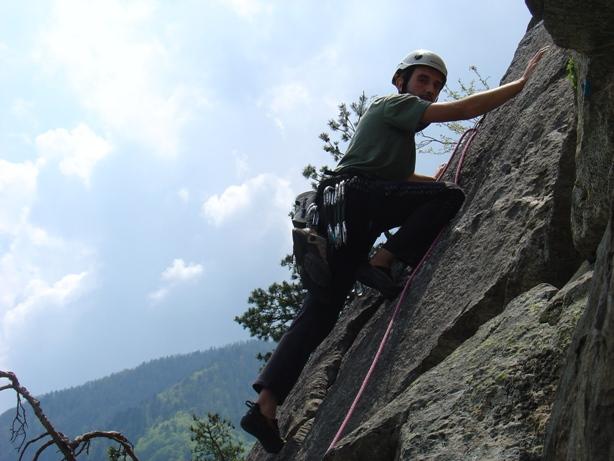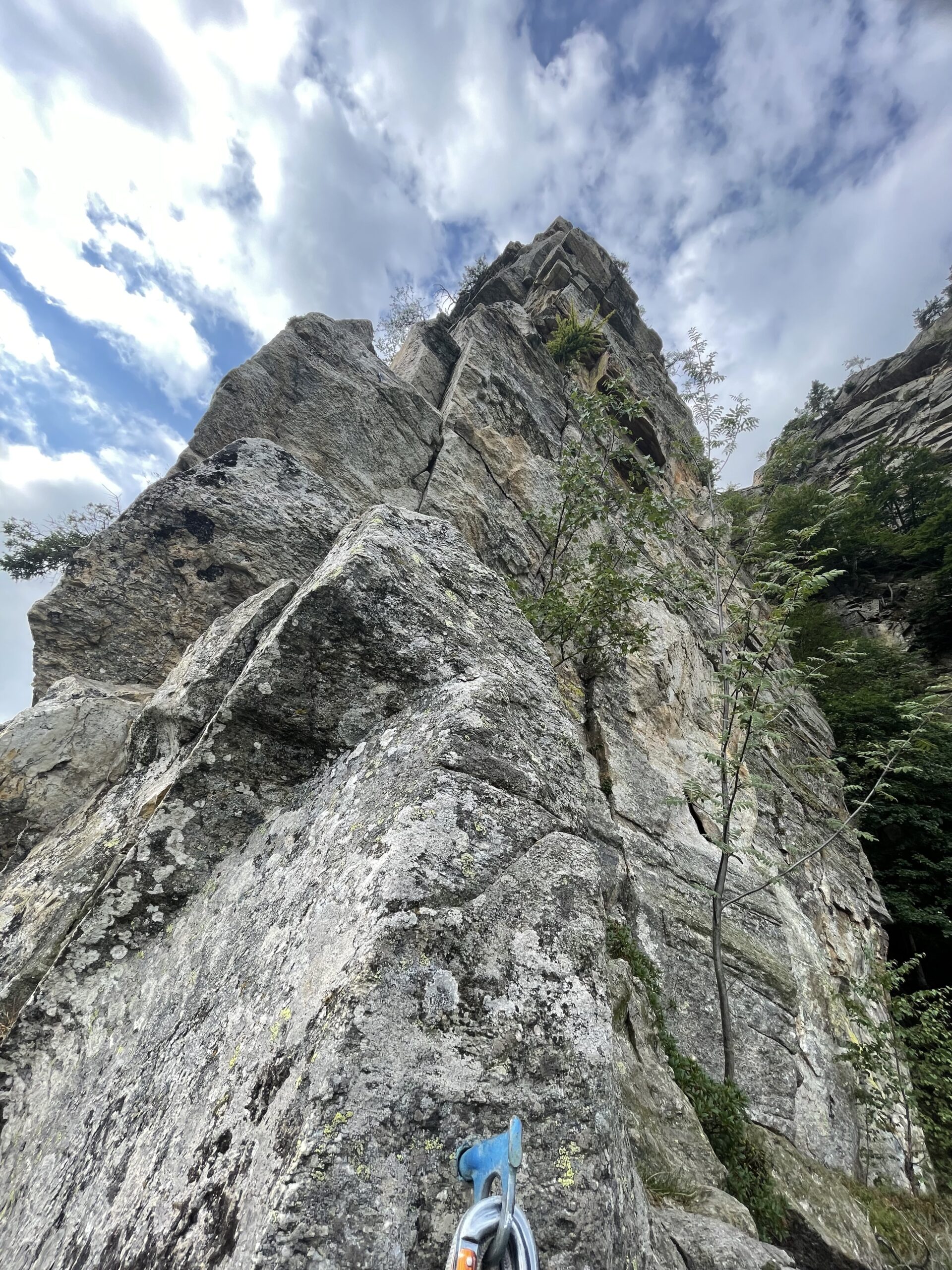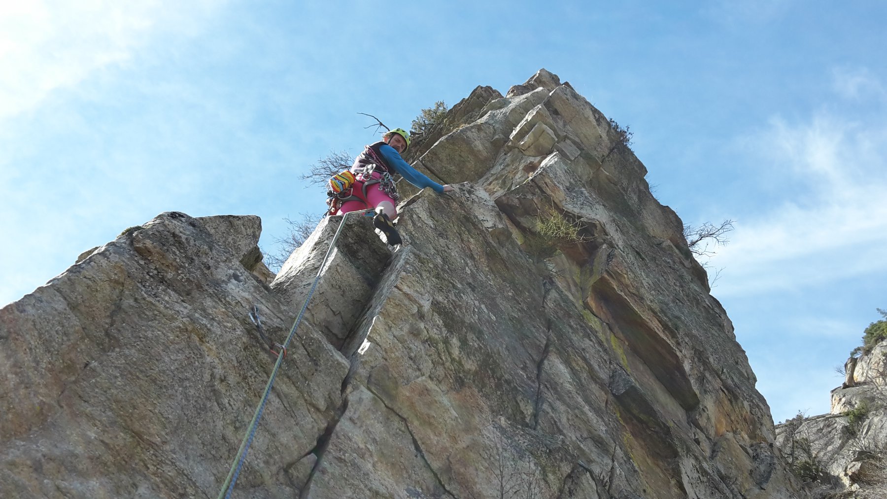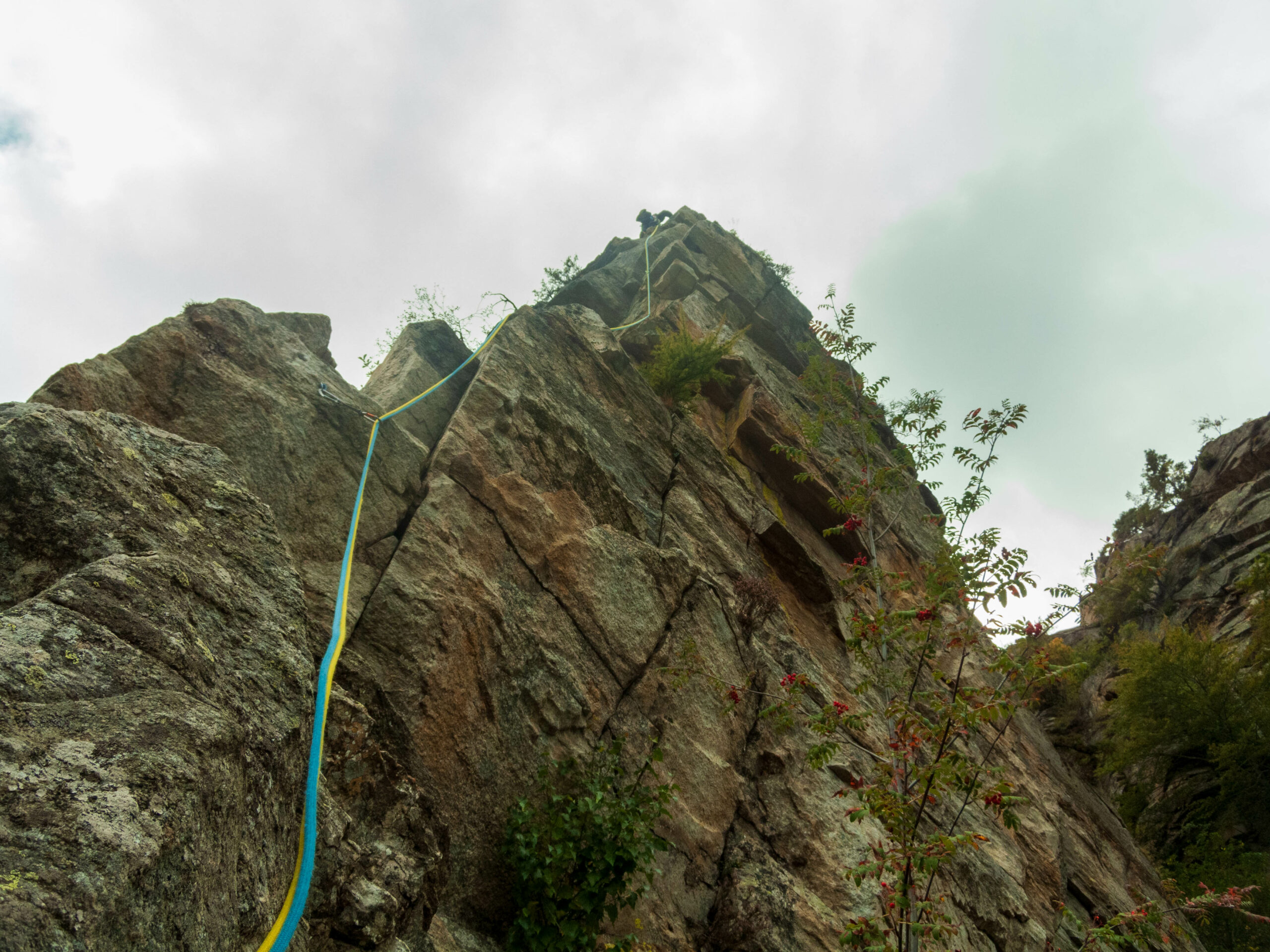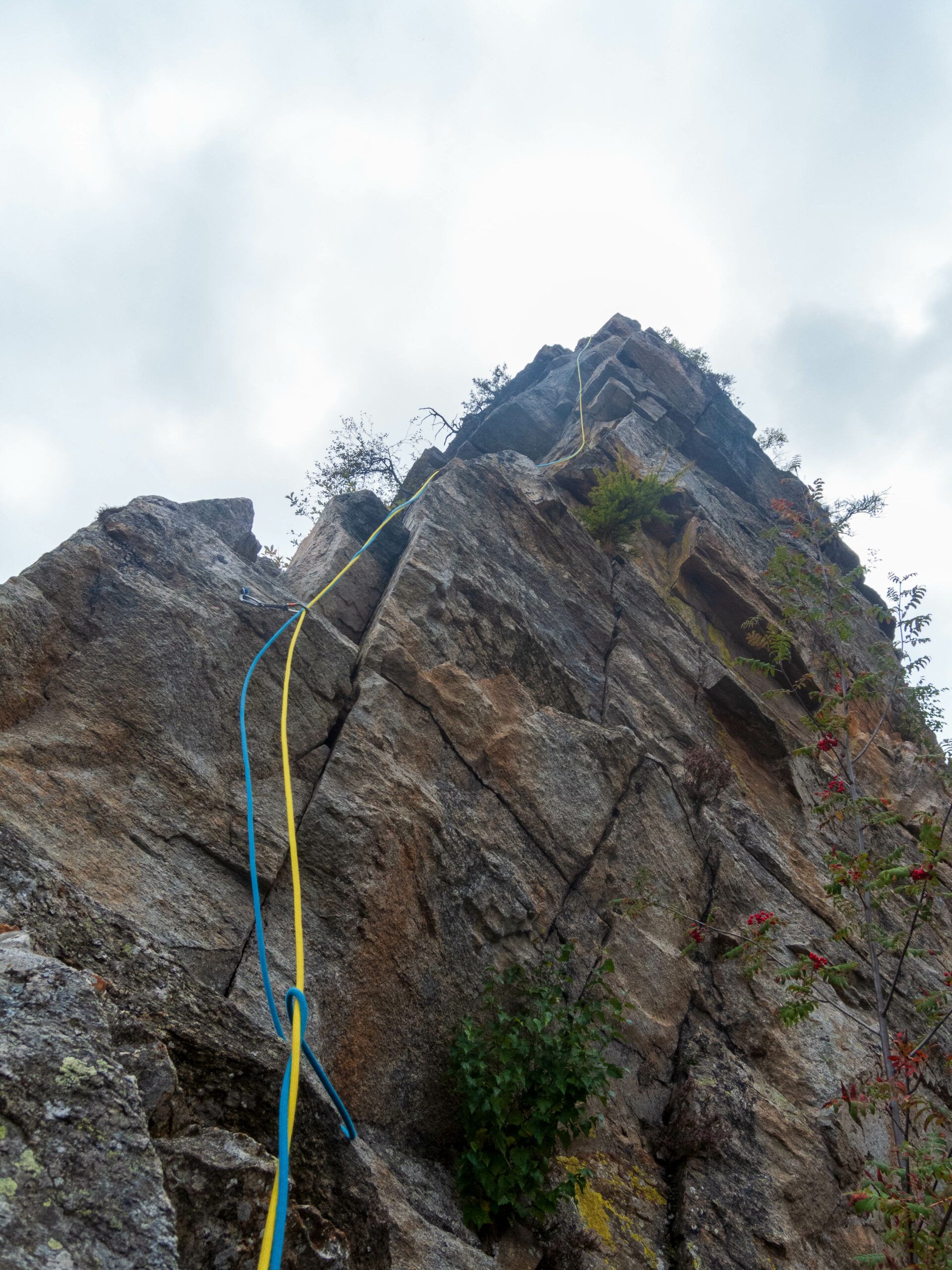 - 8) Continuare con bella e aerea arrampicata seguendo la cresta fino alla sommità della Torre (V, V+, IV). A metà tiro volendo è presente una sosta per ridurre gli attriti.