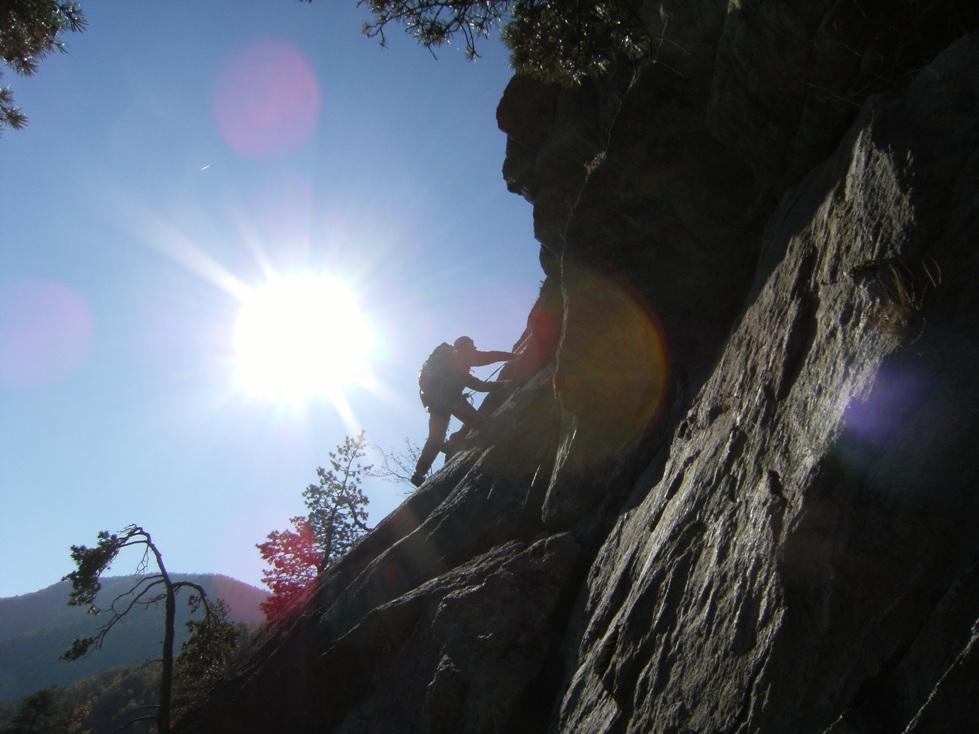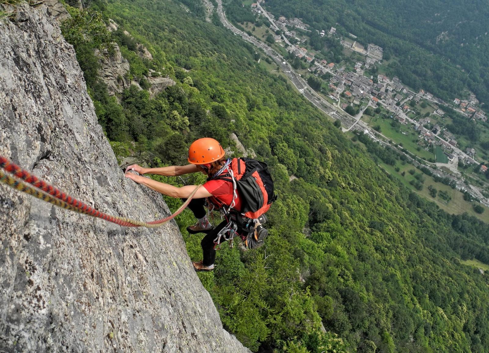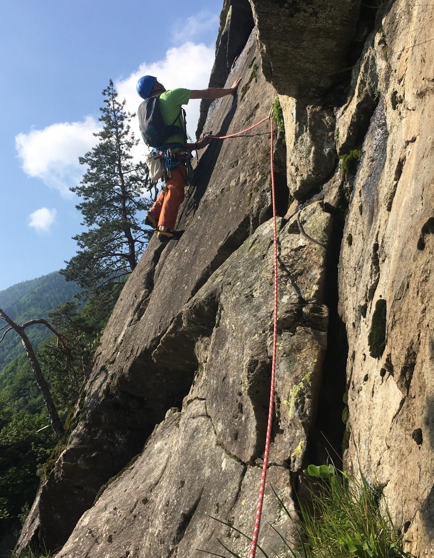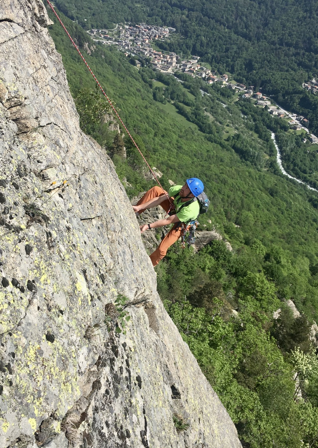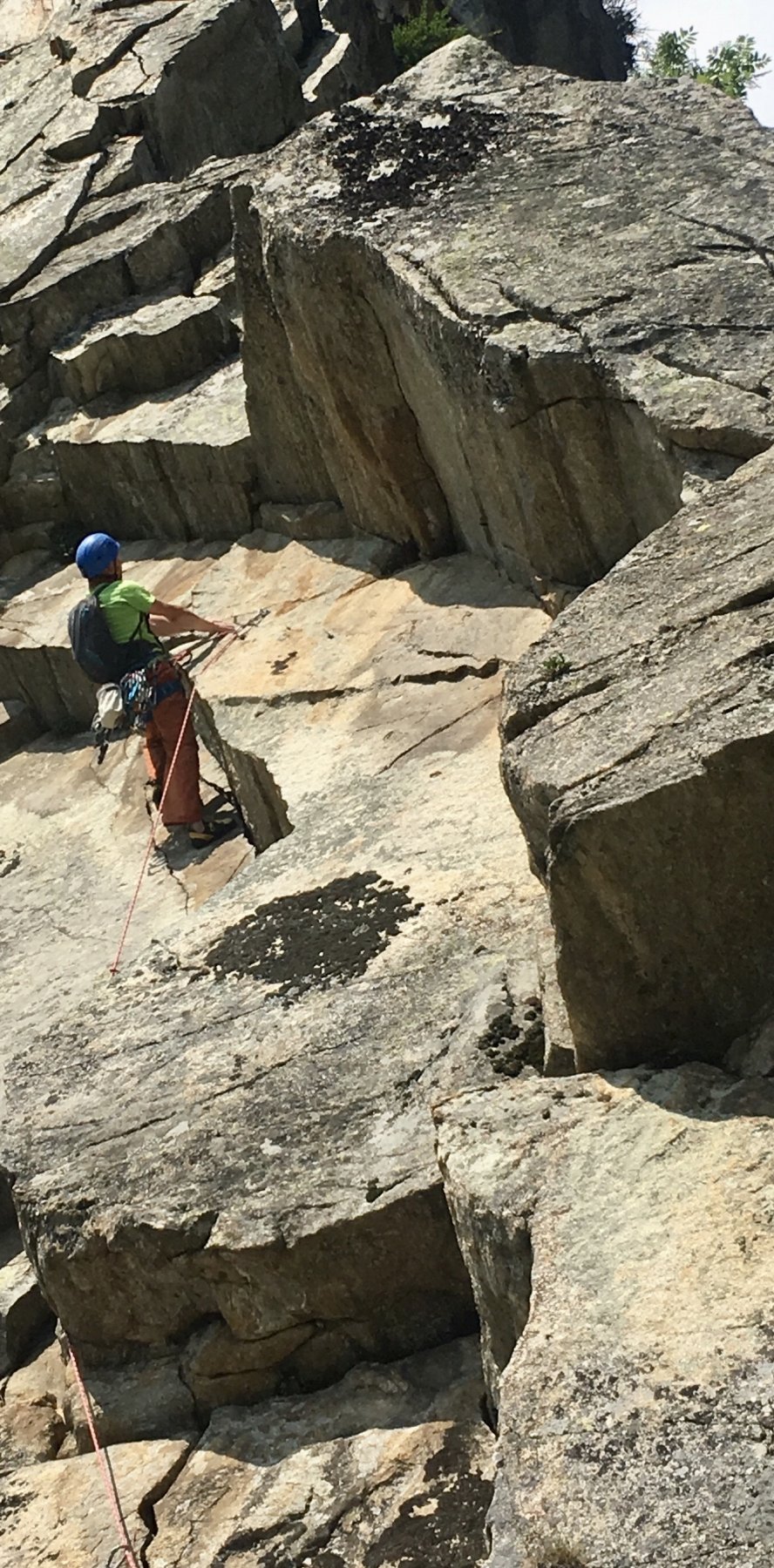 - 8) Continuare con bella e aerea arrampicata seguendo la cresta fino alla sommità della Torre (V, V+, IV). A metà tiro volendo è presente una sosta per ridurre gli attriti.