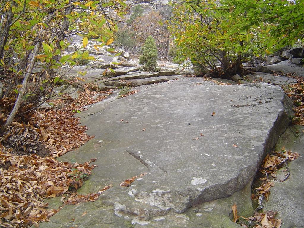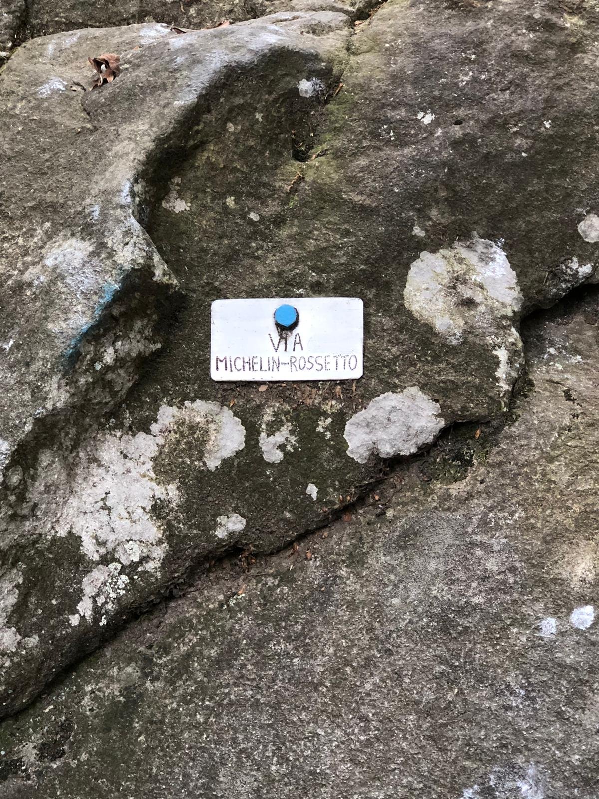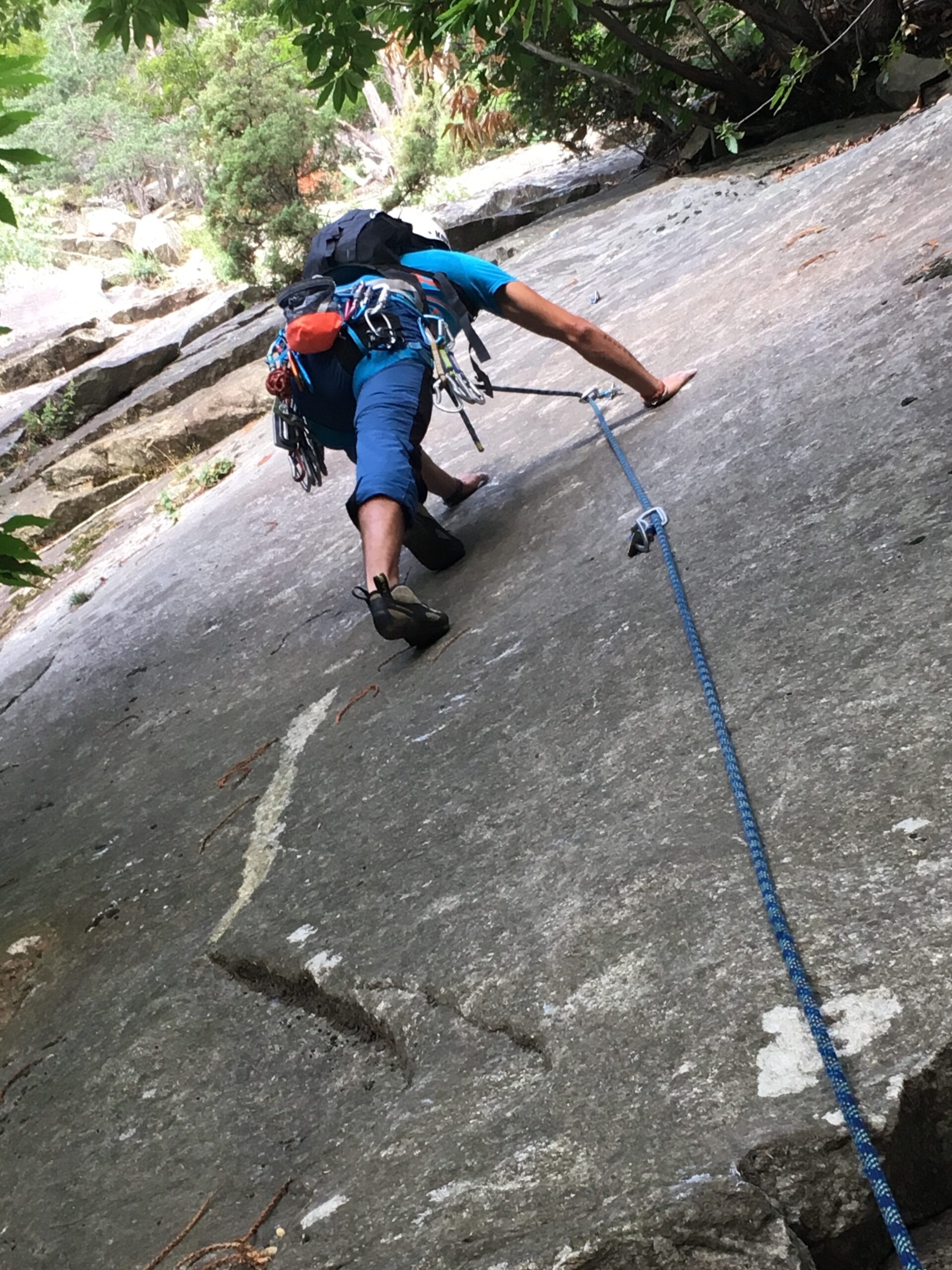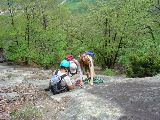 - 1) Superare in aderenza una placca grigia (V+), poi salire verso sinistra fino ad un punto di sosta su placche inclinate ( IV, V).