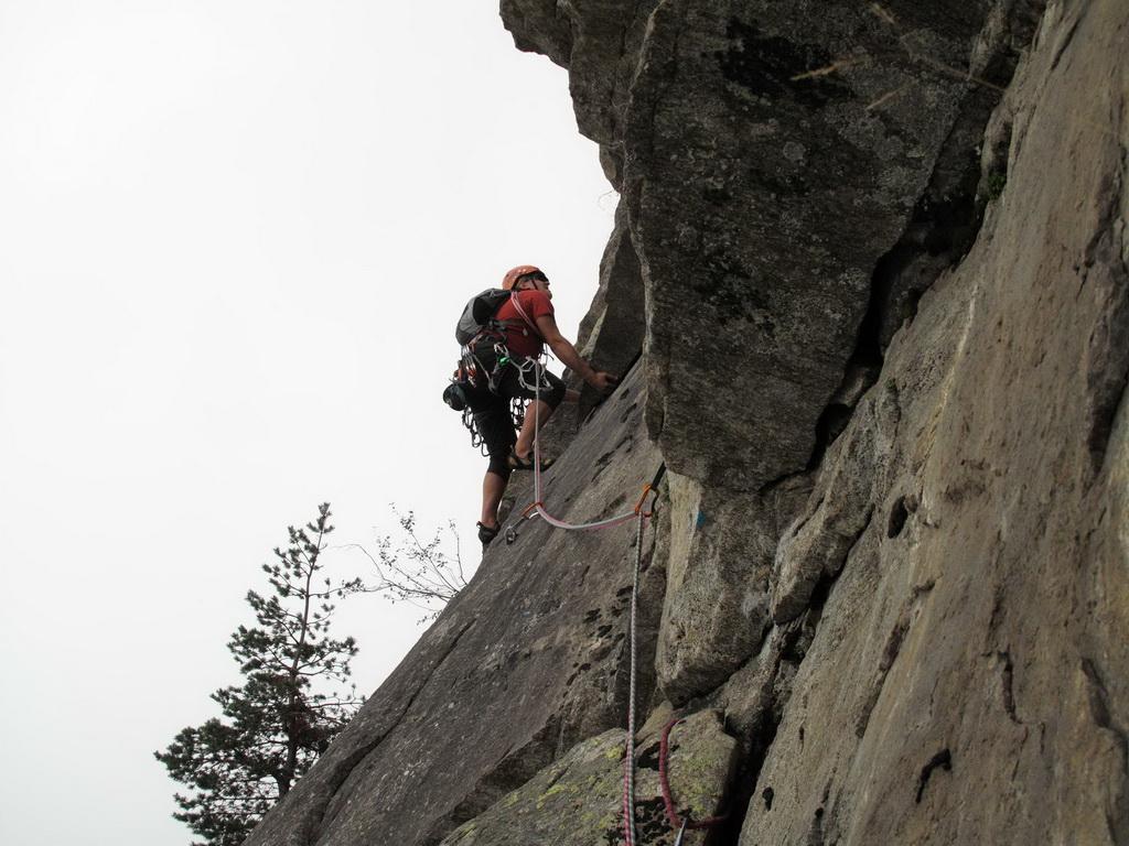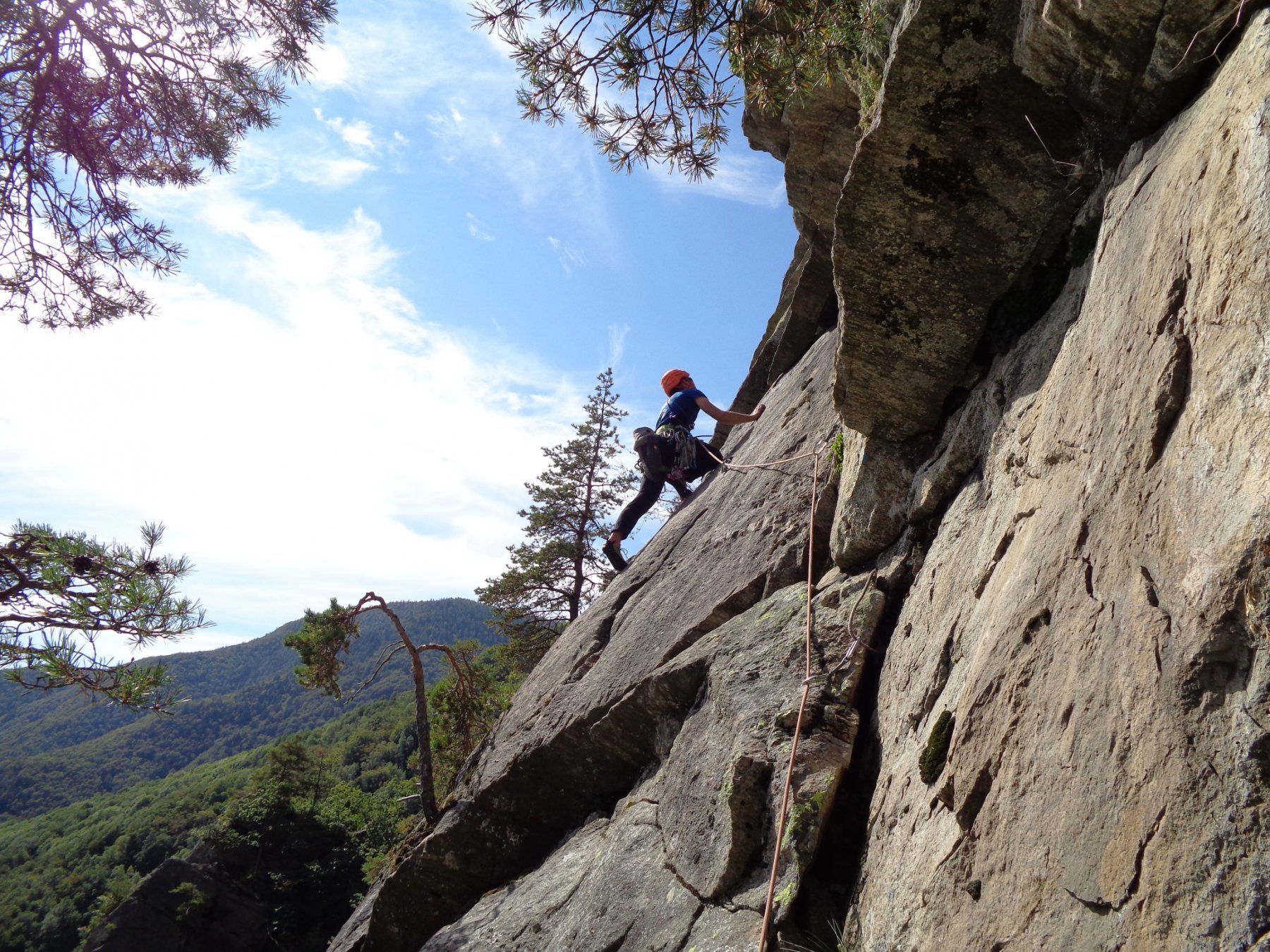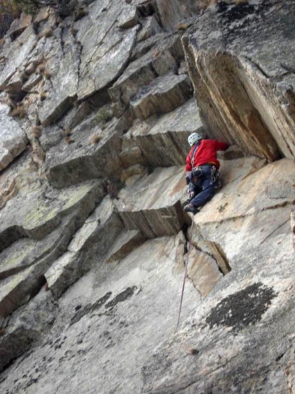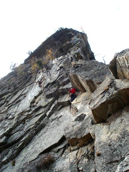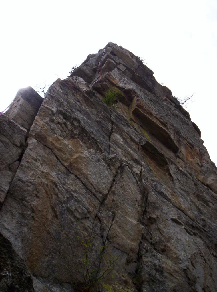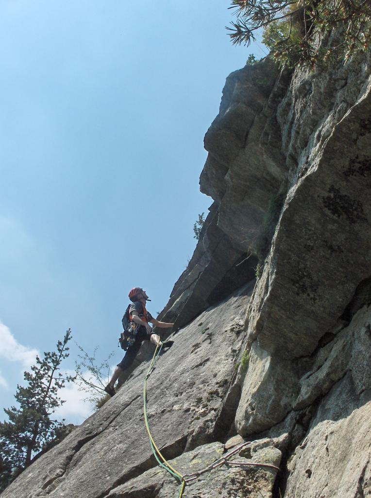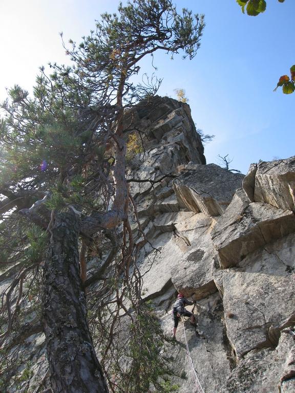 - 3) Proseguire direttamente su fessure , placche e diedri fino ad un grande pino alla base di una fascia strapiombante (IV+, V+)