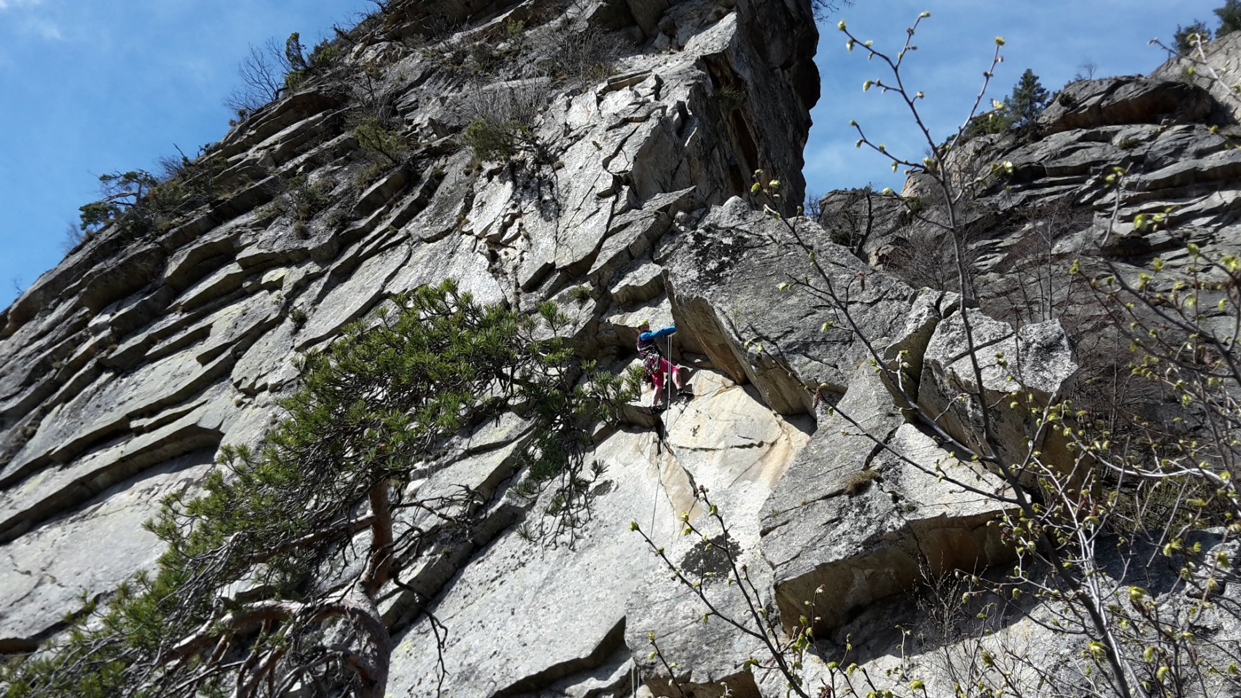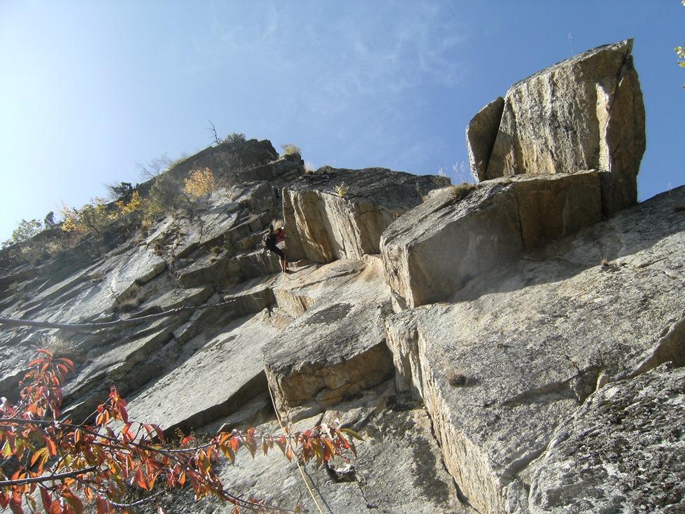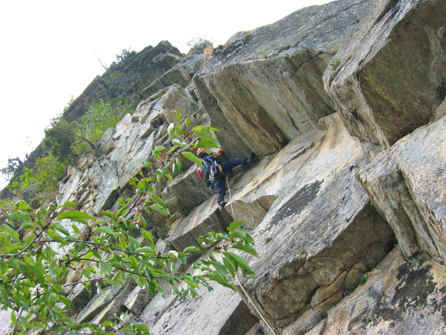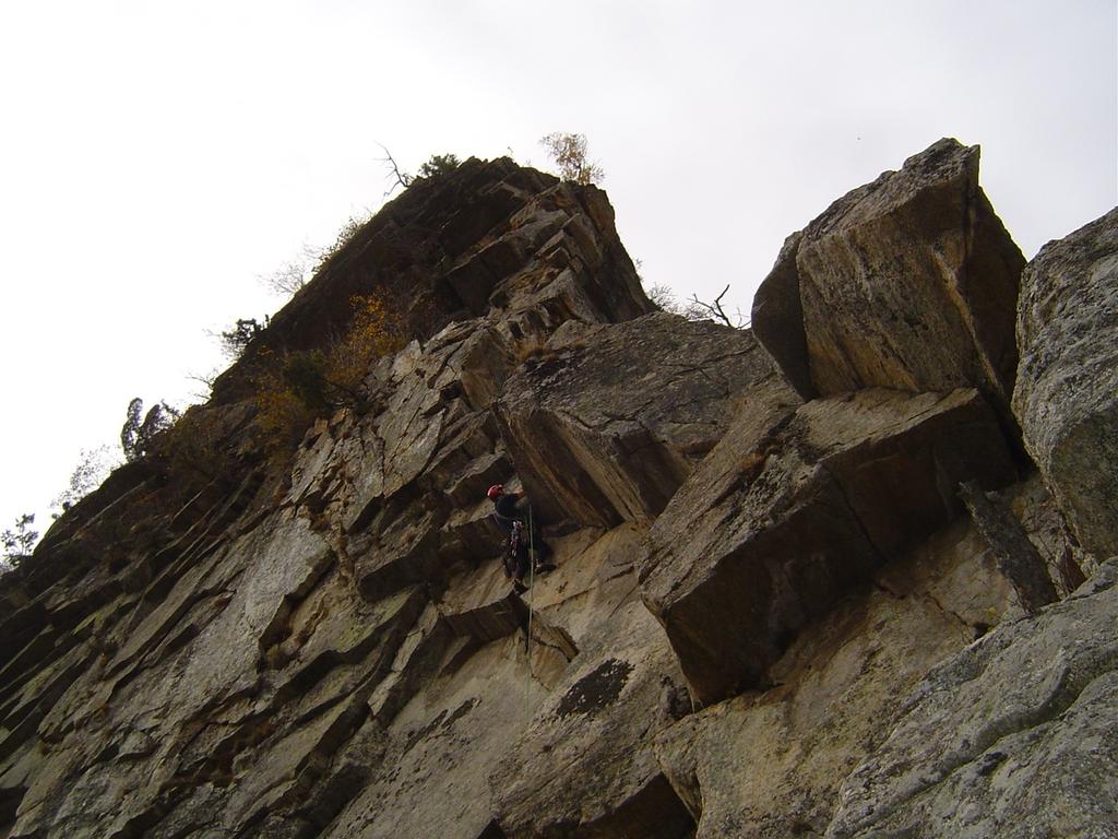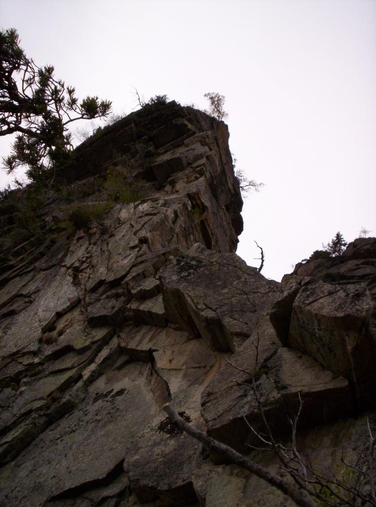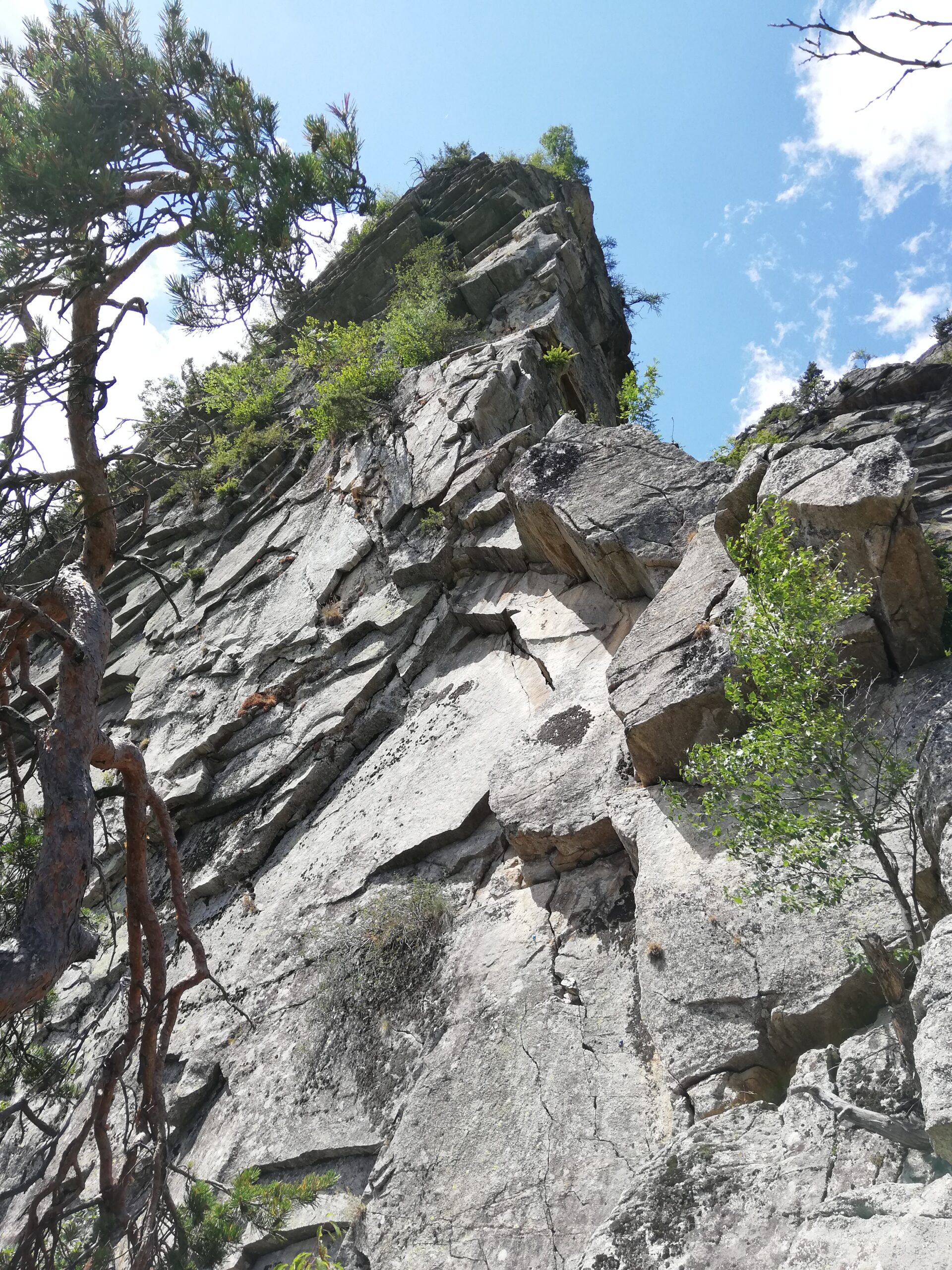 - 3) Proseguire direttamente su fessure , placche e diedri fino ad un grande pino alla base di una fascia strapiombante (IV+, V+)