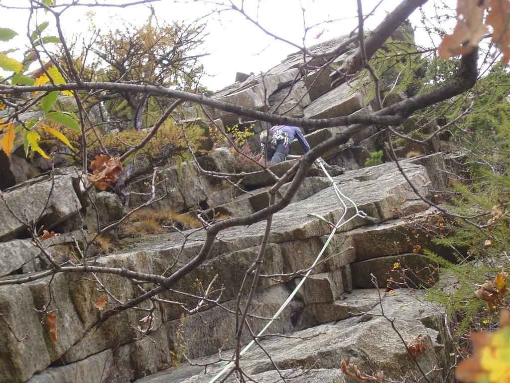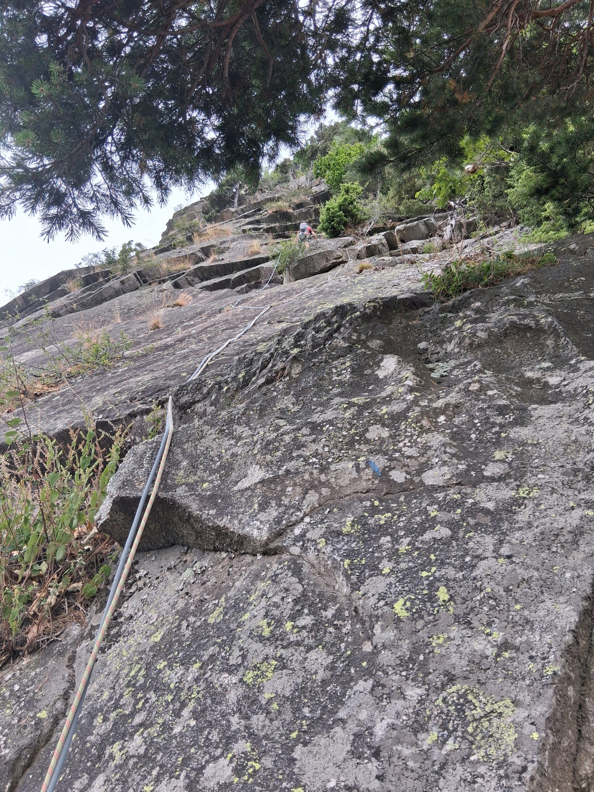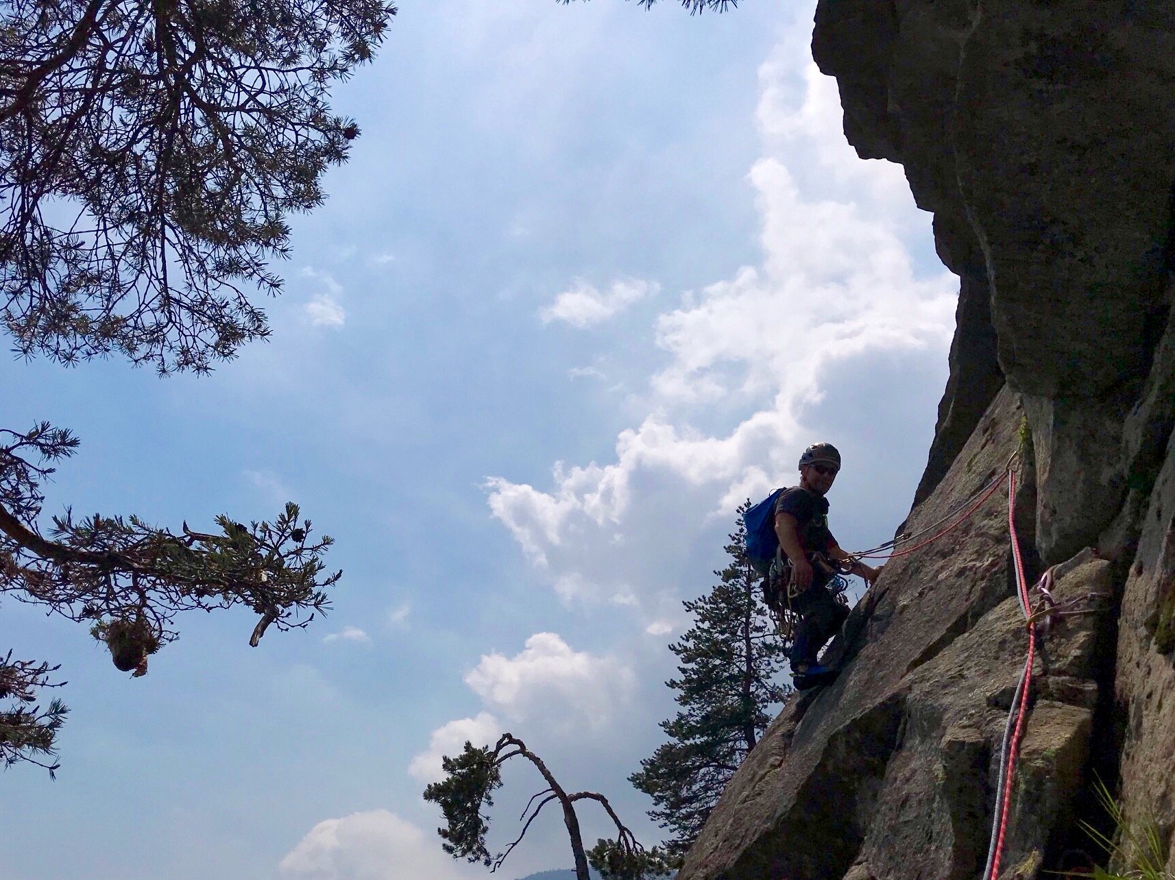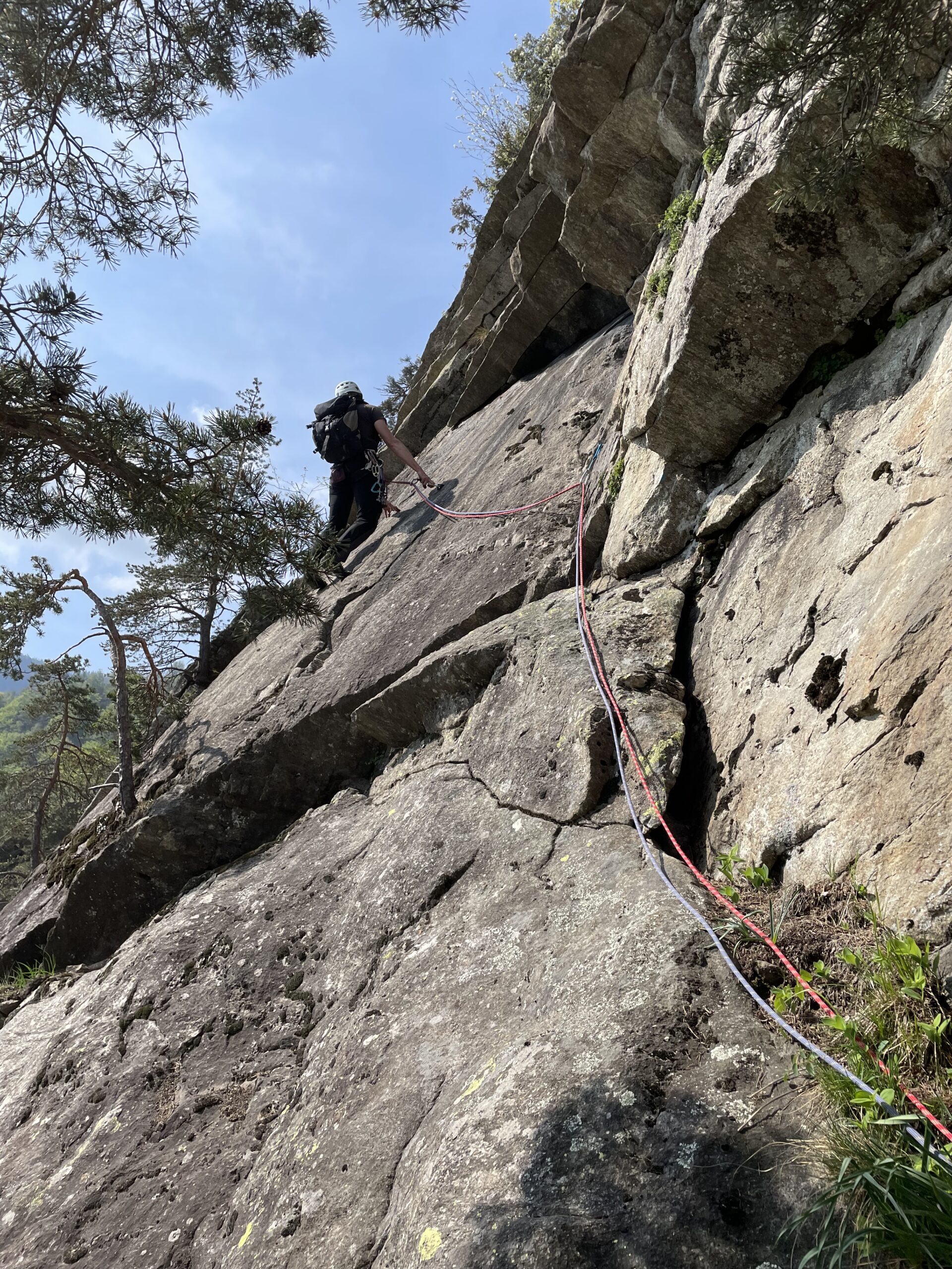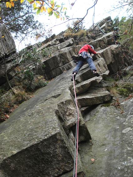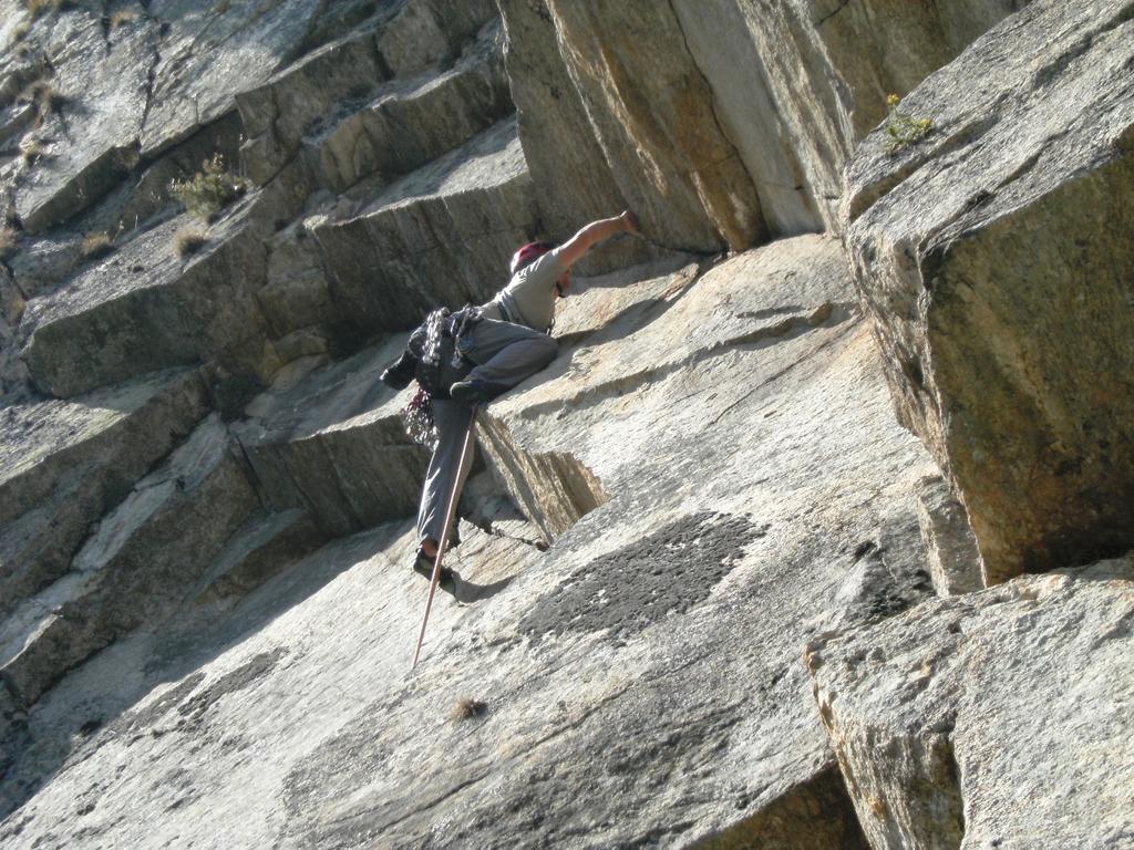 - 3) Proseguire direttamente su fessure , placche e diedri fino ad un grande pino alla base di una fascia strapiombante (IV+, V+)