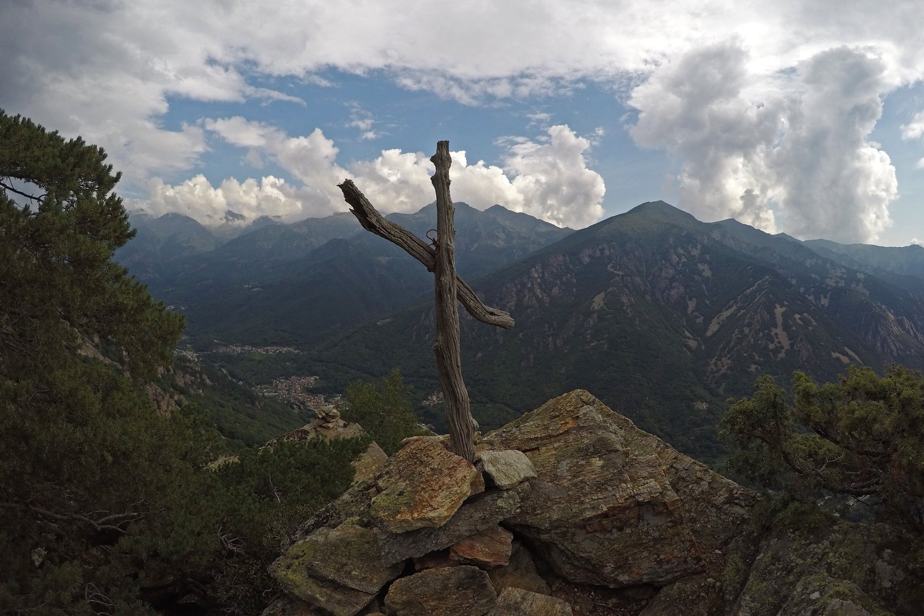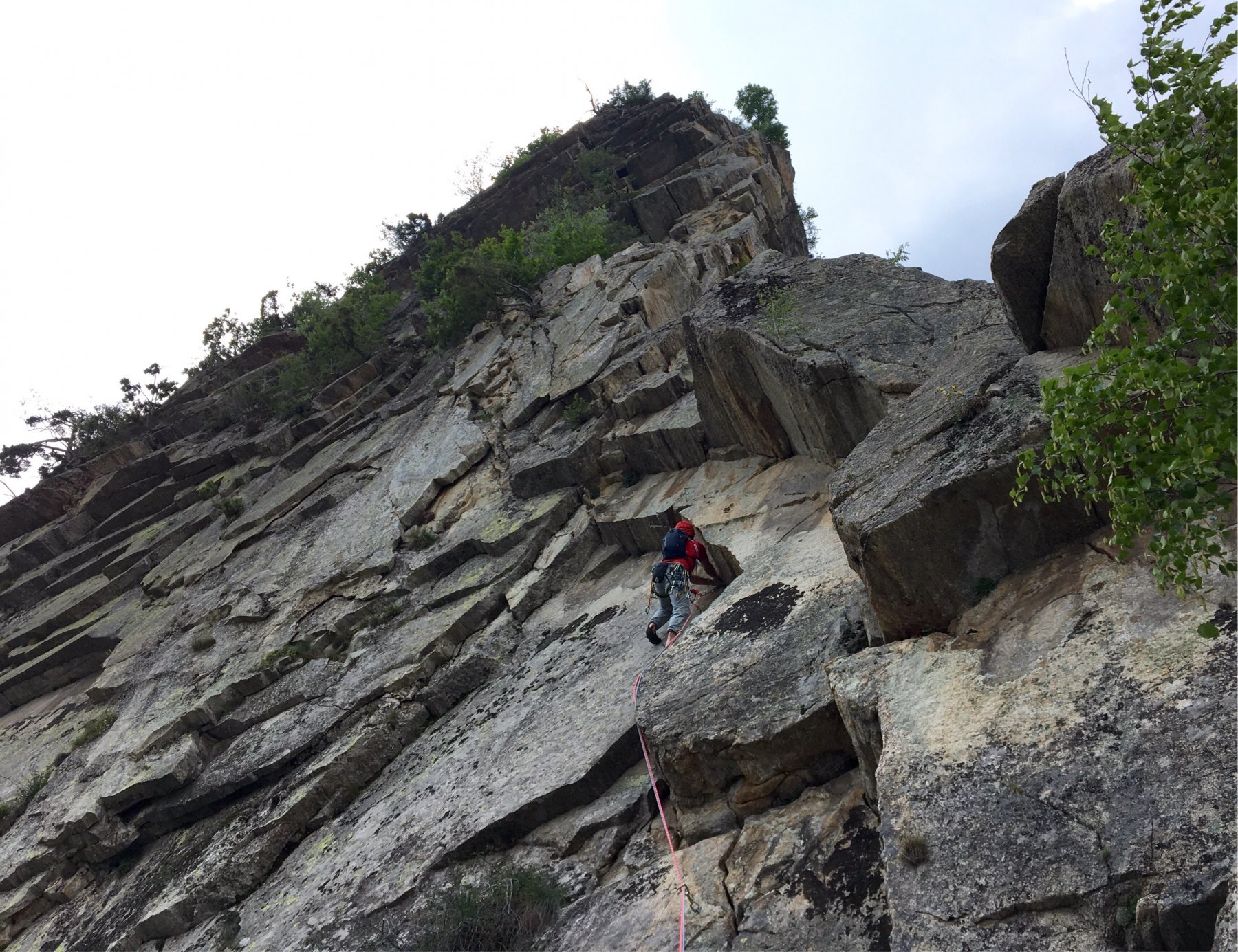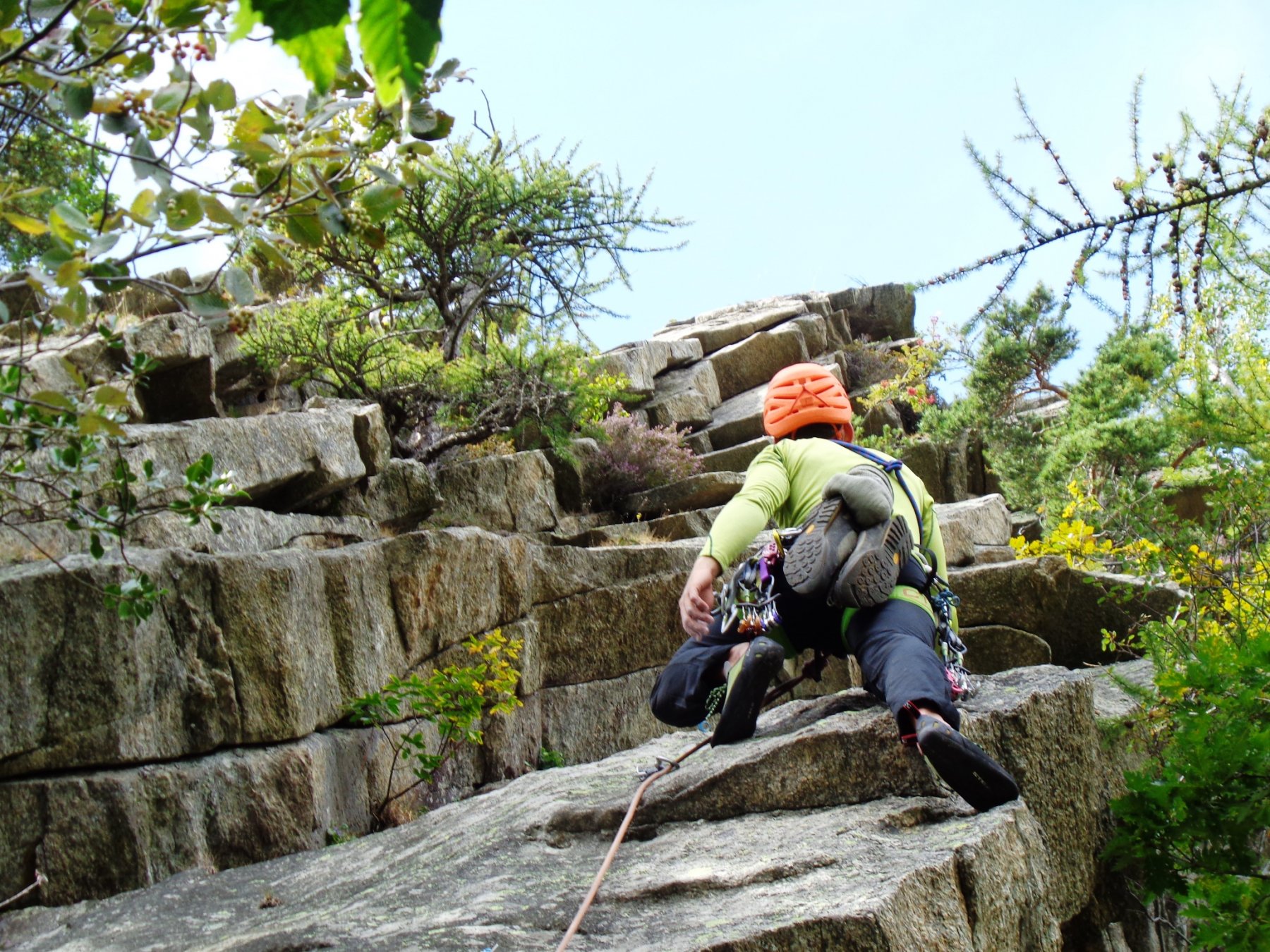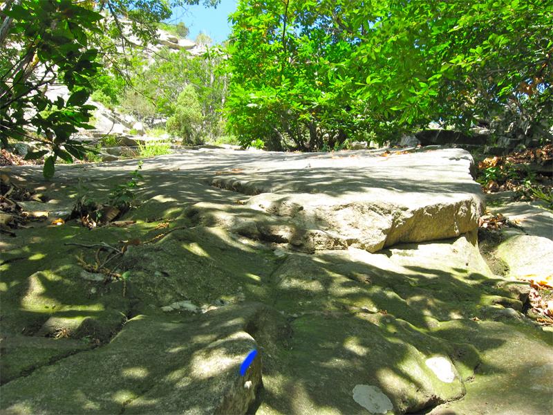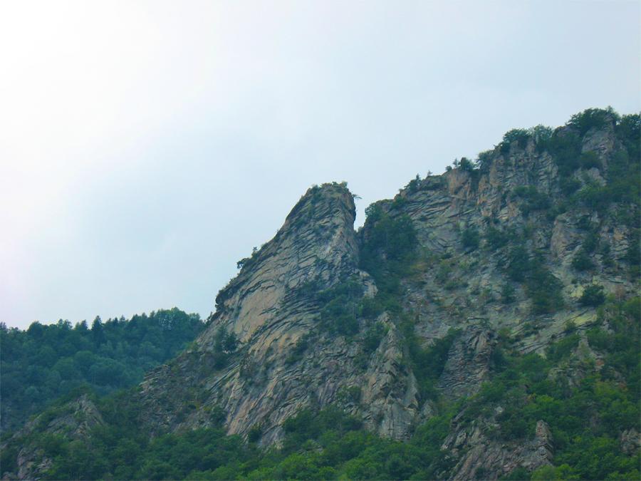 - 3) Proseguire direttamente su fessure , placche e diedri fino ad un grande pino alla base di una fascia strapiombante (IV+, V+)
