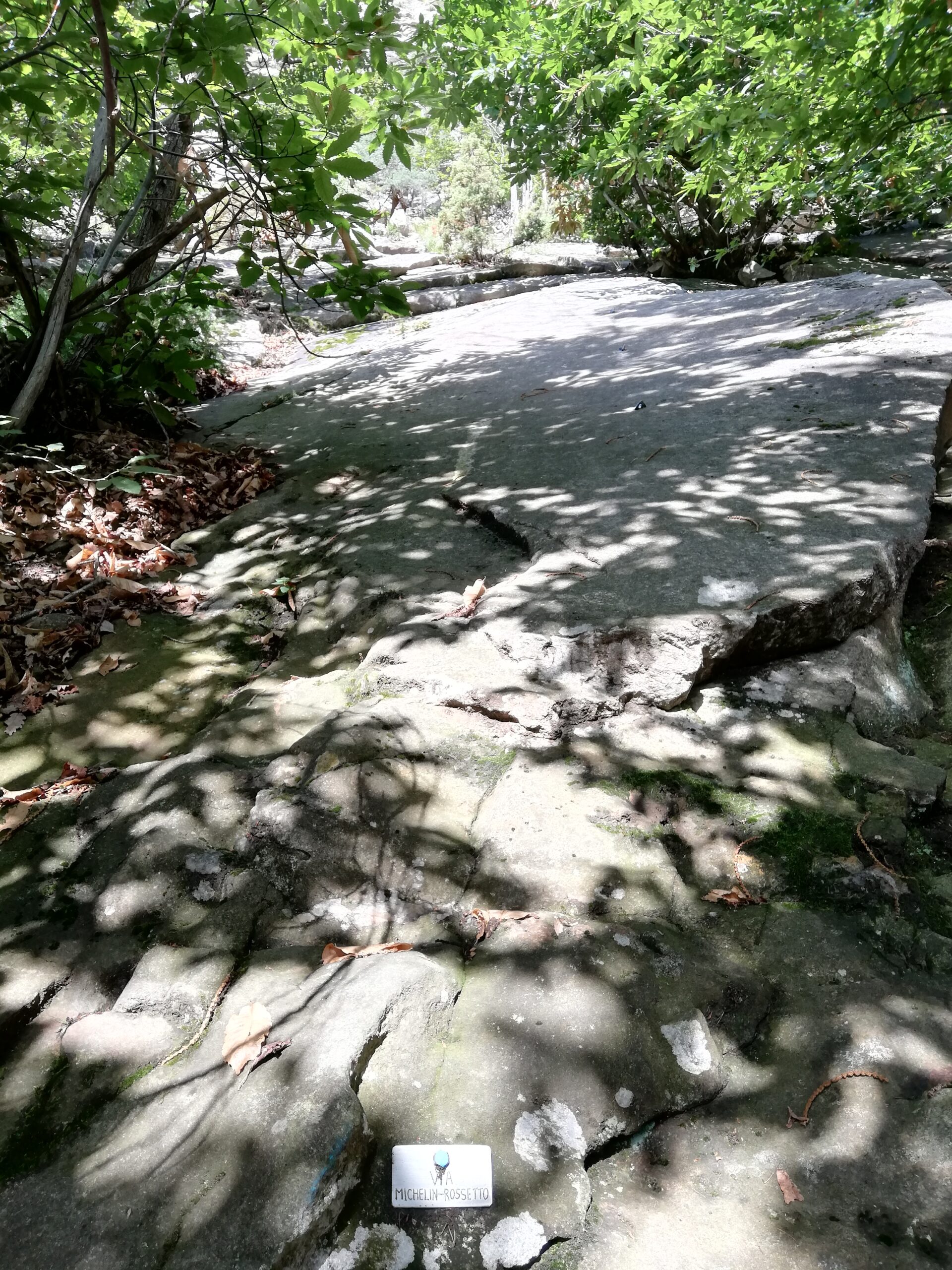 - 5) Superare verso sinistra una grande placca inclinata (IV, V), poi un leggero strapiombo e altre placche più ripide fino a raggiungere, a destra, un terrazzo con piante (IV, V)