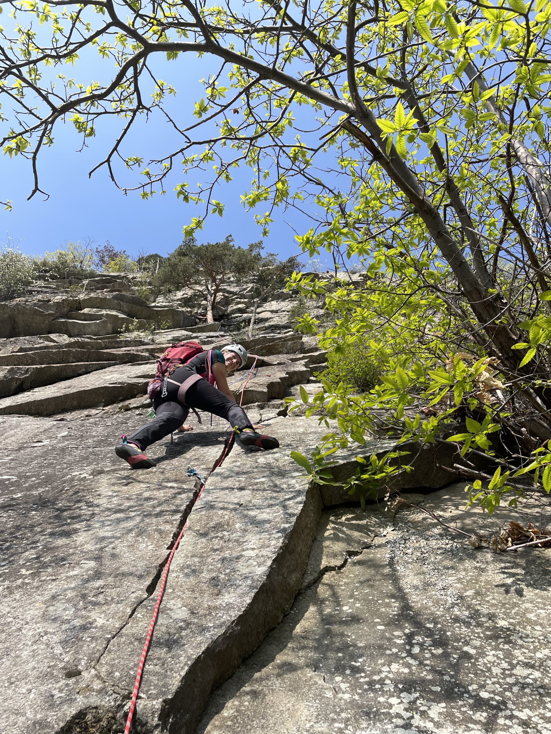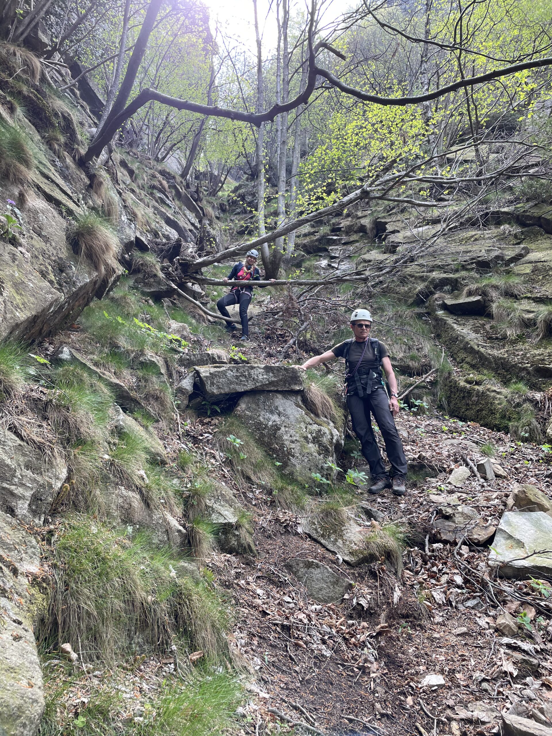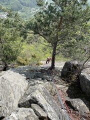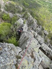 Bella via di media difficoltà che comprende diverse tecniche di arrampicata, tra placche, boulder e strapiombini da superare. Da rinforzare con fettucce le soste sugli alberi. Spittatura ottima, ma in certi punti è stato meglio integrare, soprattutto nei tiri più alti. Ultimo tiro tirano un po’ le corde, ma non lo abbiamo comunque diviso (45 m di lunghezza). Su un paio di tiri non ci si sente per i cambi di direzione. Discesa facendo una doppia da 25 m nel vuoto e proseguendo poi nel canalone: per trovare la catena (blu Michelin) bisogna raggiungere la croce in cima e scendere leggermente verso destra, facendo molta attenzione a fare un piccolo tratto esposto slegati. Canalone particolarmente umido e bagnato in certi punti, fare molta attenzione. Durante la discesa si incontrano due indicazioni: la prima è l’attacco più alto di “Residuato Bellico”; la seconda deviazione è per raggiungere l’attacco inferiore sempre della stessa via. ATTENZIONE a non prendere la deviazione (andando quindi a sinistra), perchè si raggiunge una zona di placche da cui è impossibile riscendere. Proseguire sempre per il canalone in discesa, tenendo quindi la destra.