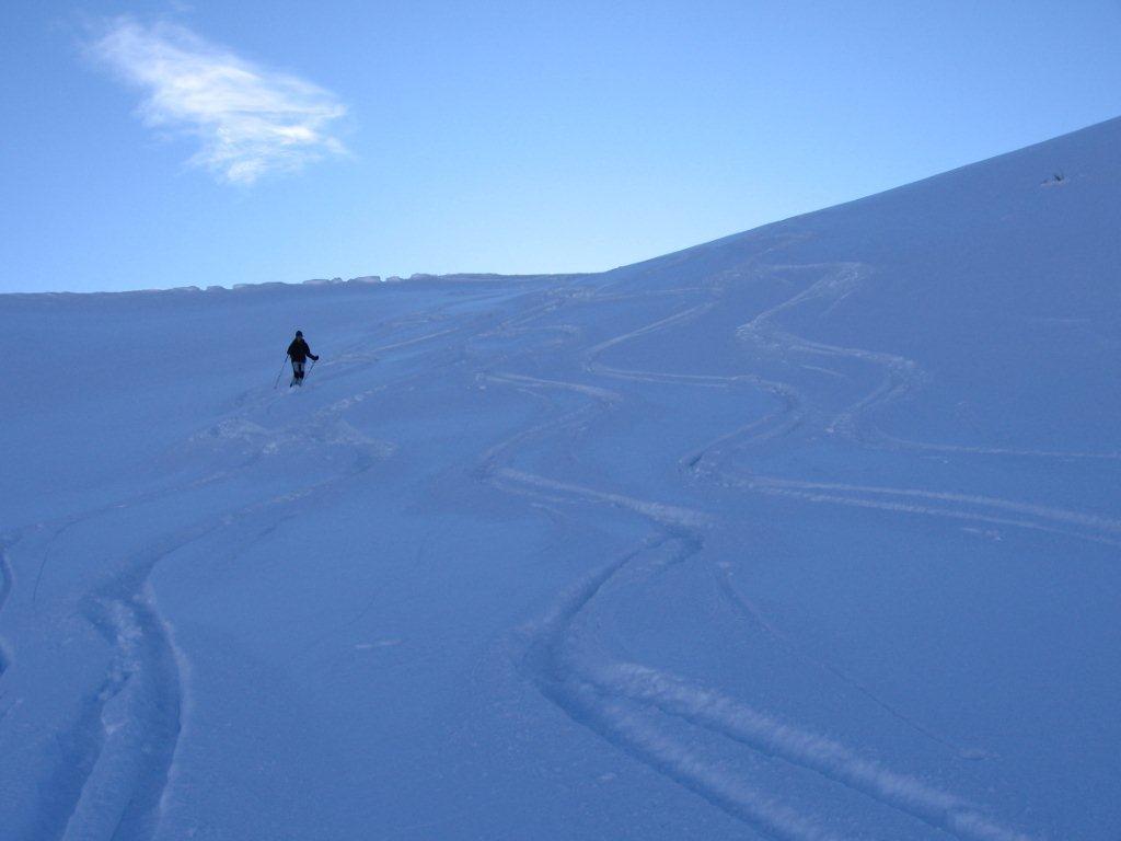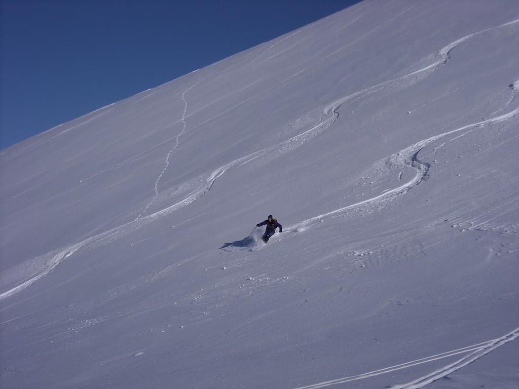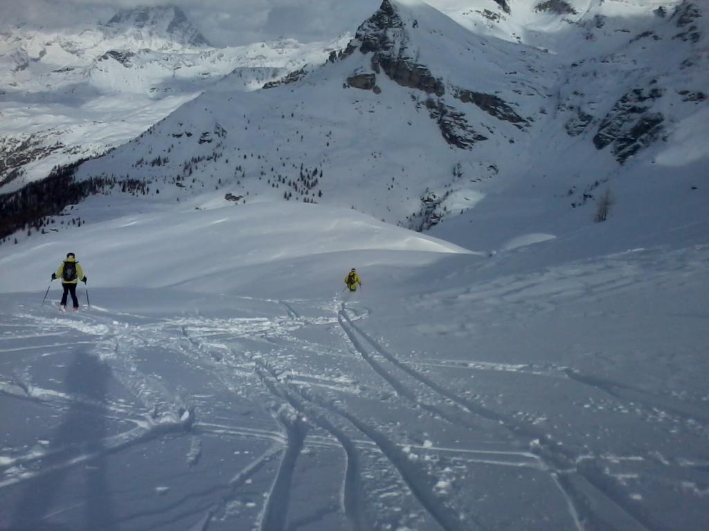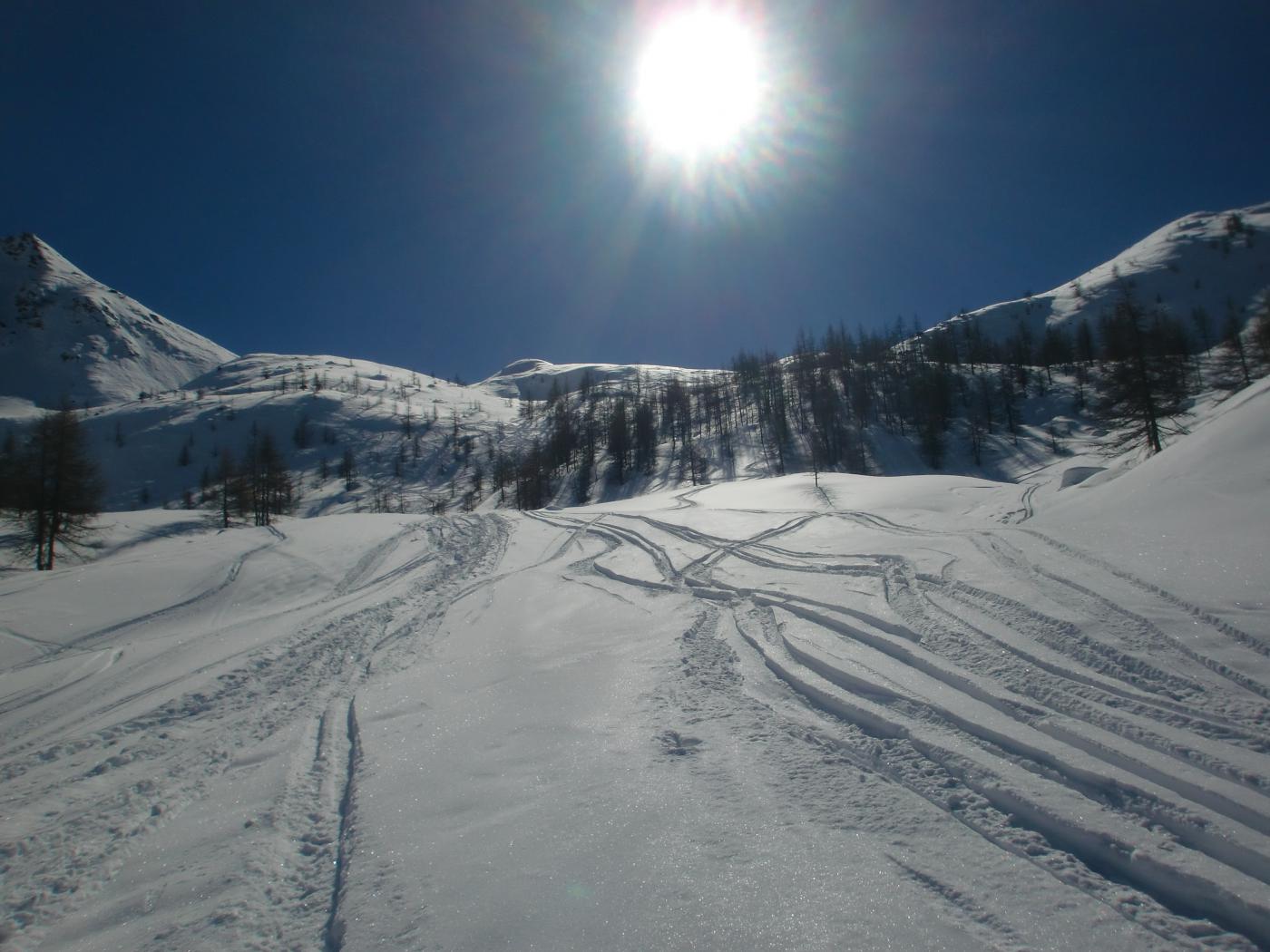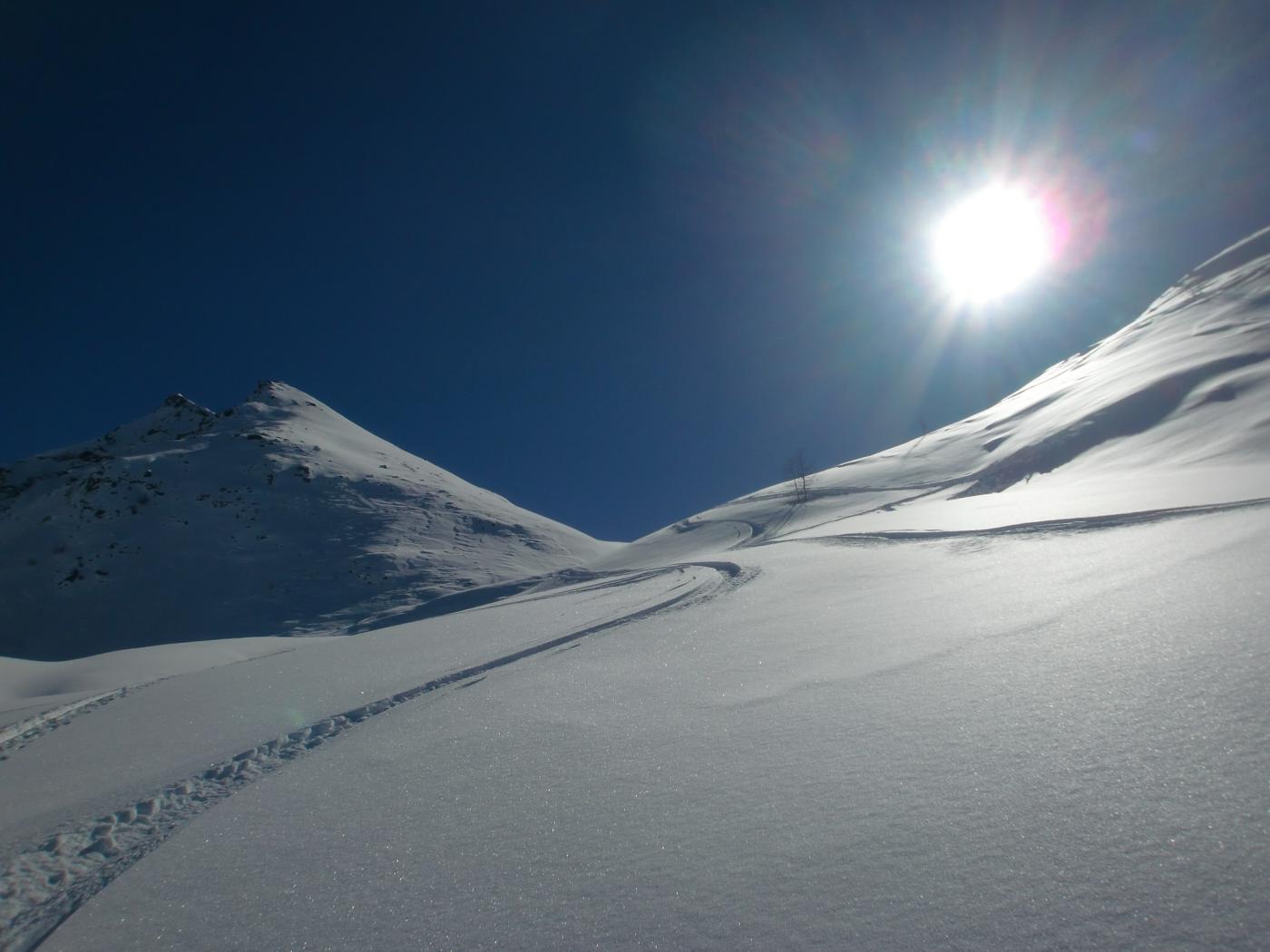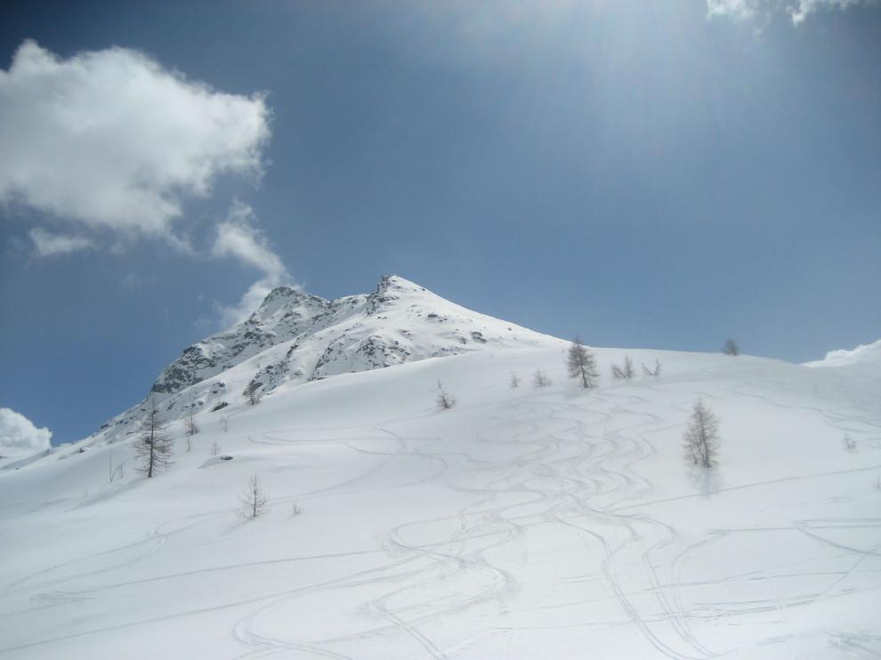 La discesa avviene per la via di salita con numerose possibilità di varianti dal Colle di Fontana Fredda fino a Cheneil.
