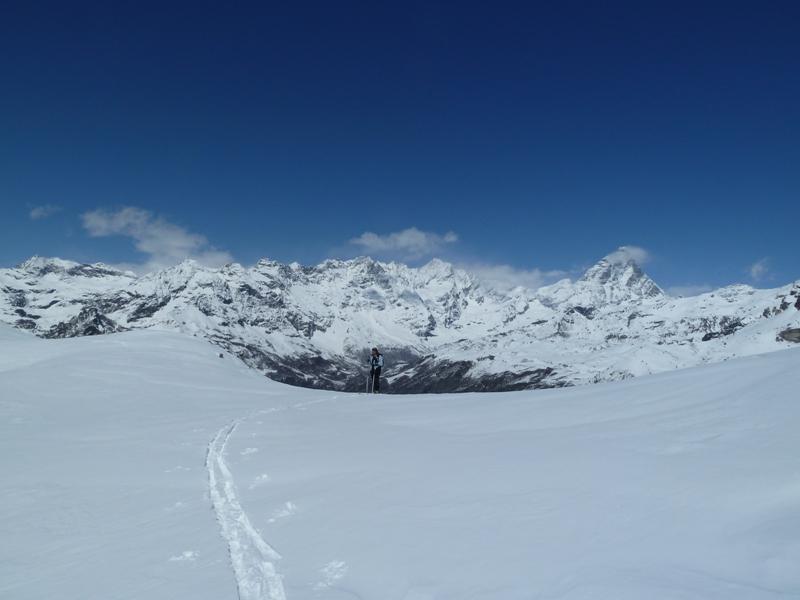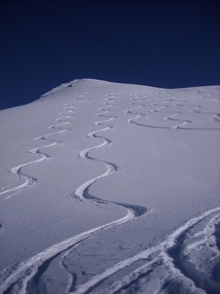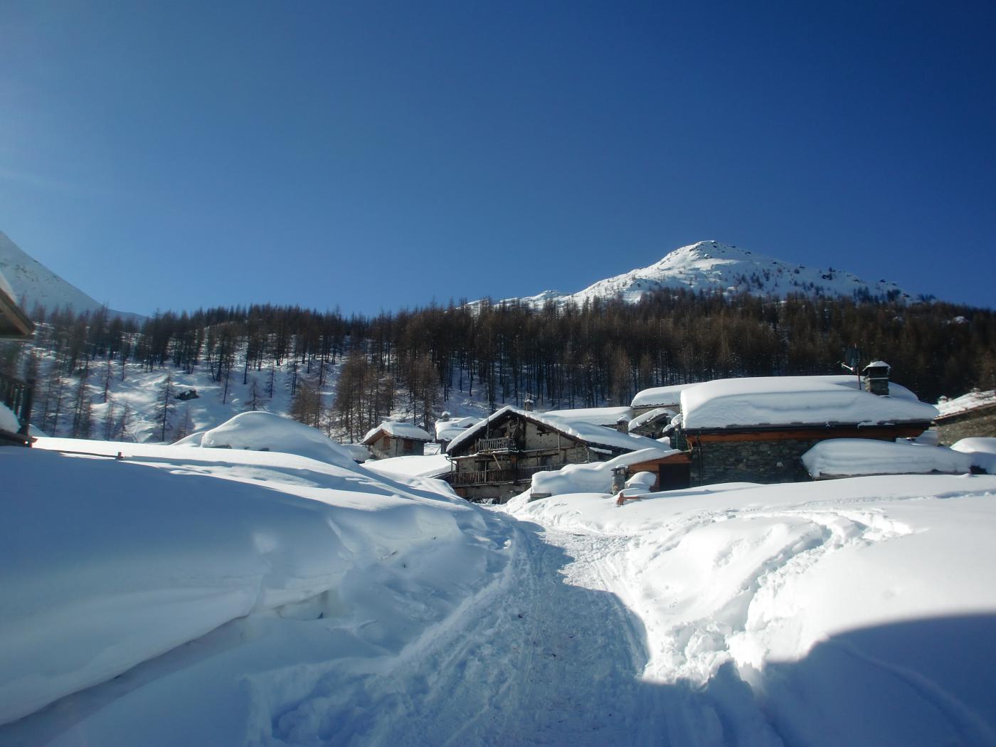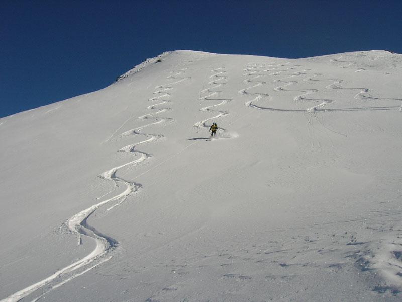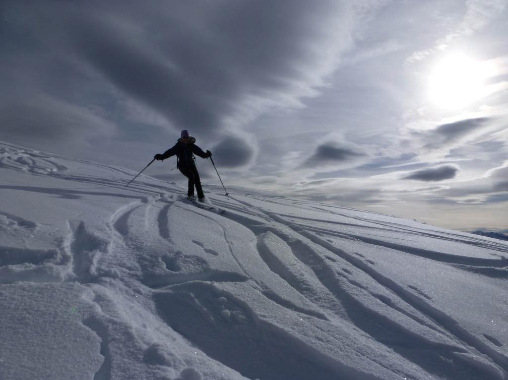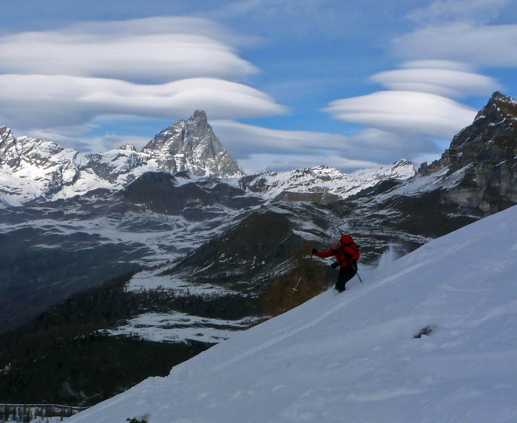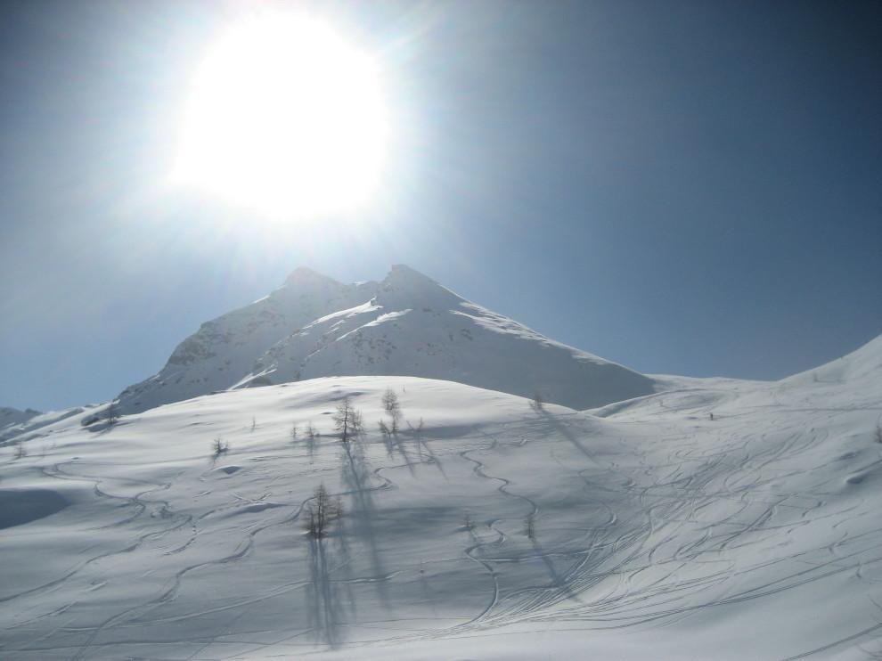 La discesa avviene per la via di salita con numerose possibilità di varianti dal Colle di Fontana Fredda fino a Cheneil.