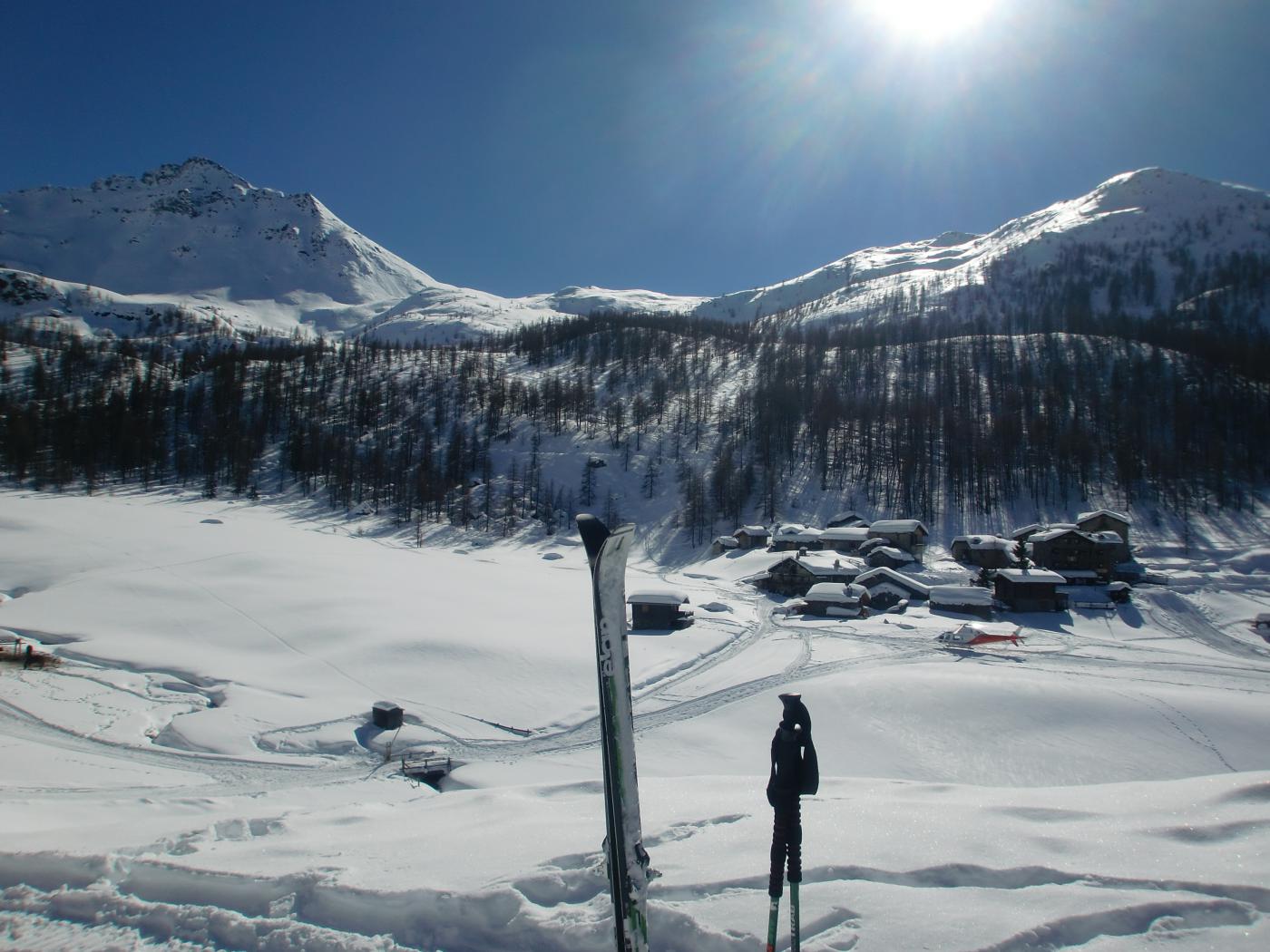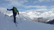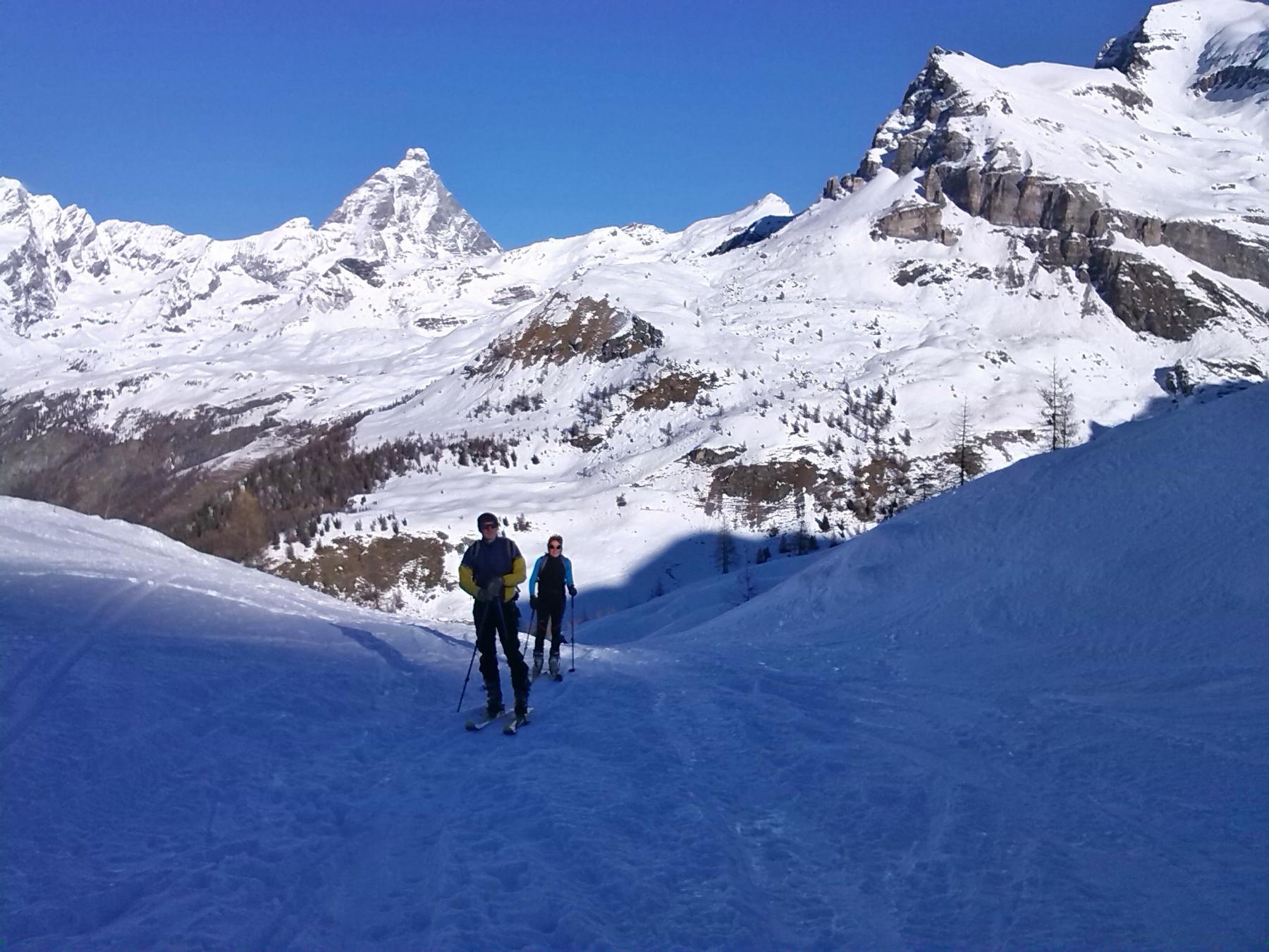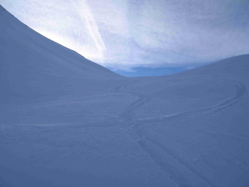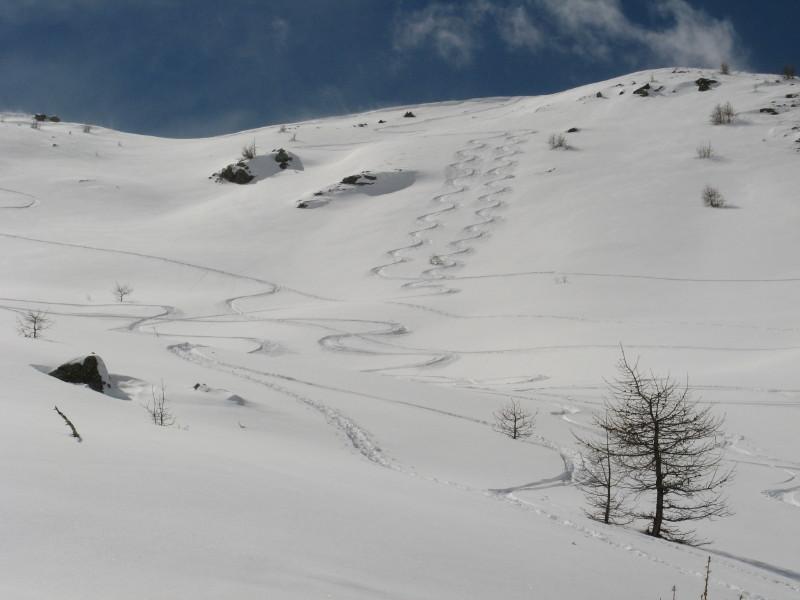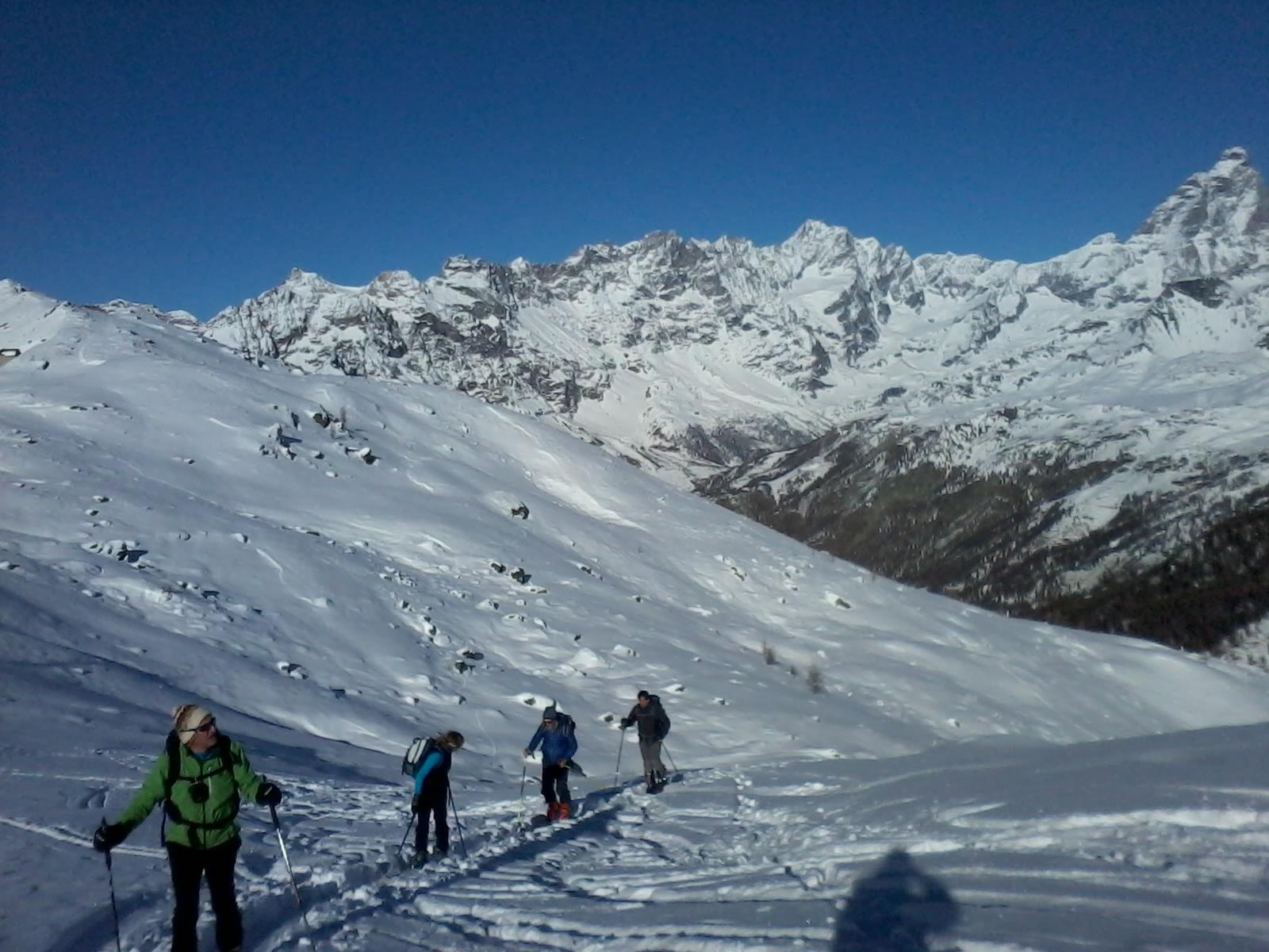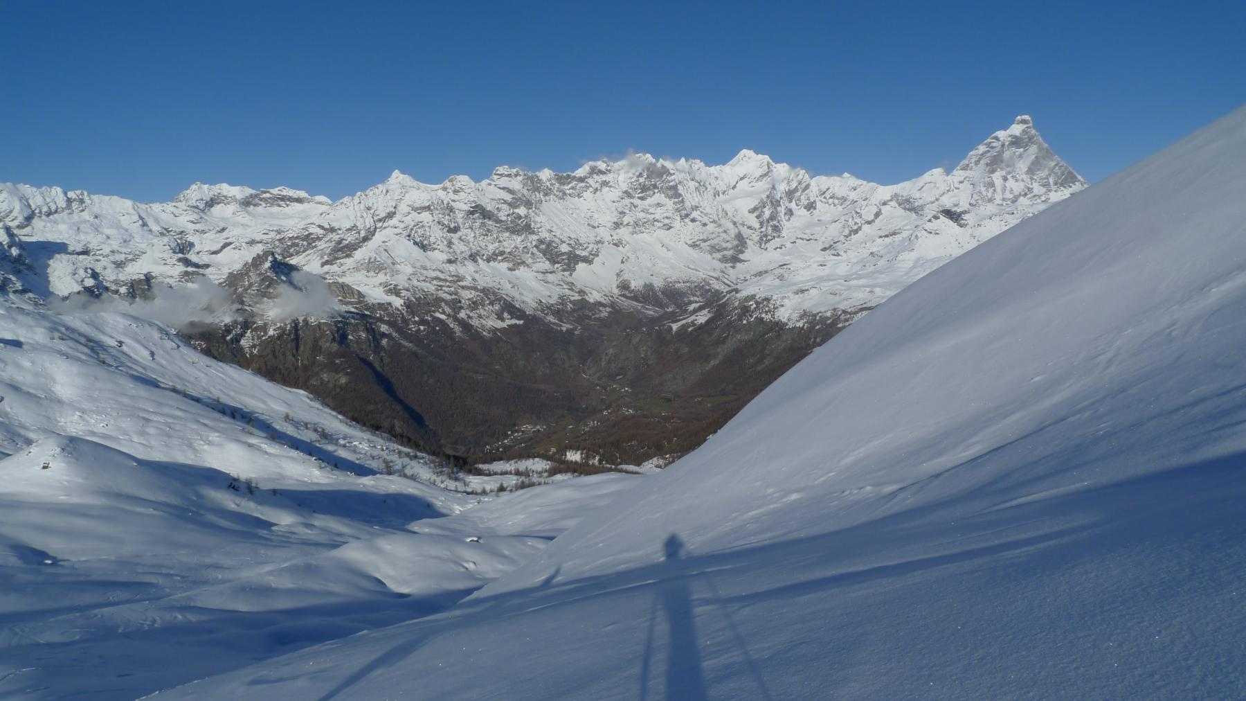 La discesa avviene per la via di salita con numerose possibilità di varianti dal Colle di Fontana Fredda fino a Cheneil.